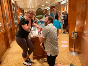 Regardez bien les photos, vous verrez que certains optent pour un deuxième café. J’ai même surpris un de mes voyageurs à jouer du piano pendant que sa dame chantait, que de talents nous avons sur ce groupe de voyageurs. En me faufilant le nez dans une boutique de bijoux, j’ai entrevu notre jeunot qui faisait la grande demande …pour une deuxième fois à Marie Pier. C’est fou ce que ça peut faire les croisières non? En montant au 11e pont, voilà que j’ai aperçu des marcheuses qui faisaient presque un …marathon. Lâchez pas le pas mesdames, « ça va bien aller ». Juste à côté, maman et papa Cournoyer eux avaient opté pour une petite sieste à l’air frais. Chut!