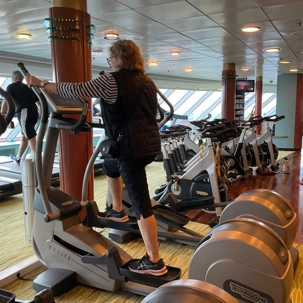 En poursuivant mon tour de navire, j’ai surpris Serge en plein travail. Pendant qu’il travaillait très fort de la moppe, Philippe sans son chapeau blanc était là à le surveiller. J’ai ouvert la porte du gym et regardez qui j’y ai retrouvé? Philippe qui suait à grosses gouttes sur son vélo d’entraînement pendant que son père Guy, se faisait aller les mollets. De son côté, Serge renforçait ses biceps et Lucie sa conjointe travaillait de ses bras en alternance. Mari Pier marchait d’un bon pas sur son tapis roulant possiblement pour être à son meilleur pour fêter sa deuxième demande en mariage, qui sait? Pour compléter leur exercice, j’ai vu deux hommes lever des poids et altères; non mais quelle fierté pour une accompagnatrice d’avoir autant d’athlètes dans son groupe. Un peu plus sérieuse, cette dernière en profite pour faire une pause yoga. Il faut bien donner l’exemple à son groupe. À chacun sa discipline.