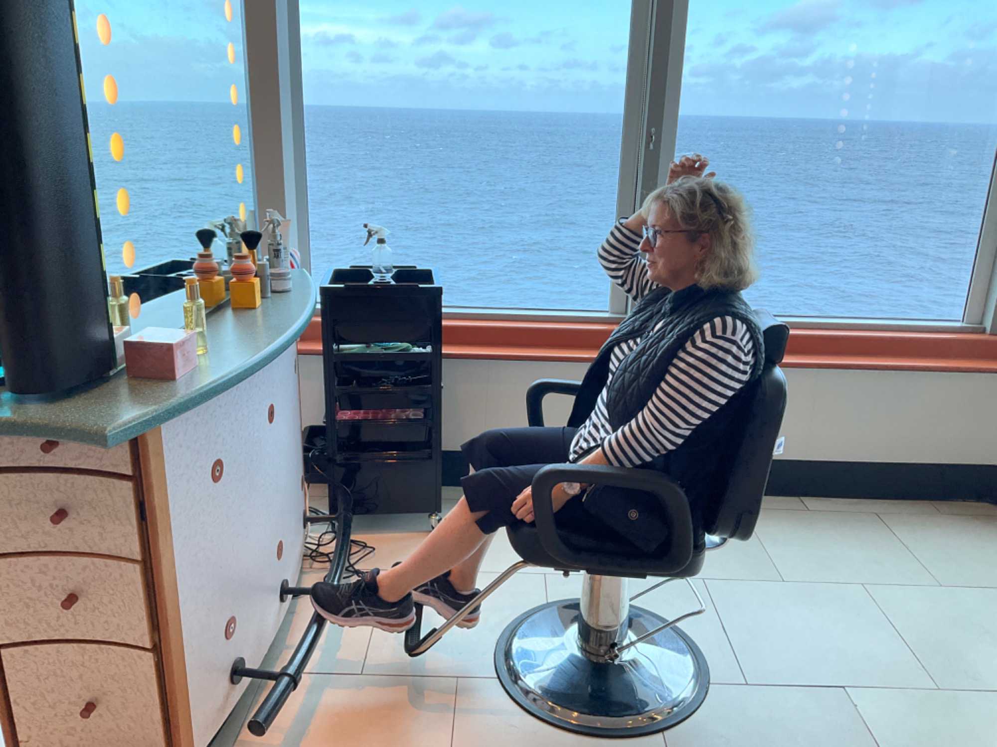 J’ai également aperçu certaines de nos dames au salon de beauté, pour un shampoing et une autre se pomponnant pour un brushing peut-être? Vous en jugerez vous-mêmes sur les photos. Pendant ce temps, les hommes jouaient aux poches, le score? D’après ce que j’ai vu, ce n’était pas des performances spectaculaires. La partie de ping pong a semblé bien courte, faut dire que le vent était de la partie. Lucie et François, pour leur première expérience en croisière préféraient vérifier le plan du navire avant de s’aventurer. Rien de mieux que de vérifier sur les affiches. Je peux vous aider peut-être?