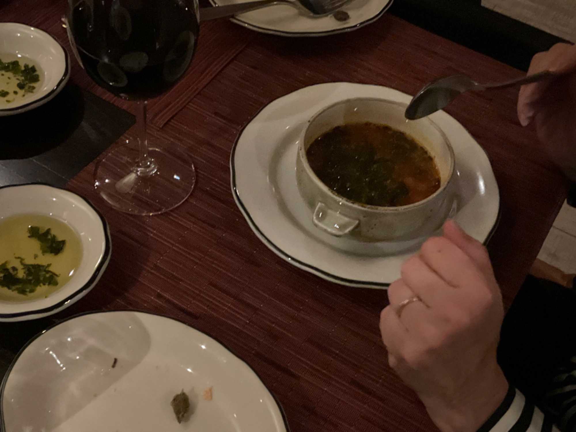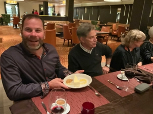 Pour la plupart d’entre nous, on a fait des italiens de nous-mêmes au restaurant de spécialités pour le souper. Dirk (pas trop italien comme nom) un des concierges du navire, italien d’origine par la mamma, originaire de Milan, est venu nous faire une surprise pour nous glisser quelques info sur l’Italie et …nous parler de la gastronomie italienne, histoire de bien comprendre le menu. Merci Dick de nous avoir replonger en Italie quelques minutes. La longue table accueillant nos 16 convives était digne d’une scène de film. Ce fut un repas exquis, gargantuesque et mémorable. L’ambiance festive qui y régnait reflétait bien la complicité de notre groupe de voyageurs. La soirée s’est terminée assez tardivement et par chance que la plupart n’avait pas à prendre “la roue du navire” car on aurait sûrement senti la houle un peu plus forte!