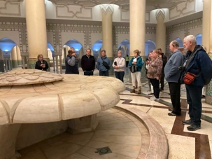 Puis on y arrive. Le coup de cœur de tout le groupe, la majestueuse mosquée Hassan II. Impossible de la manquer avec son minaret carré de 210 mètres de hauteur, le plus haut au monde, on dirait un phare carré orienté vers la Mecque. Seule mosquée ouverte aux non musulmans, elle nous laisse sans voix. Véritable œuvre d’art, l’architecture reflète l’ingéniosité et l’habileté de tous les corps de métier de la tradition marocaine. Les détails sont subtils et toujours significatifs. Les majestueux plafonds en bois de cèdre, céramique, granit, tous les matériaux viennent du Maroc (95%) excepté les 50,000 mètres carrés de marbre qui viennent de la célèbre carrière de Carrera en Italie et, les somptueux et élégants lustres dénichés à Murano, Venise. Les céramiques relèvent d’un art remarquable qui nécessite trois jours de travail le mètre carré. Le plafond de la mosquée s’ouvre en deux,(tiens, on devrait peut-être leur demander des trucs pour le toit de notre stade olympique) et fait place à 30,000 places à l’intérieur (et 80 000 à l'extérieur). Attention pas de siège, on ne s’assoit pas à l’intérieur, on prie, les pieds nus et collés. Quand vient l’heure de l’une ou l’autre des cinq prières du jour, c’est le “muezzin” qui dirige la prière dans les super microphones de la mosquée. Ce monsieur aurait été choisi pour les qualités exceptionnelles de sa voix. L’histoire ne dit pas si c’est un baryton ou un ténor! Adil nous explique les rites pour les ablutions aux fontaines, femmes et hommes séparés bien sûr.