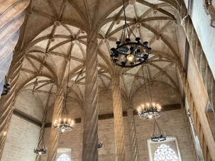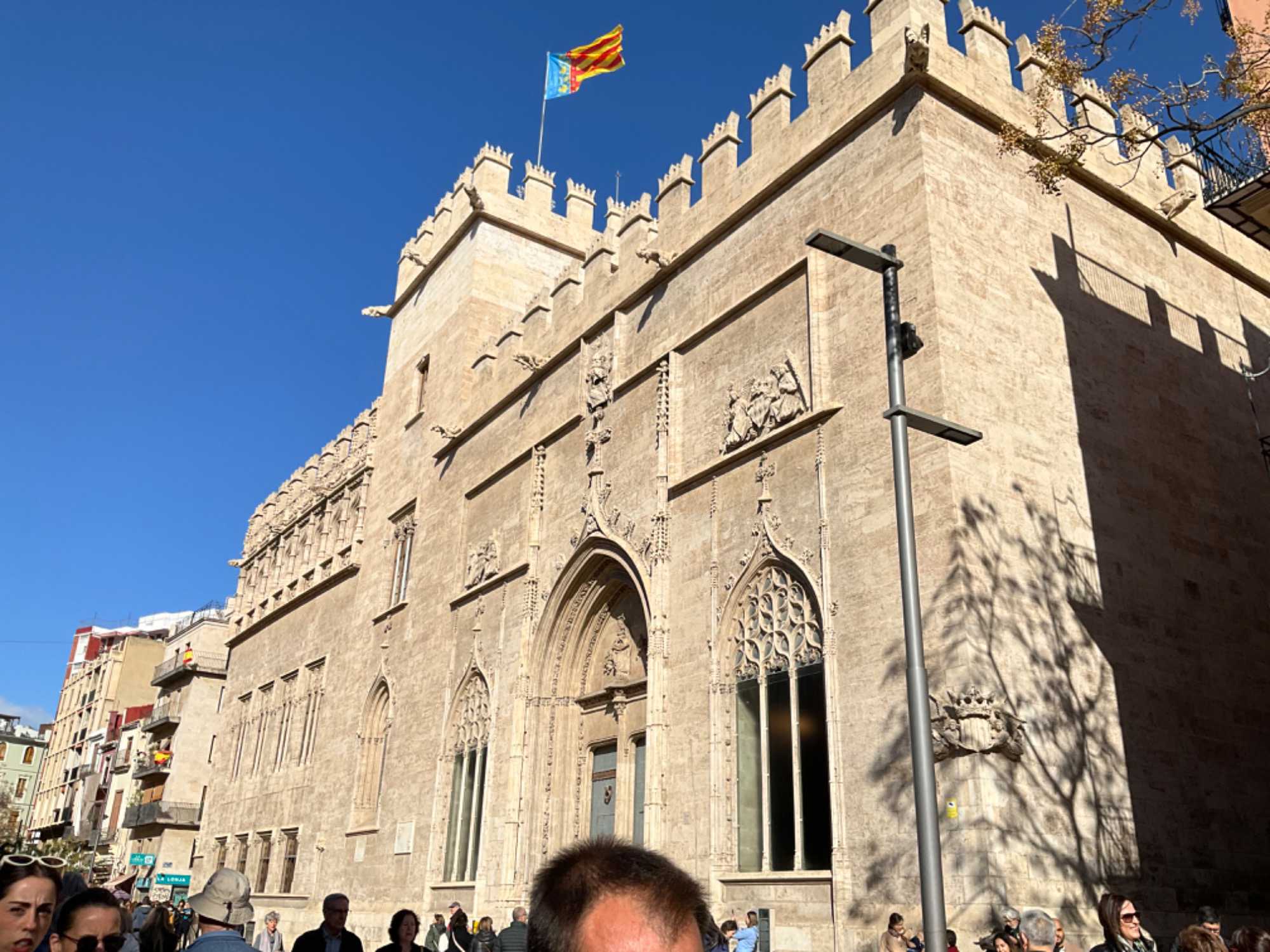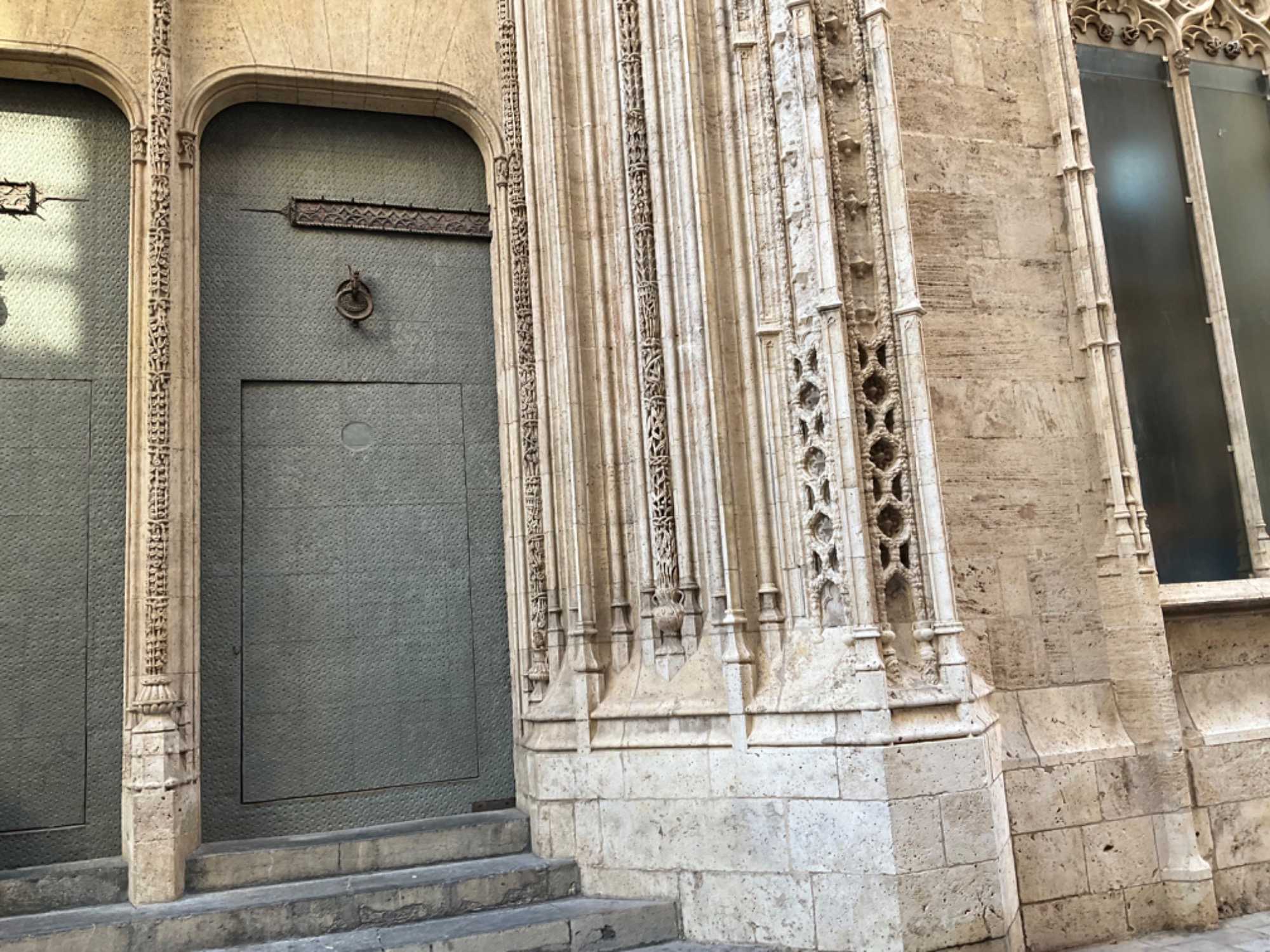 L’ensemble des bâtiments chéris des valenciens demeurent ‘’La Lonia de la Seda’’ ou, la Halle de la Soie inscrite au Patrimoine de l’humanité à l’Unesco (1996), joyau du gothique civil valencien. De la soie? Non mais on est loin de la Chine ici non? Ce sont les musulmans qui ont apporté les vers à soie et, les artisans une nouvelle façon de travailler la soie. On y marchandait également une autre matière noble : le velours. En y entrant, ses murs de pierre nous rappellent une similitude avec les châteaux médiévaux. Érigée entre 1482 et 1492, cet ensemble de bâtiments, à l’origine consacrée au commerce de la soie, d’où son nom de ‘’Bourde de la Soie’’, n’a cessé depuis de remplir des fonctions commerciales. Chacune des quatre pièces de ce chef d’œuvre du gothique flamboyant, nous rappelle la puissance et la richesse d’une grande cité marchande méditerranéenne aux XVe et XVIe siècles : la Tour, la salle du Consulat de la mer, la cour des Orangers et la salle des Colonnes. À l’intérieur, on croise une mini porte. Mais où pouvait-elle bien mener? À la prison. On monte, on descend, on parcourt les 2000 mètres carrés de ce domaine, non seulement somptueux en architecture mais flamboyant en détails de toutes sortes : céramique, colonnes torsadées, marbre, plafond à caisson en bois sculpté de 670 motifs décorés d’or, vitraux. À l’entrée, des gargouilles aux formes animales, servent à tenir les esprits éloignés. D’autres, de nature érotique, nous rappelle ce lieu, deuxième plus grand lieu de prostitution de l’Europe. Nous vous avons ramené une panoplie de photos de cette halle de la soie en signe de notre émerveillement. À vous de découvrir celles …qui vous intéressent le plus!