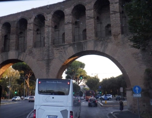 Une fois montés à bord de notre confortable autocar, les présentations faites, quelques consignes d’usage, nous roulons vers le centre-ville de Rome situé à environ 40 minutes de l’aéroport. Alessandro profite de ce moment pour nous décrire le programme de la journée. Malgré la fatigue d’une longue nuit à survoler l’Atlantique, nous sommes tous très excités de découvrir la Ville éternelle! Que dire de Mario, notre chauffeur, un vrai pro! Il faut dire que conduire à Rome n’est pas de tout repos! Bravo, Mario! Tandis que nous franchissons tranquillement les remparts des thermes de Caracalla qui entourent la ville, Alessandro nous captive avec les informations qu’elle nous dévoile sur sa ville qu’elle aime tant!