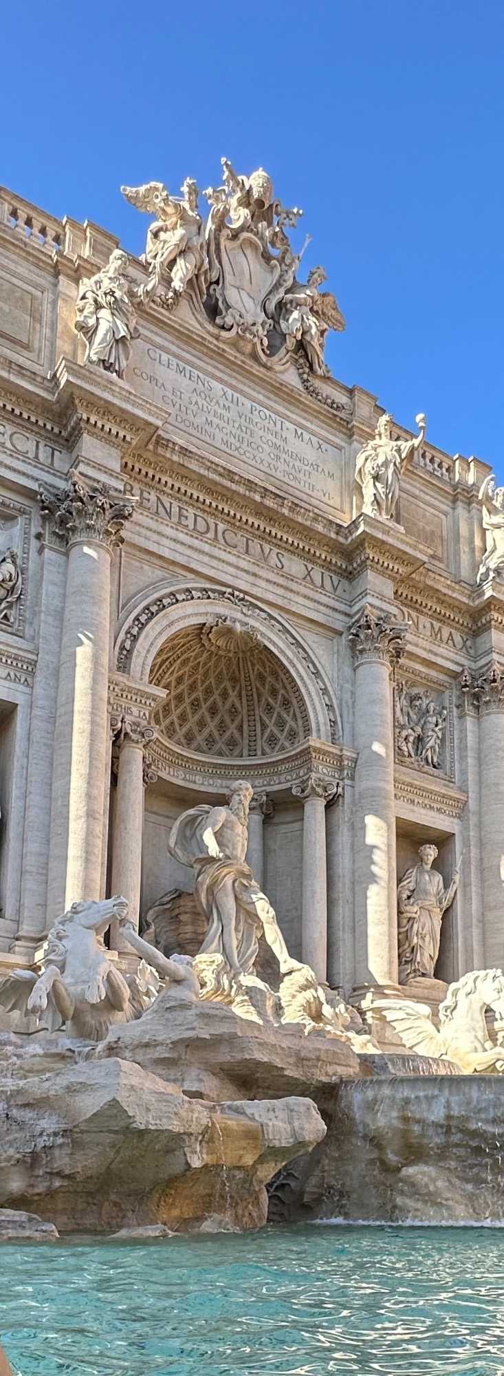 Cesare, notre guide de visite du Rome baroque, nous garde le bijou de la Fontaine de Trevi pour la fin. Nous ne serons pas déçus malgré la horde de touristes venus comme nous admirer cette fontaine qui se passe de présentation ! Elle est monumentale!! Achevée en 1762, elle est adossée à l’arrière du palais Poli (duc de Poli). Elle est une allégorie de l'océan avec, en son centre, Neptune se tenant sur un char en forme de coquillage, tiré par deux chevaux marins, l’un représentant l'eau violente et l’autre, l'eau calme. Ils sont guidés par deux tritons (Dieu marin grec, messager des flots). Comme la tradition le veut, pour s’assurer de revenir à Rome, on doit tourner le dos à la statue et y lancer une pièce de monnaie par le bras droit! Saviez-vous que chaque jour, environ 3000 € se trouvent quotidiennement au fond de cette fontaine? Chaque matin, avant l'arrivée des touristes, la circulation de l'eau est coupée. La fontaine est nettoyée à la brosse et les pièces sont rassemblées en un long serpent, à l'aide de longues perches, et récoltées par aspiration, sous la surveillance de la police. L'argent collecté est remis à des organismes de charité.