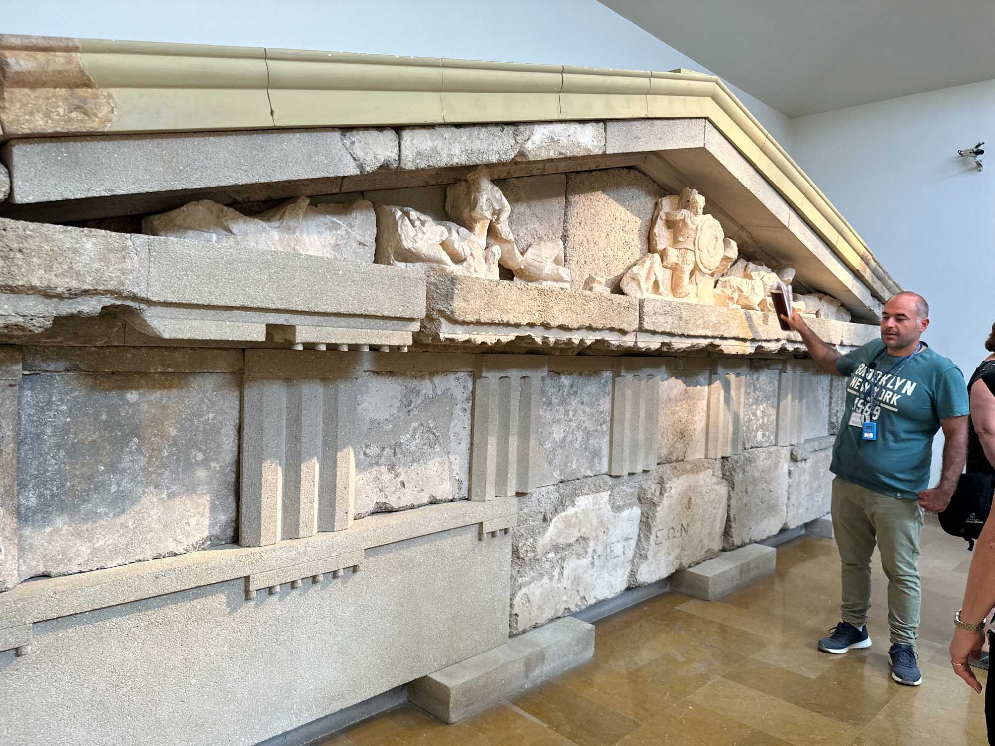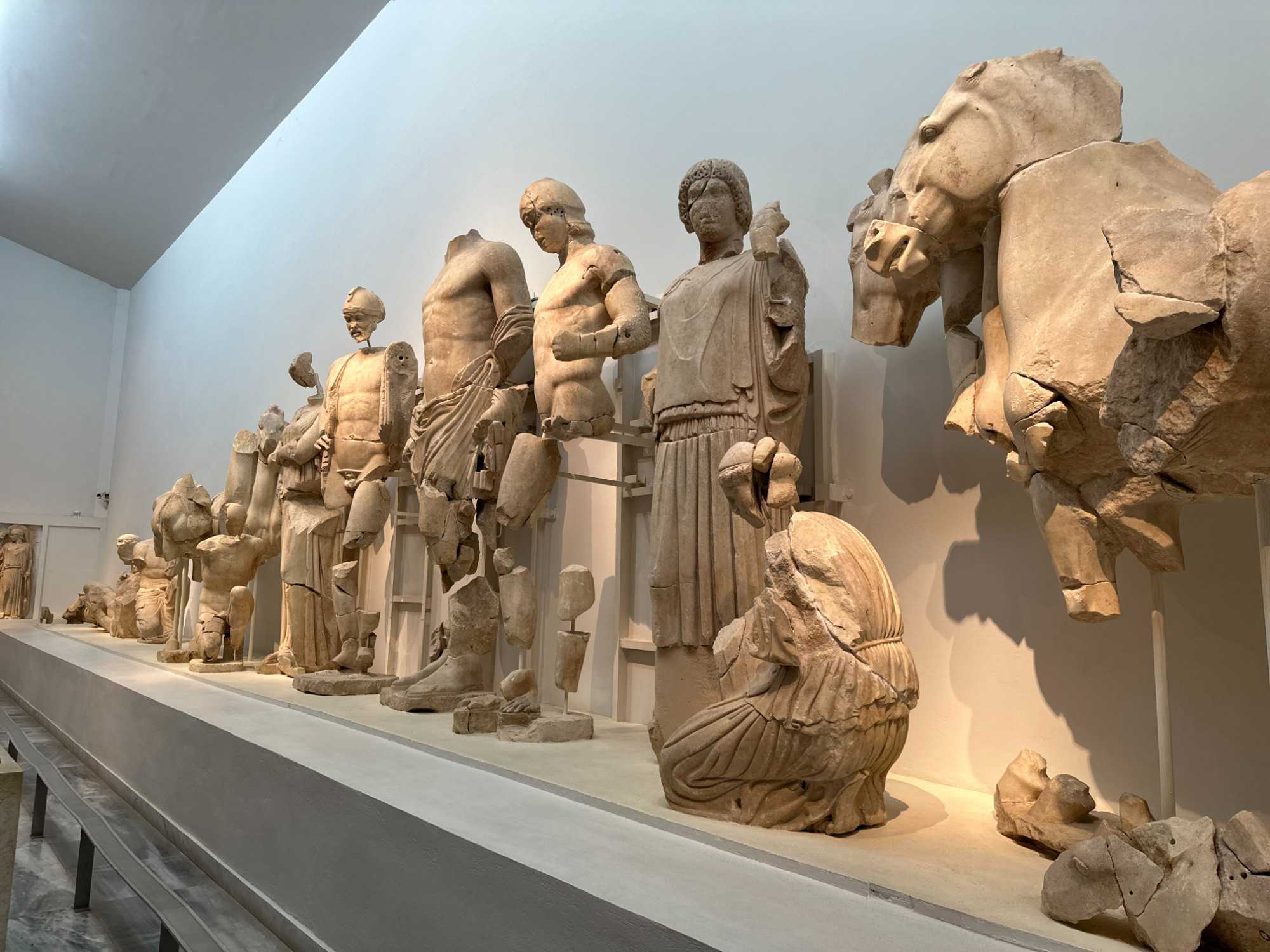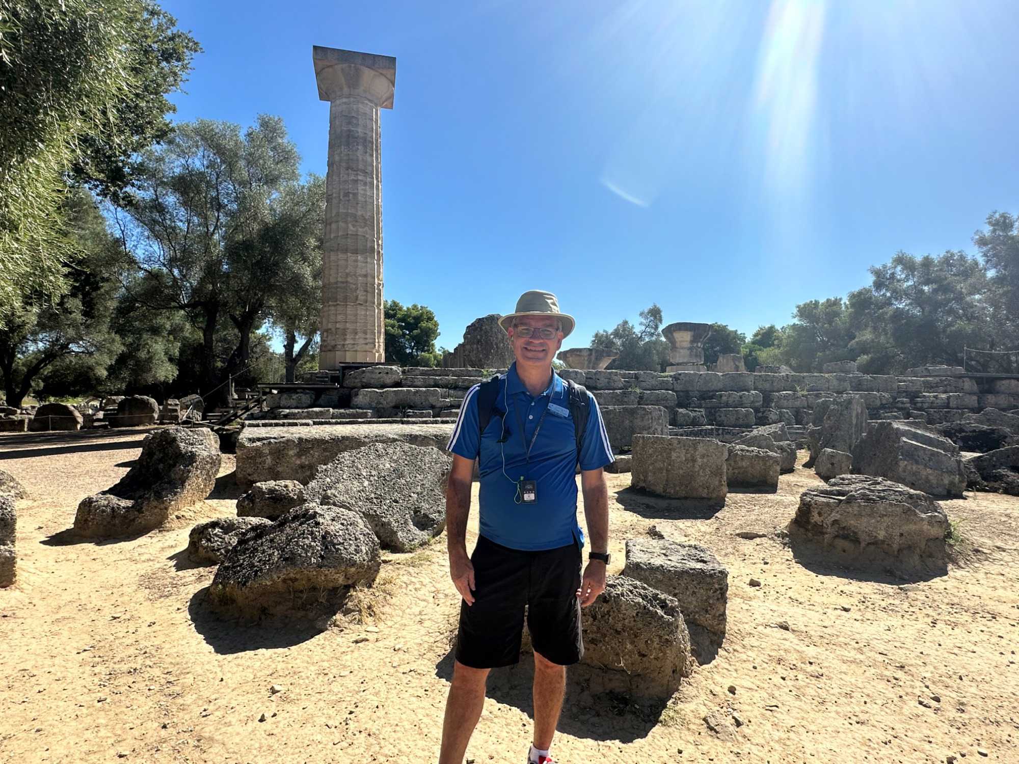 Quelle belle visite, si instructive et enrichissante. Notre guide Mario (nous doutons que ce soit son vrai nom!) est une mine d’information à lui seul et n’a pas été avare de ses enseignements durant ces 5 heures! Il est d’ailleurs archéologue et a fait une des importantes découvertes de ce site. Mais ça ne se terminait pas là ! Nous avons même eu droit à la visite du musée d’archéologie qui nous a permis de compléter notre incursion dans ces temps anciens où des pièces millénaires ont été découvertes. Vases, urnes funéraires, armes en bronze en métal, armures, boucliers, fresques, statues, sculptures et reconstitutions d’objets de l’antiquité grecque. Nous nous sentons privilégiés d'être témoins de la découverte de ces vestiges millénaires qui sont à l’origine d’une tradition encore bien vivante aujourd’hui. Et comme la météo se fait radieuse et nous dévoile un ciel d’un bleu intense, on se sent imprégnés de l’atmosphère mythique d’Olympie! Nous retournons à bord pour se rafraîchir, se reposer un peu avant un copieux repas et l’échange de nos commentaires sur ces merveilles du passé !