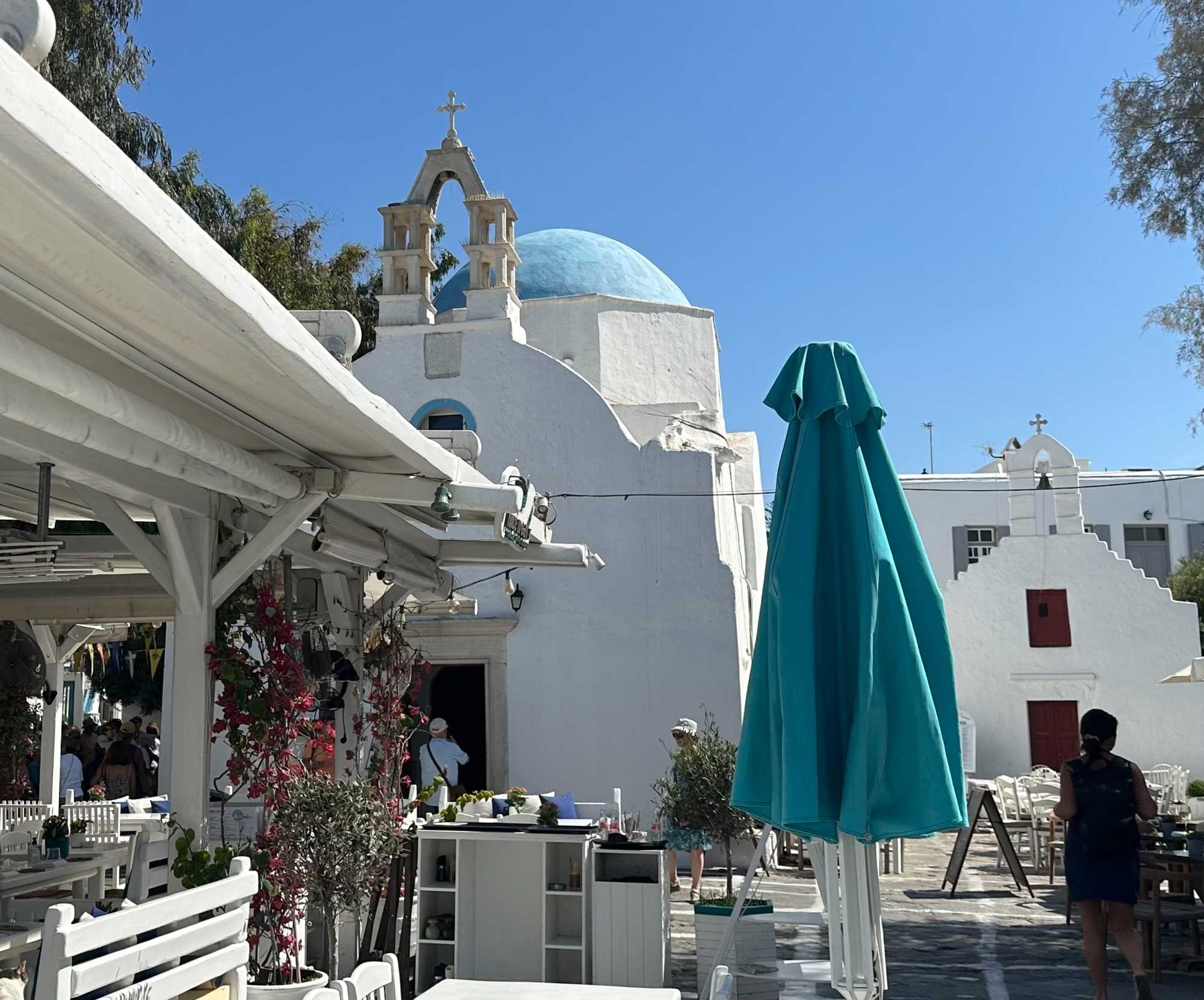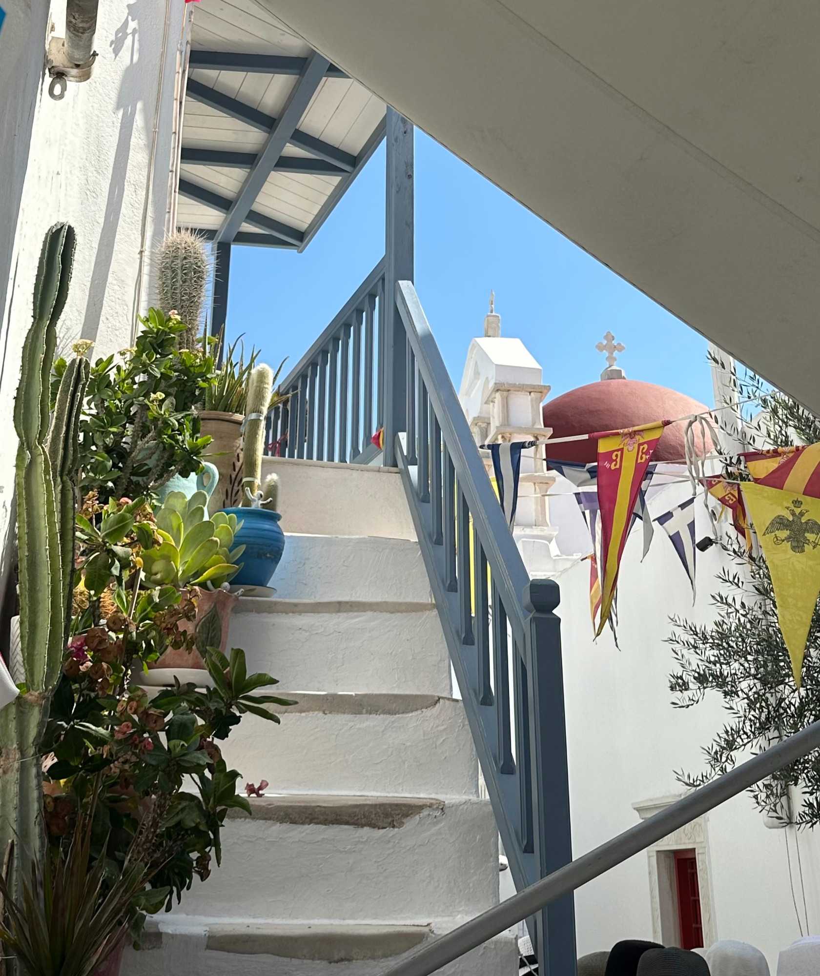 En faisant notre tour d’orientation à travers les ruelles tortueuses du vieux village et de la "petite Venise", nous arrivons rapidement à l'église Paraportiani, qui est un autre des points de vue de Mykonos. L'église Paraportiani est en réalité composée d'un assemblage de 5 églises de confession différentes. C'est l'un des bâtiments les plus photographiés de Mykonos, et la blancheur de ses murs contraste de façon saisissante avec le bleu du ciel et de la mer.