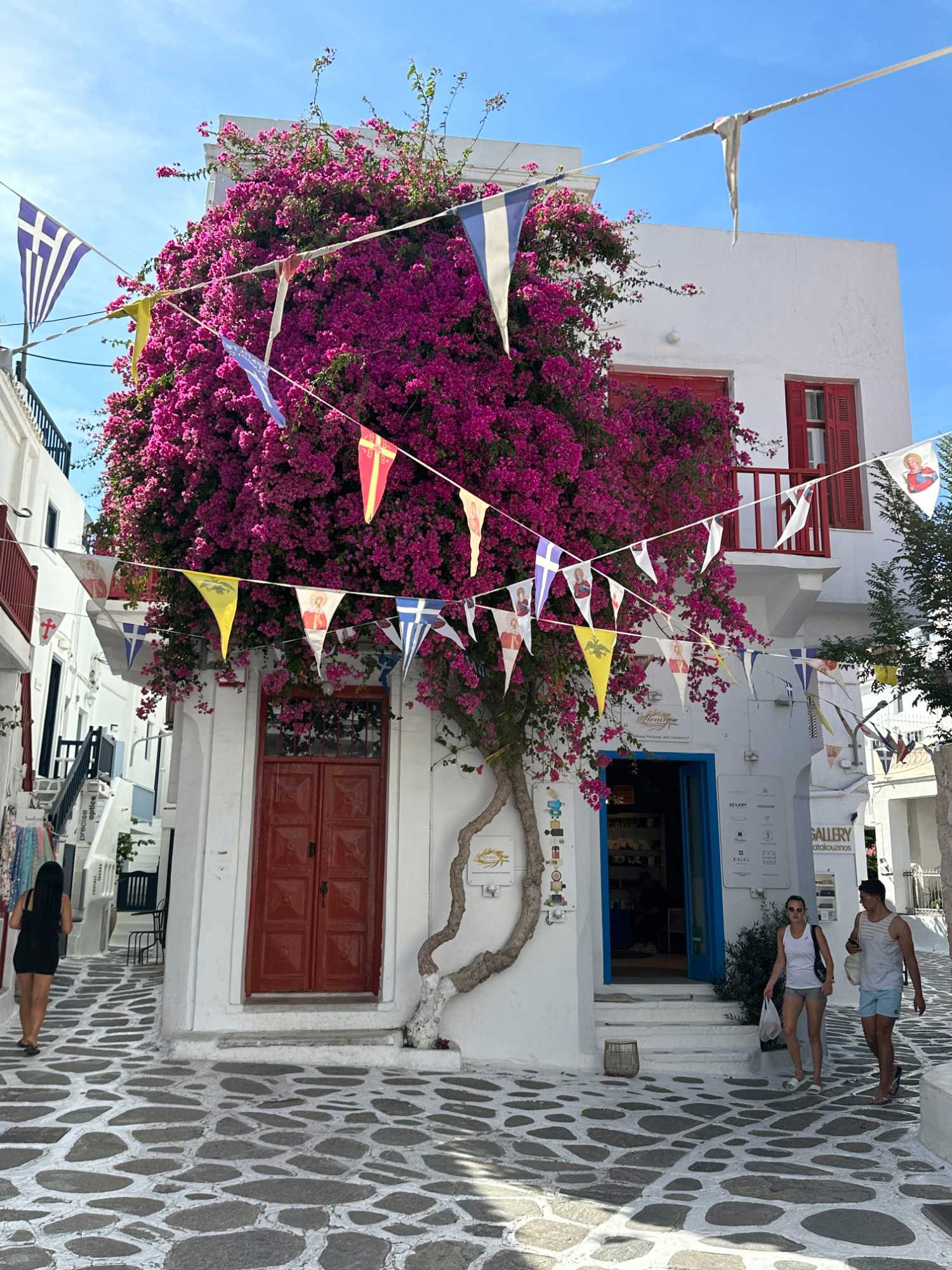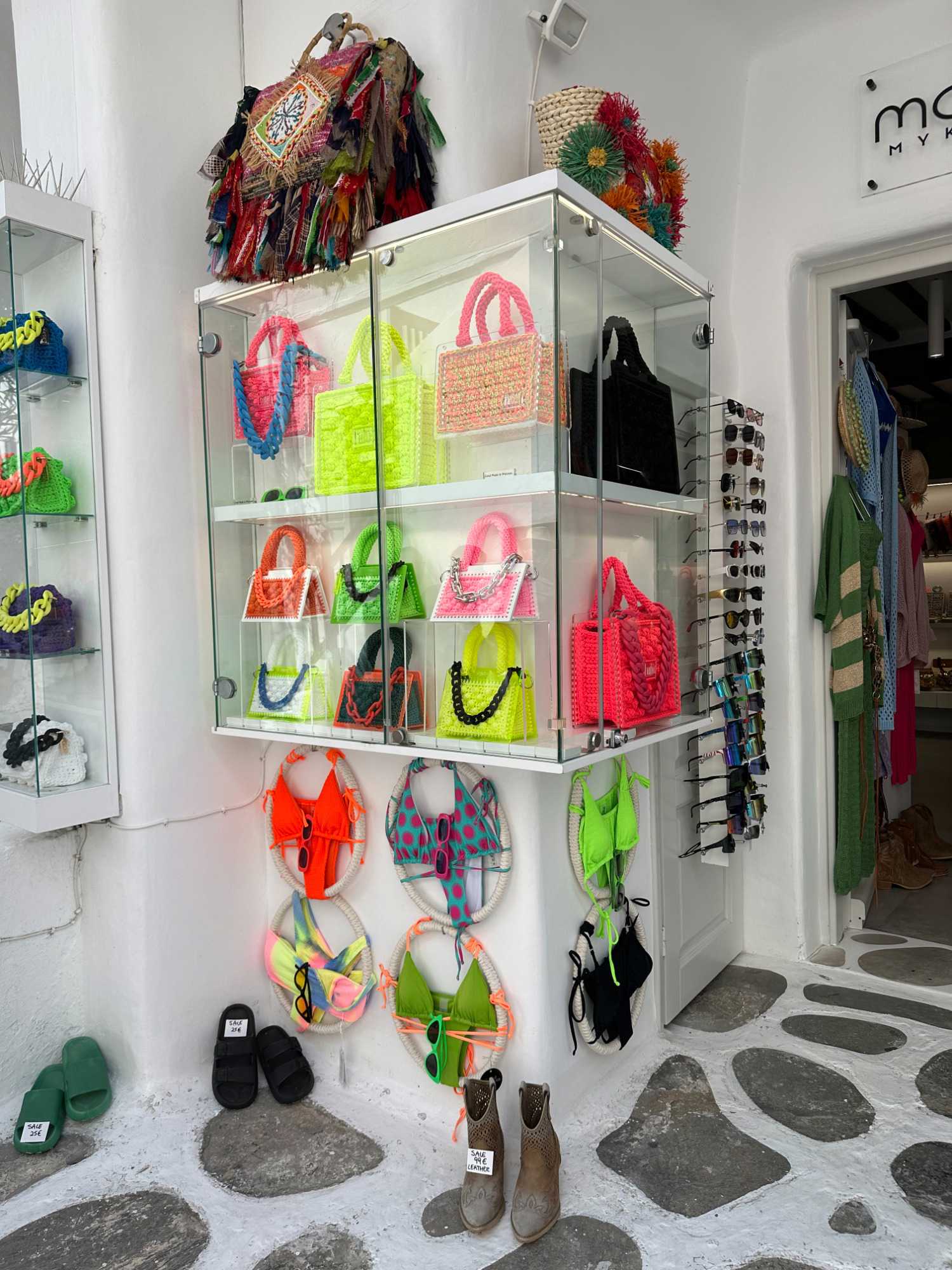 Pour l’architecture: on remarque dans toute l'île, de petits cubes blancs, d'un seul étage le plus souvent, répartis dans le paysage comme de petits glaçons. On accède à chaque maison par une série de marches abruptes, parallèles à la rue, sous lesquelles l'espace servait autrefois de cellier. En haut des marches, on trouve un petit balcon de bois peint qui surplombe la rue étroite et touche quasiment le balcon correspondant de la maison d'en face. Les parties en bois des maisons de la ville de Mykonos sont peintes de toutes les couleurs de l'arc-en-ciel, et le contraste avec les murs blancs à la chaux et le bleu du ciel est absolument superbe.