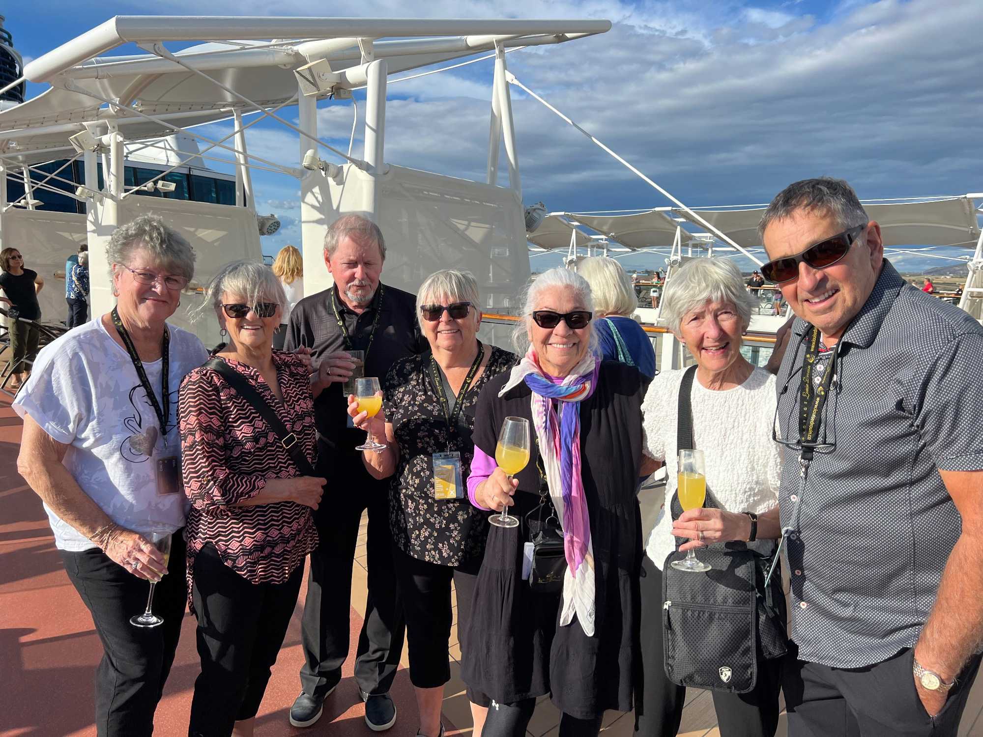 La température est très agréable et le soleil est présent toute la journée. Le vent est quand même un peu frais. On s’est regroupé sur le pont supérieur pour le Sail Away party, un petit verre à la main… Puis on admire le navire qui file vers le large. Et c'est parti ! À nous les vacances ! Tout le monde est souriant et tous sont contents de vivre cette belle croisière en Méditerranée.