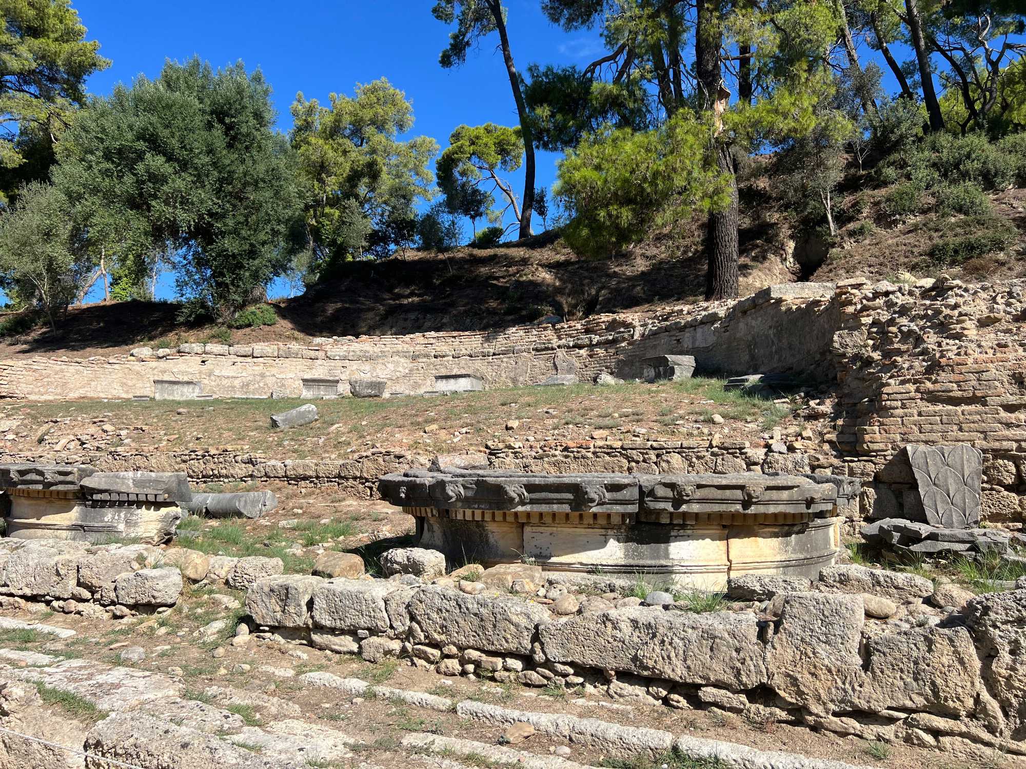 Le stade antique, l’un des sites archéologiques les plus remarquables, est le lieu où se déroulaient les Jeux Olympiques dans l’antiquité et les concours Héraia, dédiés à la déesse Héra. Le stade a adopté sa forme actuelle au début du Vè siècle av. J.-C., quand le temple de Zeus a été construit. La région comprend des bâtiments abritant des bains et des villas, comme la villa construite par Néron quand il résidait à Olympie afin de participer aux Jeux. Quand le christianisme fut décrété religion officielle de l’empire romain, les Jeux Olympiques ont progressivement perdu de leur importance car désormais considérés comme une fête païenne. Finalement, en 393 après J.-C., l’empereur les interdit. Depuis, le site d’Olympie n’a jamais retrouvé la grandeur et la gloire dont il bénéficiait lors de l’organisation des Jeux Olympiques.