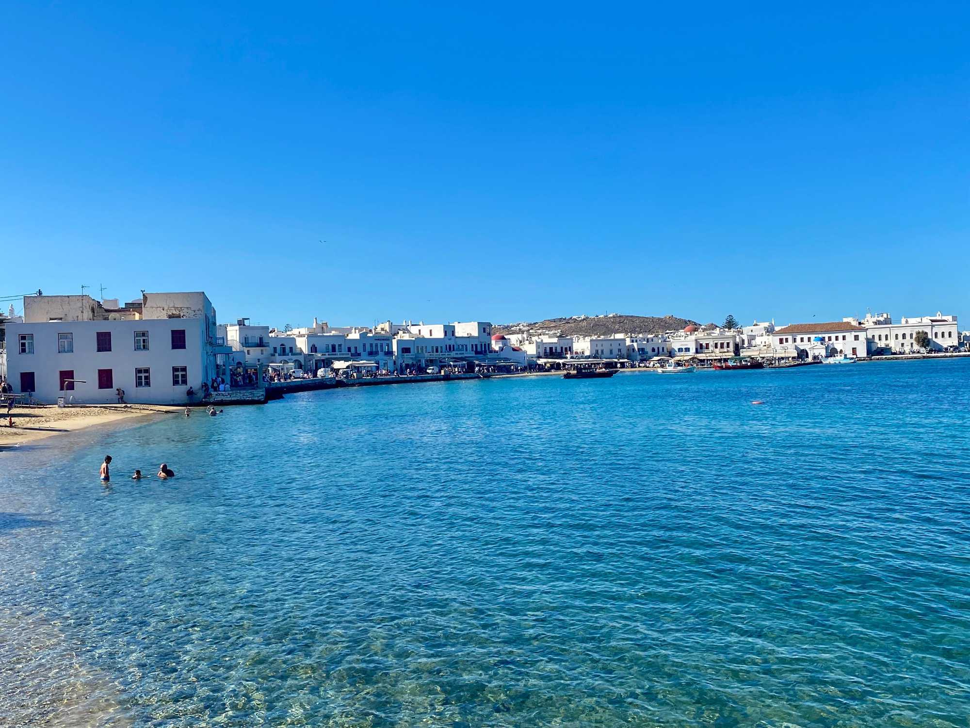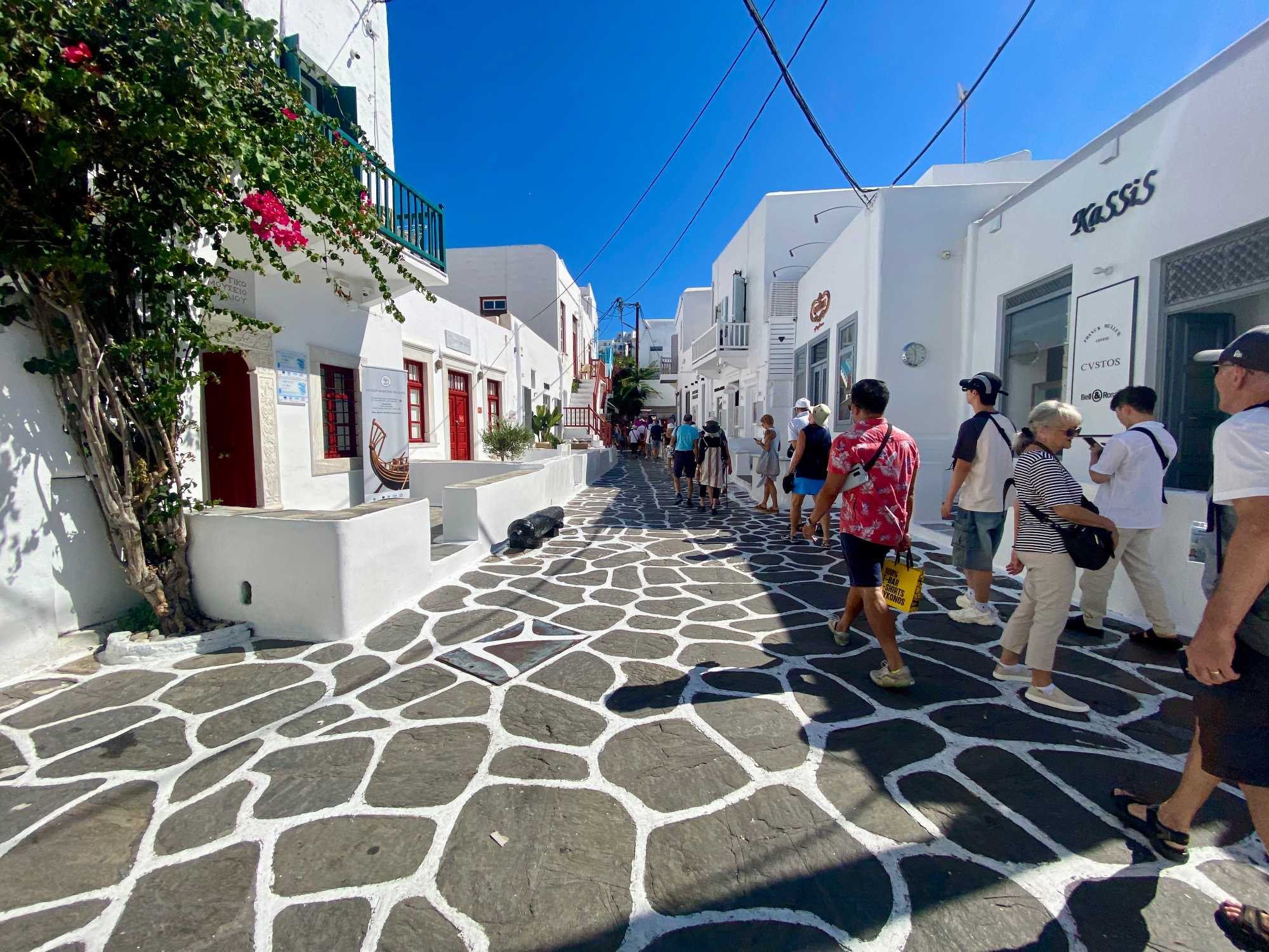 Vedette incontestable du tourisme en Grèce, Mykonos ne l’est pas par pur hasard. Son village éclatant de blancheur, coiffée de ses célèbres moulins à vent, ses plages paradisiaques dont nous avons nous vu un superbe exemplaire et son atmosphère unique sont la recette de son succès. Ses ruelles forment un labyrinthe destiné à l’origine à perdre les pirates, mais qui maintenant fait le bonheur des visiteurs prêts à s’y perdre pour mieux se retrouver. Le port garde une étonnante activité traditionnelle avec ses pêcheurs qui vendent leurs poissons frais sur les quais. De nombreux magasins de luxe ont pignon sur rue et attirent les touristes heureux de dépenser. Le quartier de « la petite Venise » est un endroit particulièrement romantique au coucher du soleil. Avec près d’un million de visiteurs chaque année, l’île est sans contredit la destination phare du pays.