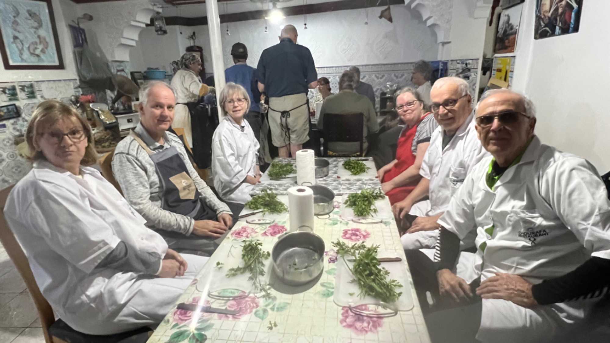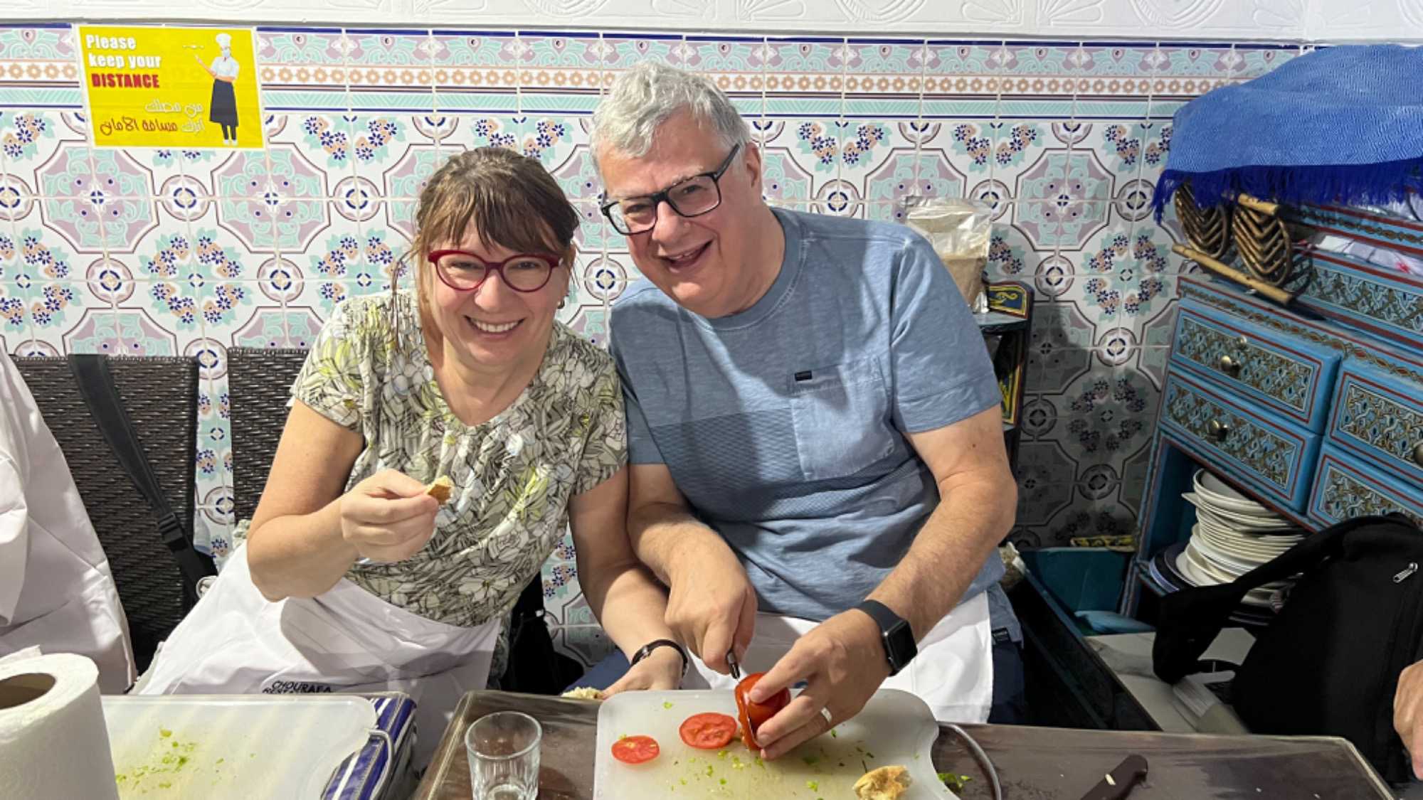 Nous partons de notre hôtel pour aller rejoindre notre chef Saïd à son Riad où il nous fait voir le four à pain du quartier et nous explique son fonctionnement. Ici, la coutume veut que les gens du coin fassent leur pain chez eux et pour quelques dirhams, ils viennent le faire cuire au four communautaire. On y fait cuire du pain, mais aussi on y fait griller des légumes tels que poivrons grillés, aubergines, etc. Nous suivons notre chef Saïd à son restaurant après avoir fait nos courses sous ses conseils. Partis de rien, nous avons choisi les légumes, les épices, les fruits et la viande, soit tout ce qu’il faut pour faire un tajine d’agneau aux pruneaux accompagné d’une salade de légumes froide et de fruits de saison. Ce ragoût longuement braisé mijote dans un récipient nommé tajine. Au-dessus d’une assiette se dresse un couvercle de forme conique qui emmagasine la vapeur dans le haut et qui la redistribue sous forme de liquide condensé, donnant à la viande une texture extrêmement tendre. Nous avons mangé avec appétit ce bon repas préparé de nos mains, c’était tellement bon ça goûtait le ciel, comme on dit. Je ne peux même pas vous décrire à quel point nous avons eu du plaisir et des fous rires et que dire des arômes de cette expérience! Toutes et tous ont travaillé fort, sauf moi qui prenais les photos pour votre plus grand bonheur. Un simple coup d’œil devrait vous mettre l’eau à la bouche!