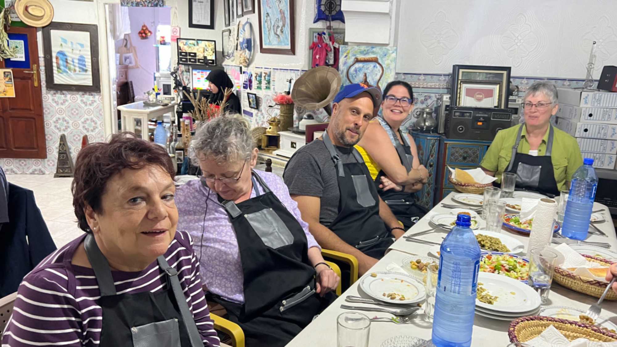Nous quittons notre hôtel pour aller rejoindre notre chef cuisinier, Saïd, à son restaurant pour voir notre futur plan de travail. Toutefois, surprise! Said est en vacances, mais il a eu la gentillesse de tout prévoir avant son départ en nous confiant aux bons soins d’un autre chef, Amanellah, tout aussi gentil, compétent et motivant comme j’ai pu le constater rapidement. Nous allons d’abord faire nos courses sous ses conseils. Au marché, croulant sous les étales, que des produits frais. Nous choisissons des légumes aux couleurs chaudes et variées, les épices qui se déclinent en cumin, coriandre, cannelle, poivre noir, paprika fumé, clou de girofle et piment harissa, enfin la viande d’agneau et des fruits séchés, soit raisins et pruneaux et des fruits frais. Nous avons maintenant tout ce qu’il faut pour faire notre tajine d’agneau aux pruneaux accompagné d’une salade de légumes froids et d’une salade chaude et pour finir le tout en beauté quelques fruits de saison comme la nèfle que nous n’avons pas chez nous. Je ne peux même pas vous décrire à quel point nous avons eu du plaisir et des fous rires et que dire des arômes de cette expérience! Toutes et tous ont travaillé fort, sauf moi qui prenais les photos pour votre plus grand bonheur. Un simple coup d’œil devrait vous mettre l’eau à la bouche!
