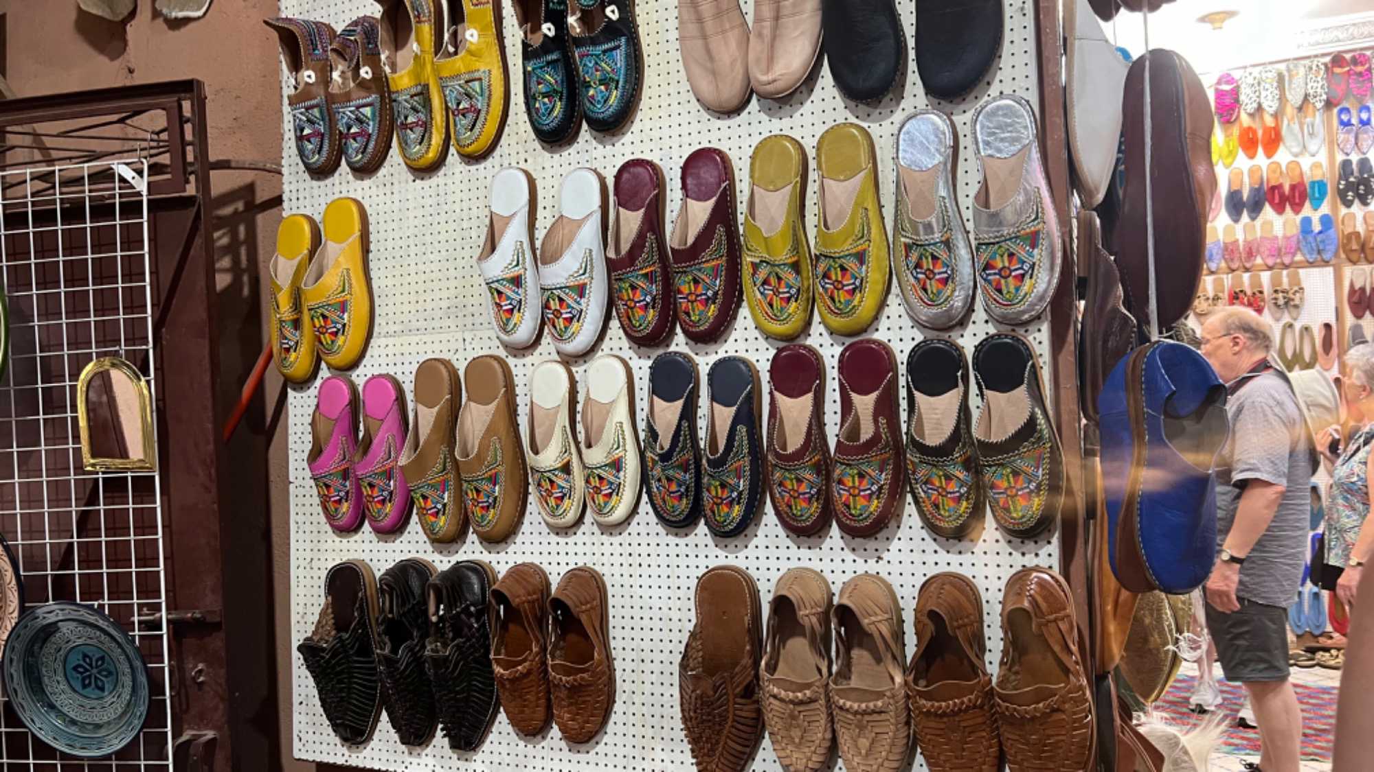Après le diner, nous retournons à la médina pour finaliser notre visite et fureter dans tous les recoins pour trouver LE trésor qu’on voudra absolument rapporter au Québec à cause de son unicité et sa rareté chez nous. C’est vraiment intéressant de voir la déclinaison des métiers et des artisans que l’on croise dans la médina. Que de talents s’exposent sous nos yeux! Toutefois, la température nous accable un peu, ouf! Il fait chaud, chaud, chaud : 36 degrés! Mais la visite en vaut la peine! C’est véritablement fascinant de voir le travail de maestro des maroquineries qui déclinent le cuir de mille manières, du plus fin au plus robuste, selon les usages qui en seront faits : sacs, mallettes, souliers, babouches, abat-jour pleins ou ajourés, ouf! Dommage qu’on doive se limiter dans les bagages pour le retour, car certains auraient fait de petites et grosses folies, je vous le dis.