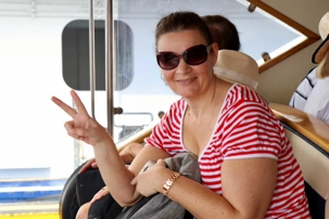 Nous y parvenons enfin et sommes ravis par le paysage qui se dévoile sous nos yeux. Wow que c'est beau! Les frustrations de l'attente se dissipent laissant place à un total dépaysement. Mais c'est la journée des imprévus, que notre accompagnateur Martin sait gérer d'une main de maître; le retard accumulé a fait en sorte que la dame qui devait nous accueillir à la sortie des cabines pour nous servir de guide n'est pas au rendez-vous... Il faudra se débrouiller. Mais quel groupe nous sommes! Nous faisons ensemble vraiment une bonne équipe! Martin nous conduit au bus comme s'il avait une résidence secondaire à Santorini, (pas pire que Michel qui a une villa à Rome).
