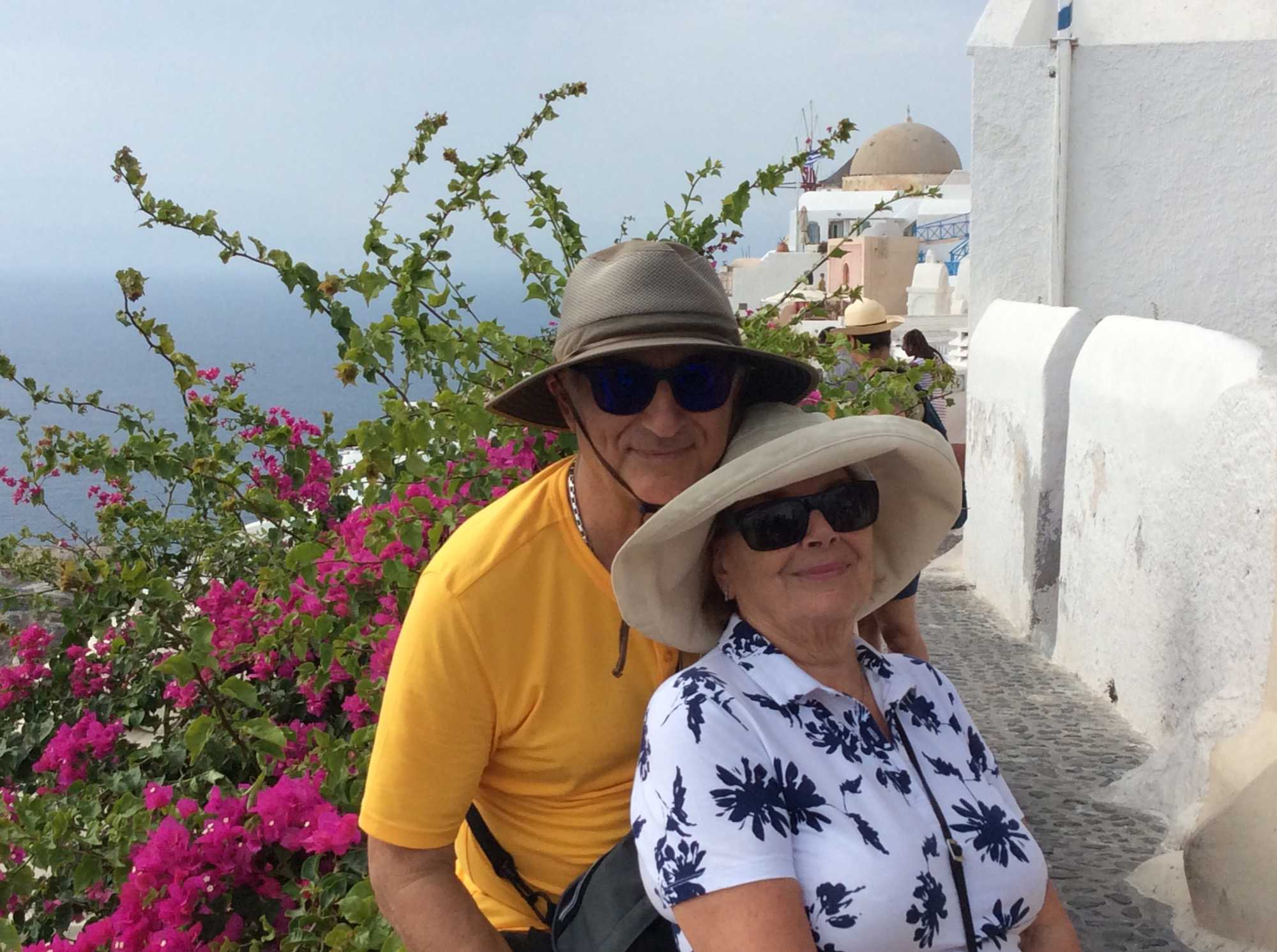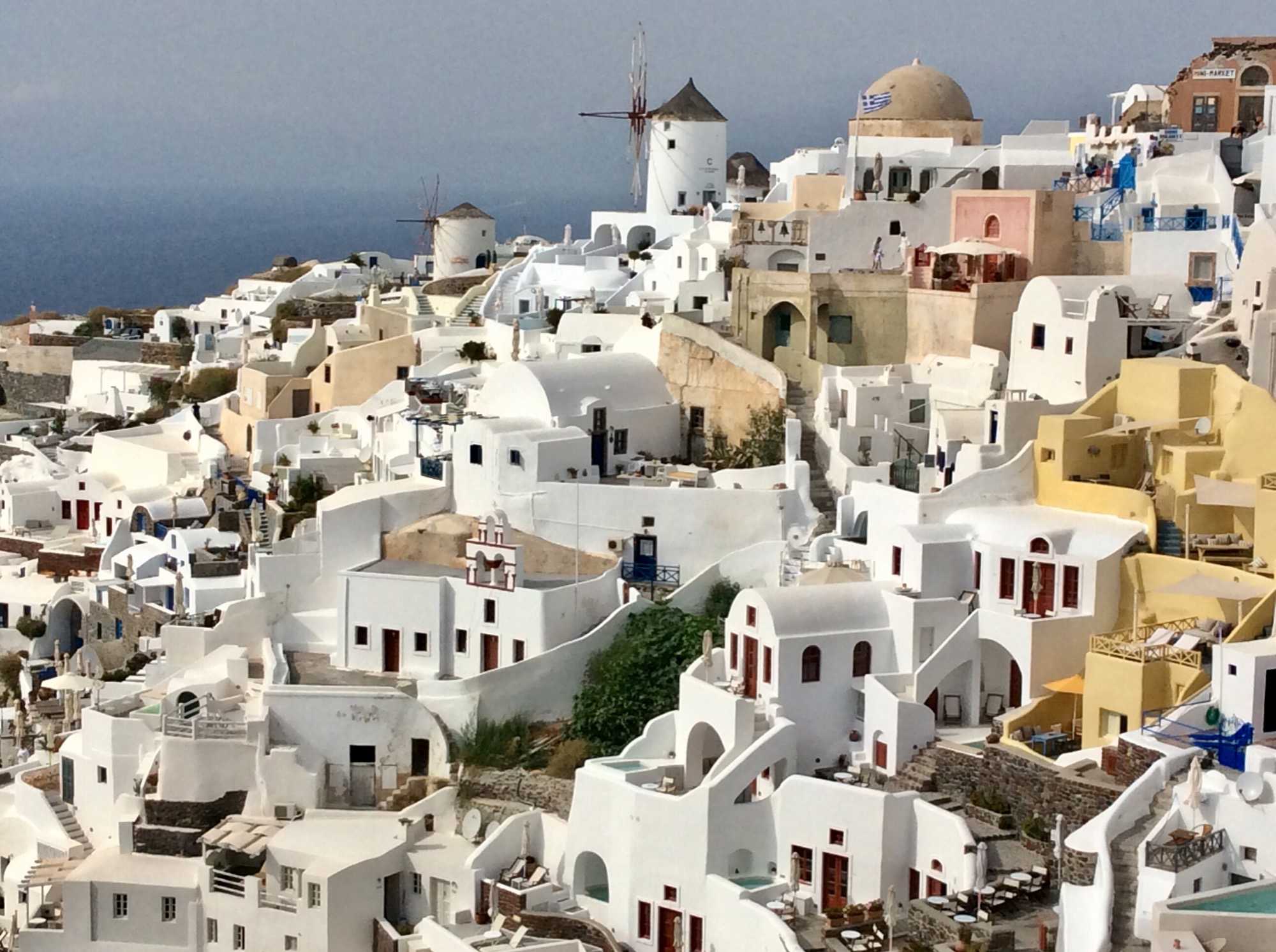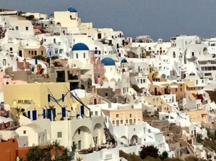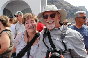 Sur le trajet vers Oia, de magnifiques vues s'offrent à nous le long des routes sinueuses et un peu étroites au goût de certains de nos amis voyageurs. On y voit les différentes couleurs de ce sol aride dominé par la présence de lave, suite aux éruptions volcaniques. On passe du rouge et parfois au brun et sable noir . Nous avons un bon petit chauffeur! Il connaît bien les dimensions de son véhicule! Nous arrivons en toute sécurité… et là une seule parole sur les lèvres de tous : « De toute beauté! ». Peu importe où se posent nos yeux, nous sommes estomaqués de découvrir les vues offertes par cette ville