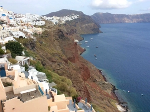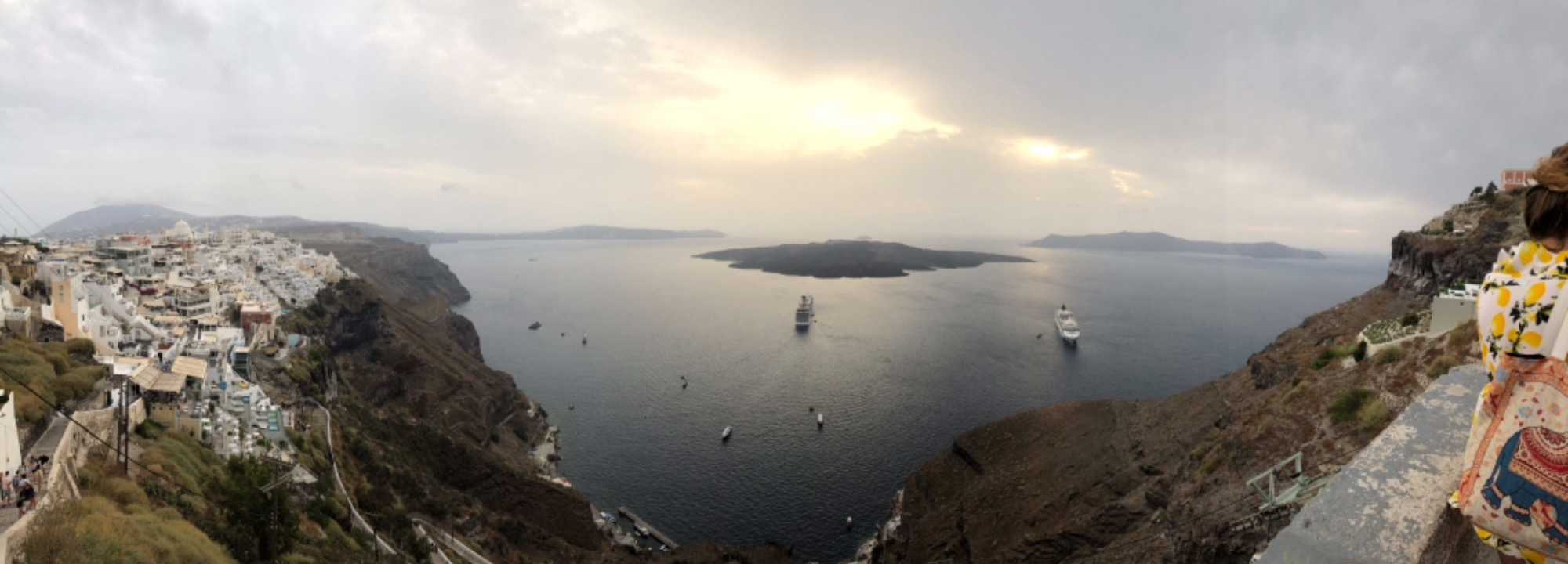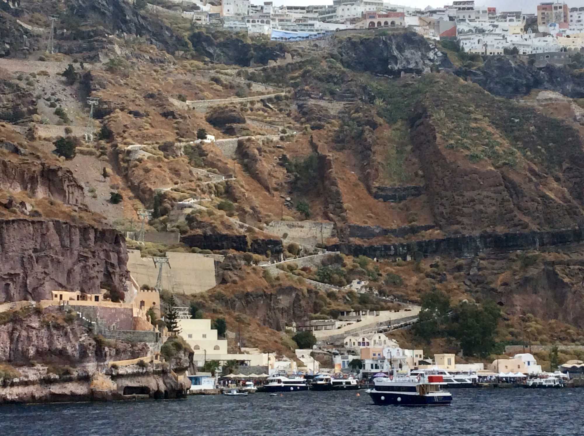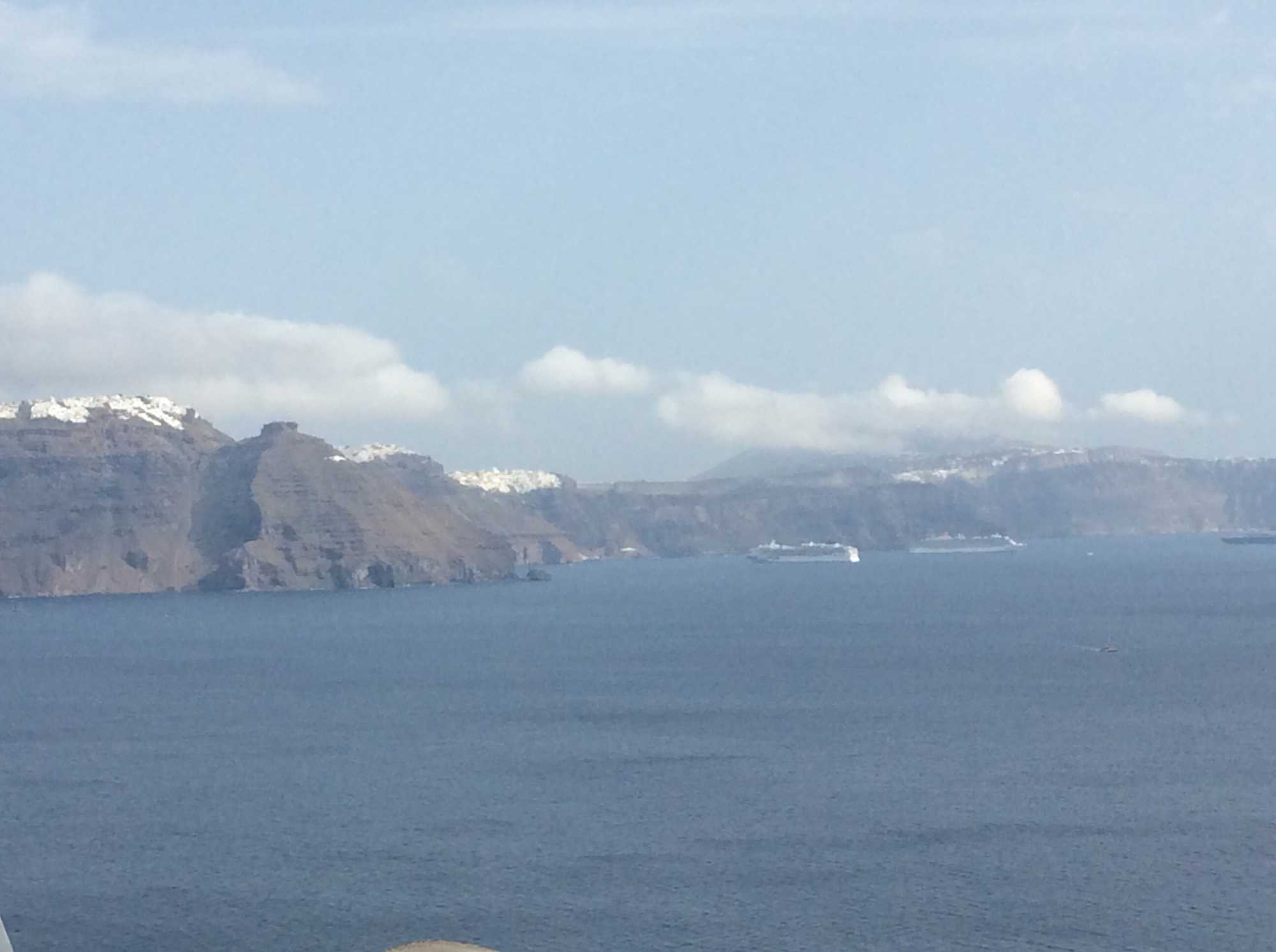 Nous débutons notre journée en constatant que notre navire est ancré dans la baie entre l'île principale et l'île volcanique de Nea Kameni. Une vue impressionnante nous est offerte sur les sommets escarpés où les villes sont érigées. En regardant le paysage, on croirait que les sommets de la région sont recouverts de neige, mais c'est en fait l'enchevêtrement de maison blanches construite sur les rebords du cratère, car cette île c'est le bord d'un caldeira qui est au-dessus de la mer.