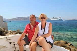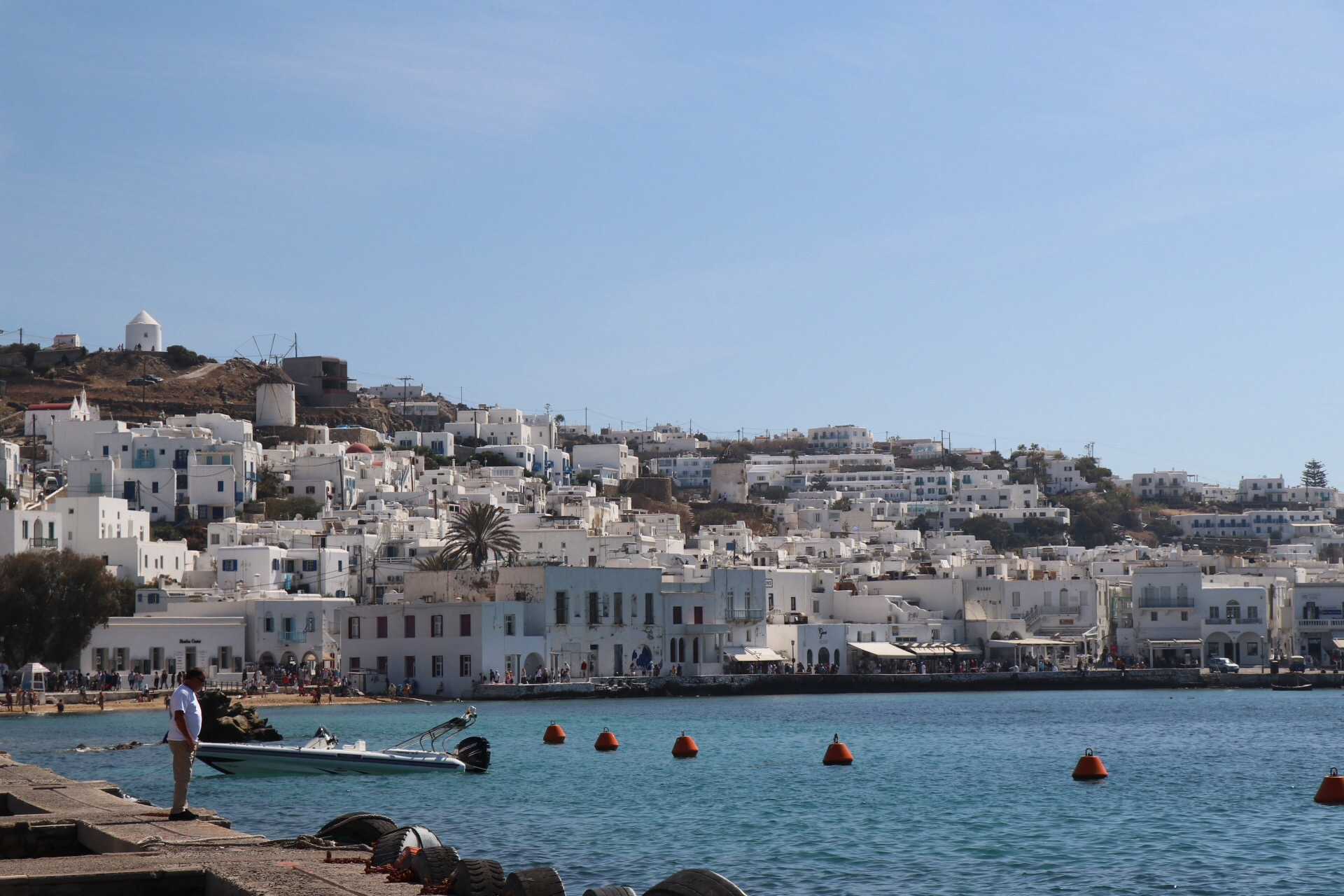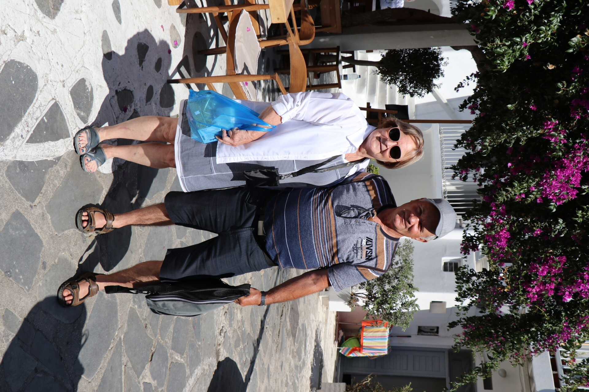 On se dirige tous ensemble, les yeux émerveillés et quelque peu plissés par la blancheur et la propreté des lieux. Nous nous rendons jusqu’aux pieds des moulins à vents. Un endroit légèrement surélevé qui nous offre une splendide vue d’un coté : la mer, notre navire au loin… et de l’autre côté les belles maisons de ce petit village. Vraiment de superbes paysages! Nous sommes tombés sous le charme de cet endroit. Puis, temps libre; chacun part à son rythme pour se perdre dans les ruelles…prendre une petite bière, un café, les belles boutiques…et ne serait-ce que pour admirer le décor et de bénéficier du temps qui passe. Un seul plonge à la pointe de l’île. Il paraît que l'eau est chaude et bien salée...