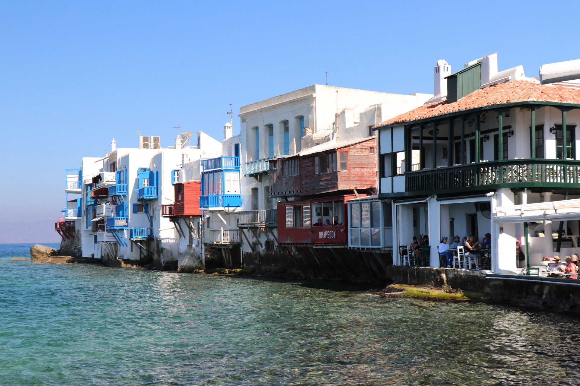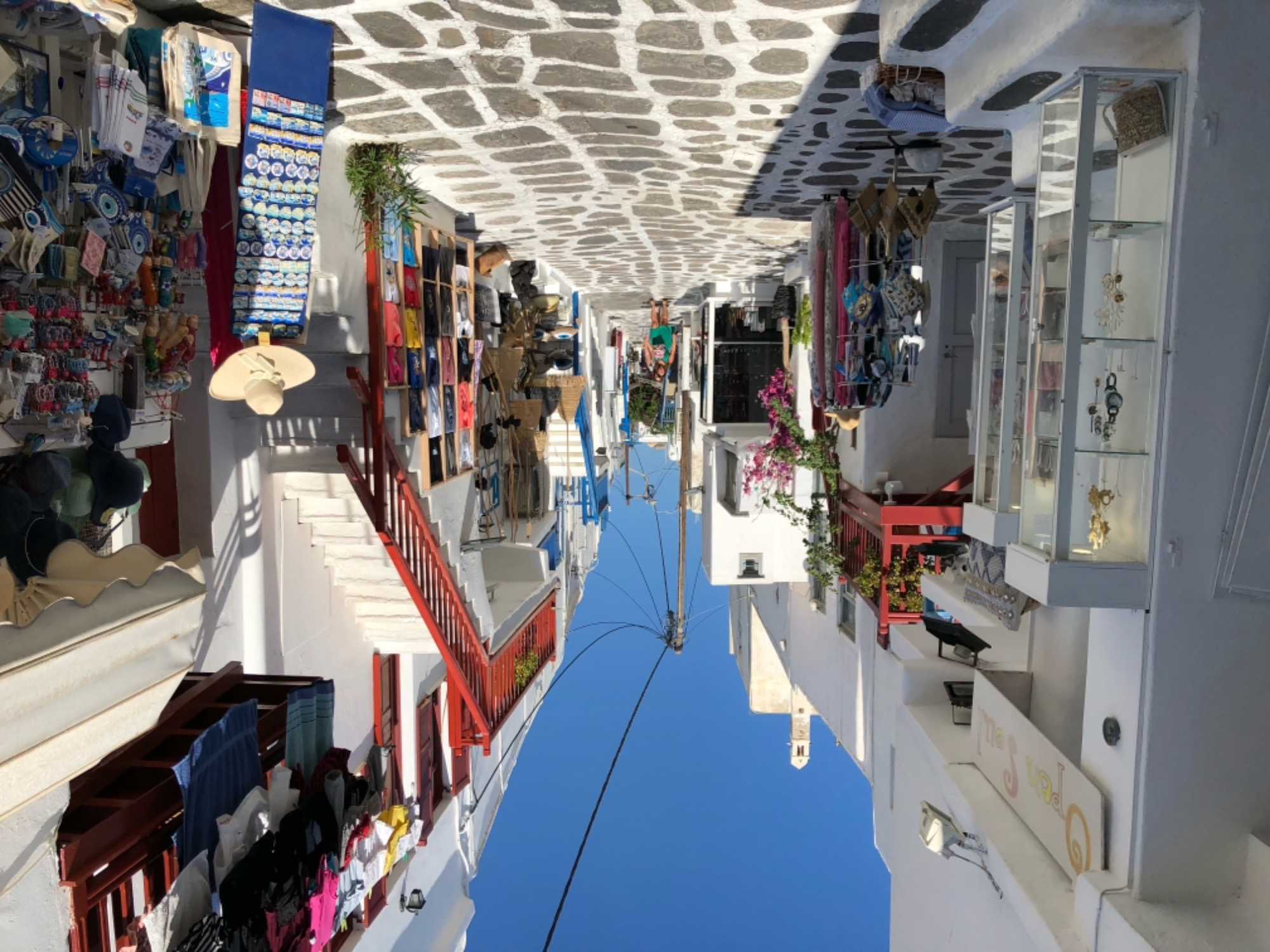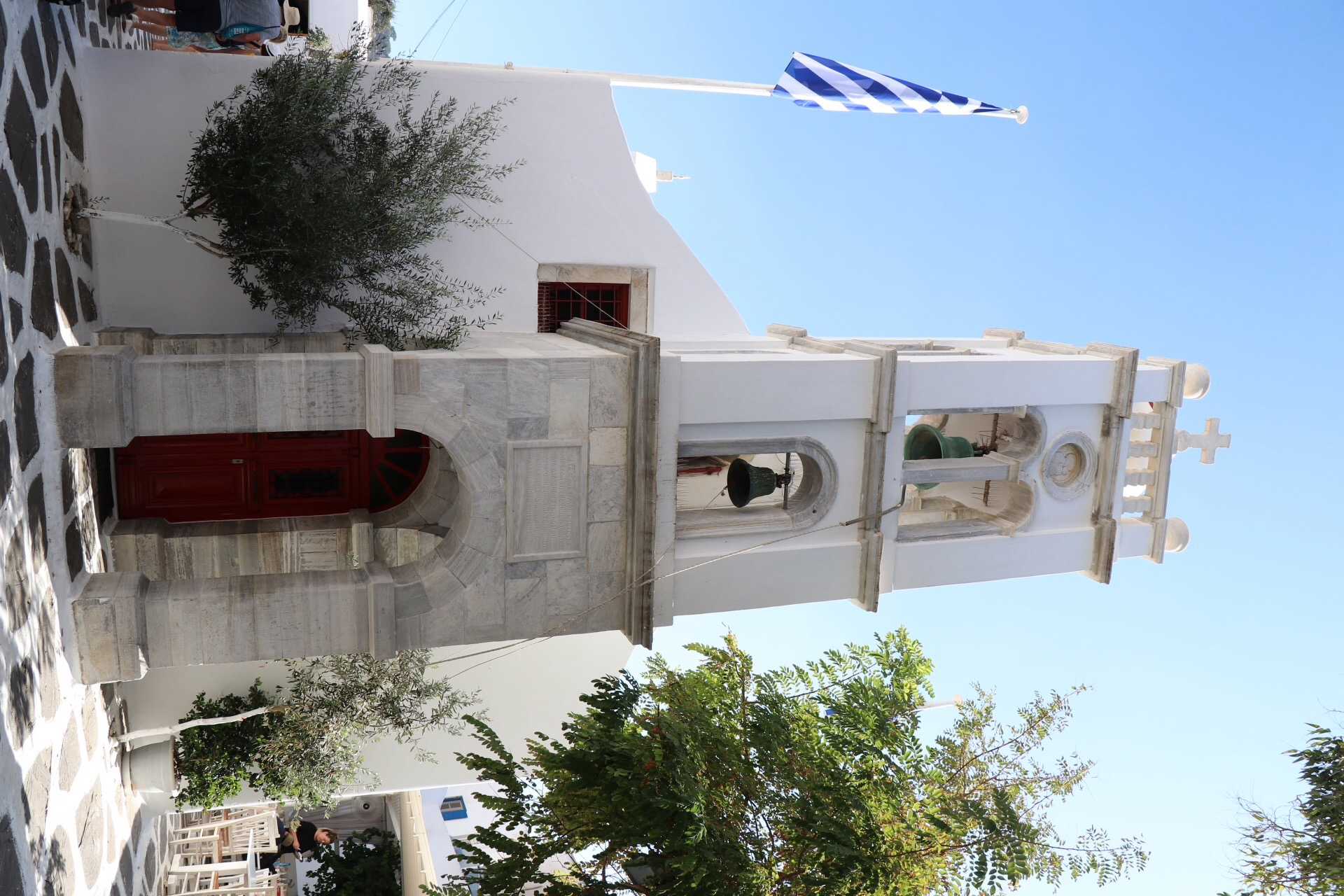 Rien ne presse ce matin, on prend notre temps pour le plaisir de tous! Nous sommes ancrés au large et nous devons prendre des tenders pour se diriger vers le petit port de bateaux de pêche et de plaisance situé à 2 km de notre navire. C’est le début de la marche dans les rues étroites d’un petit village construit dans la forme d’un labyrinthe. Plein de rues qui s’entremêlent les une dans les autres. Nous avons un plaisir fou à s’y perdre et à sillonner ces petits sentiers parsemés de boutiques, de cafés, de résidences, d’églises…tout se ressemble! Toutes les maisons sont blanches seules les portes et les fenêtres sont d’une couleur flamboyante entre le bleu et le rouge. C’est d’un charme époustouflant!