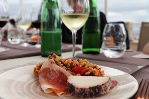 Nous nous rendons à la terrasse extérieure où nous expérimentons une dégustation de leurs bons vins et mangeons un bon dîner de leurs produits locaux. Par contre le ciel s'assombrit et comme dans le meilleur scénario, nous sommes sur une terrasse et à la fin du repas, nous voyons arriver un "mur'' de pluie à grande vitesse, notre dîner est légèrement écourté et nous nous réfugions à l'intérieur.