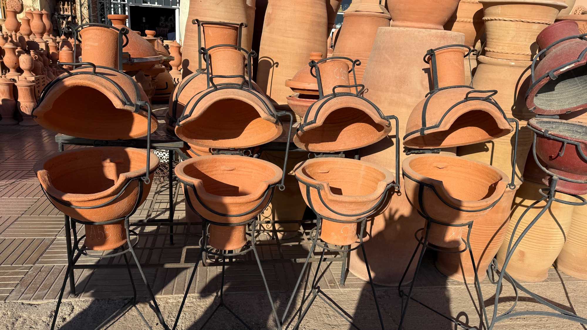 Le paysage qui nous entoure est très beau, voire magnifique, sublime! Mes voyageurs sont en mode découverte, étonnement et contentement s’affichent sur leur visage; quant à moi, je ne me lasse pas de poser le regard sur ce paysage grandiose. Sur notre chemin, nous arrêtons faire l’achat de fruits, car c’est la pleine saison des oranges et des mandarines juteuses à souhait dont on ne voudrait pas se priver. Puis, petit arrêt à la médina pour voir les marchands qui vendent de tout, quand je dis de tout, je veux vraiment dire de tout : des noix fraiches et odorantes, salées, écalées ou non, puis des légumes de toutes les grosseurs et couleurs, des électroménagers (oui, madame, de tout), des vêtements, etc. Tout ce qu’on veut, on peut le trouver ici, mais attention, il y a beaucoup de contrefaçon et il ne faut pas se laisser prendre par les miroirs aux alouettes! Heureusement, Simo connaît la chanson et nous guide vers les bonnes échoppes. Ainsi, il nous suggère un petit arrêt chez un potier qui se fait un plaisir de nous fait connaître la fabrication de la poterie; c’est agréable et nous en profitons pour faire des achats pour des cadeaux ou des souvenirs.