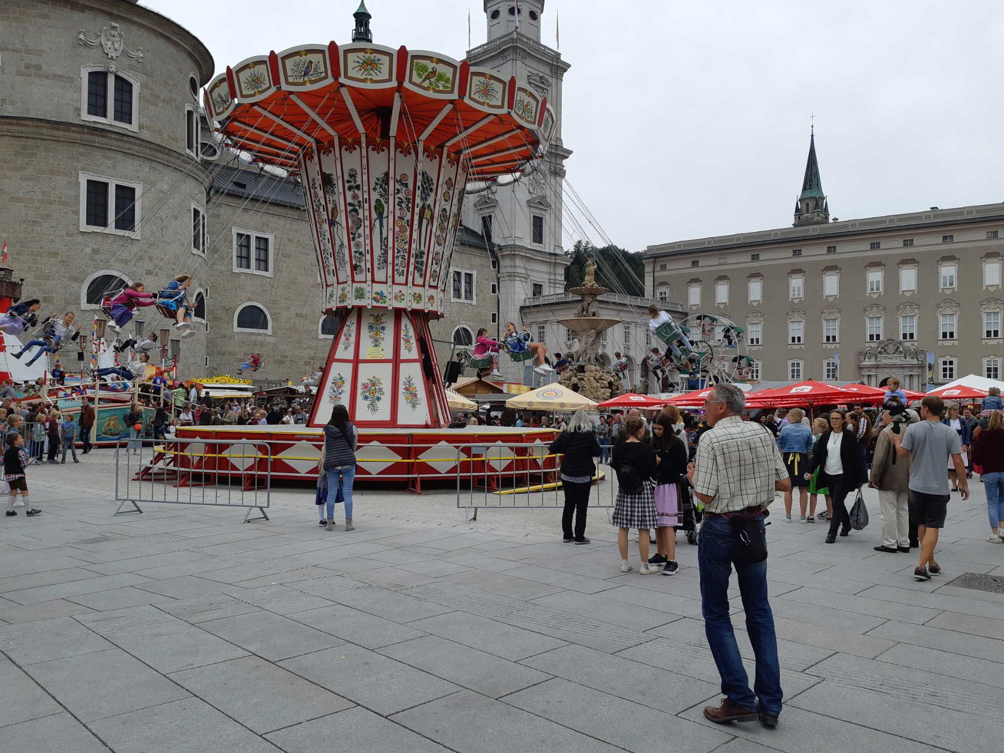 Nous nous rendons voir la maison où est né Mozart, puis nous passons à travers un impressionnant petit cimetière pour aller au restaurant. Nous avons la grande chance que notre excursion ait lieu en cette fin de semaine où on célèbre Saint-Rupert. Il s’agit d’une grande foire dans la vieille ville où les habitants portent les costumes traditionnels. On y installe des kiosques de nourriture dont les célèbres saucisses et les pretzel, on y offre aussi des vêtements traditionnels. De nombreux manèges et jeux d’adresse sont également mis à la disposition des nombreuses familles locales venant célébrer. Nous y passons quelques moments avant de reprendre l’autobus vers Linz où nous attend notre navire. Merci à notre excellent guide Bernard pour cette belle visite!