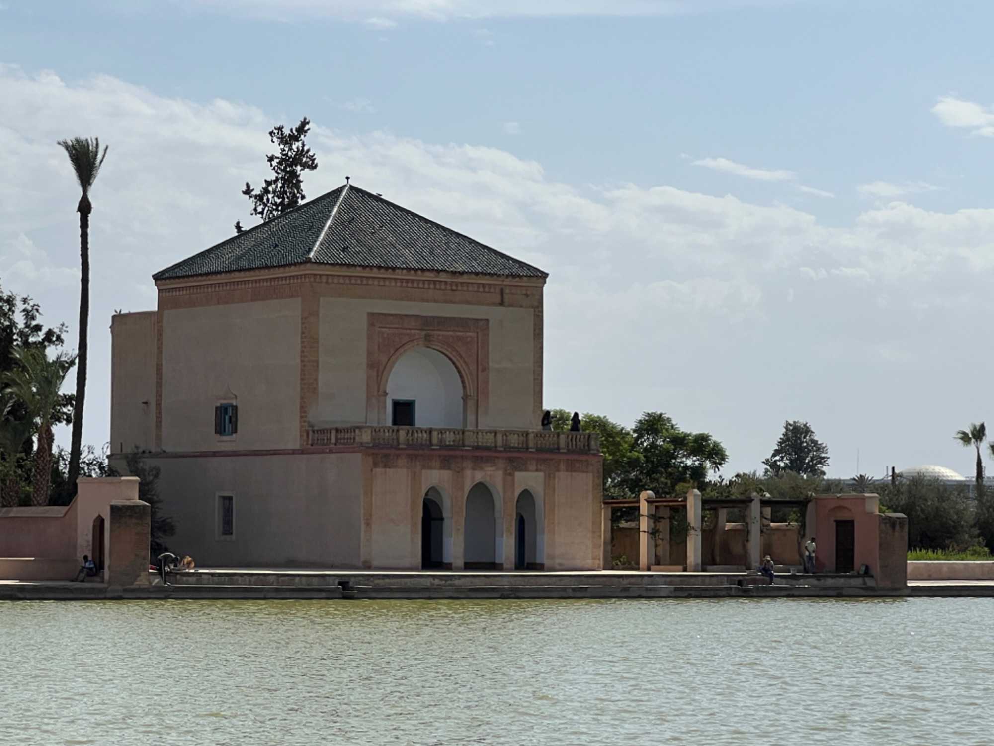 Continuation pour voir un très beau monument qui est sur toutes les cartes postales au Maroc Le pavillon Saädien qui est situé dans les jardin de la Ménara on y voit son bassin de carpes et son jardin d'Olivier nous avons la chance que Mohammed nous raconte toute l'histoire c'est très intéressant comme toujours on apprends de chacun de nos guides et nous connaissons de plus en plus les coutumes et la culture ici .