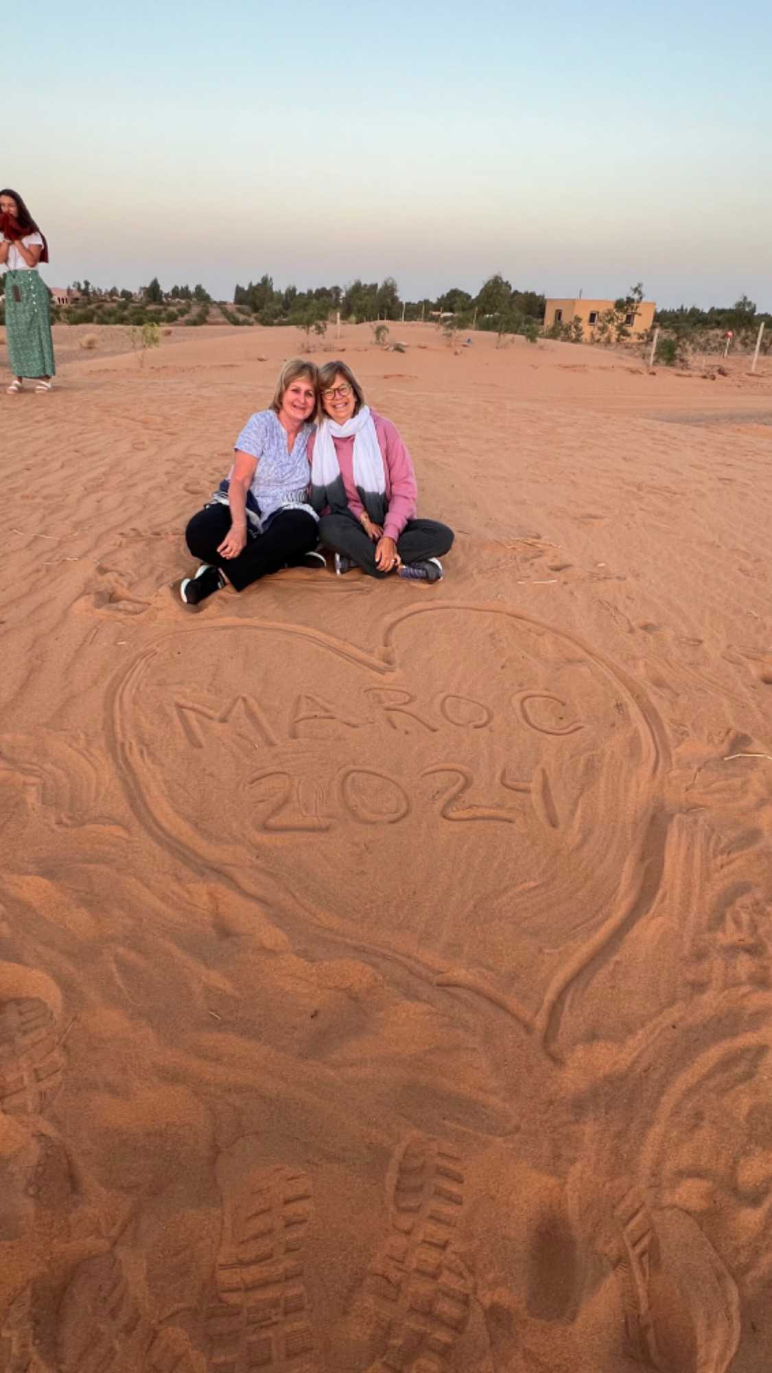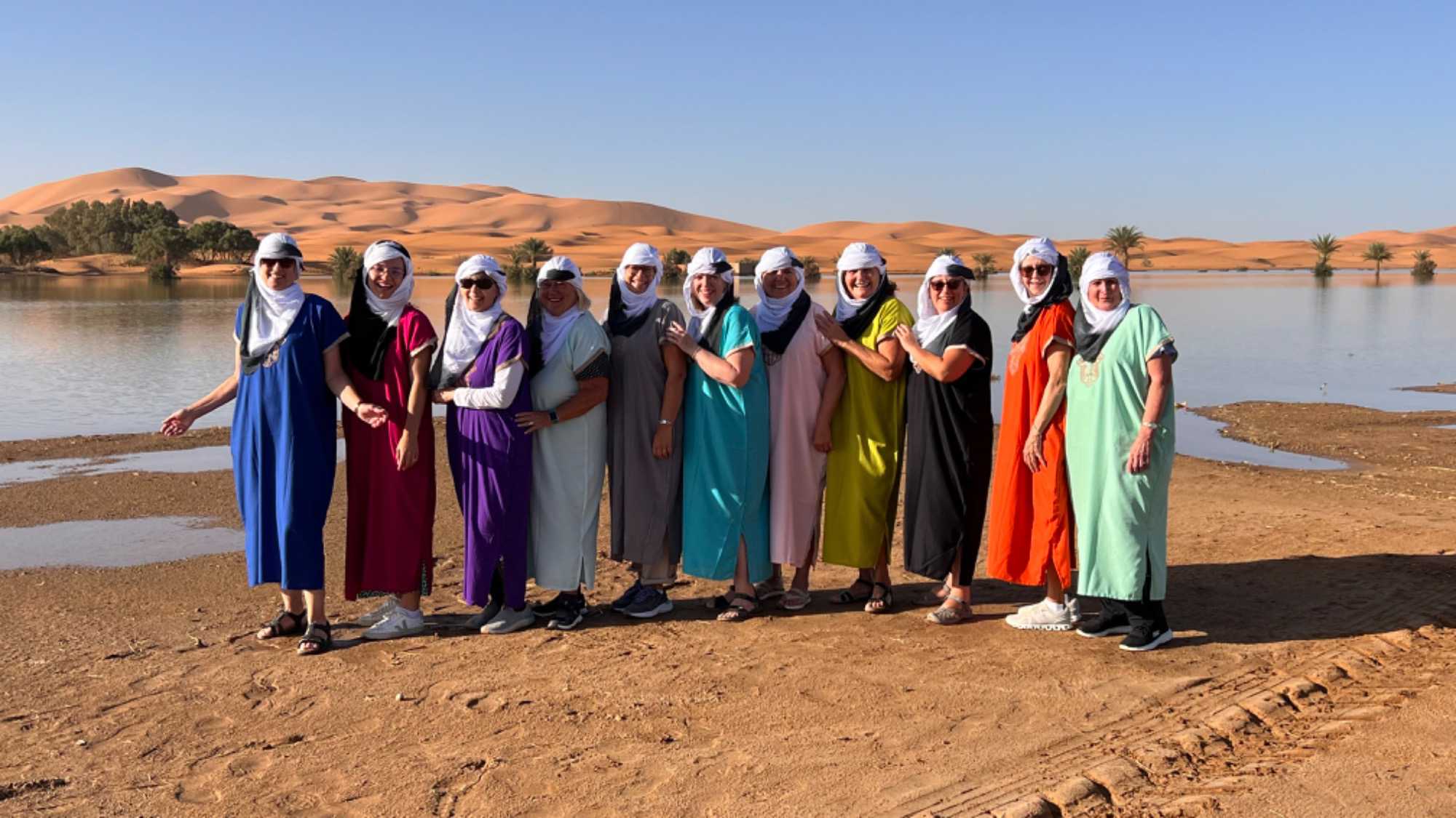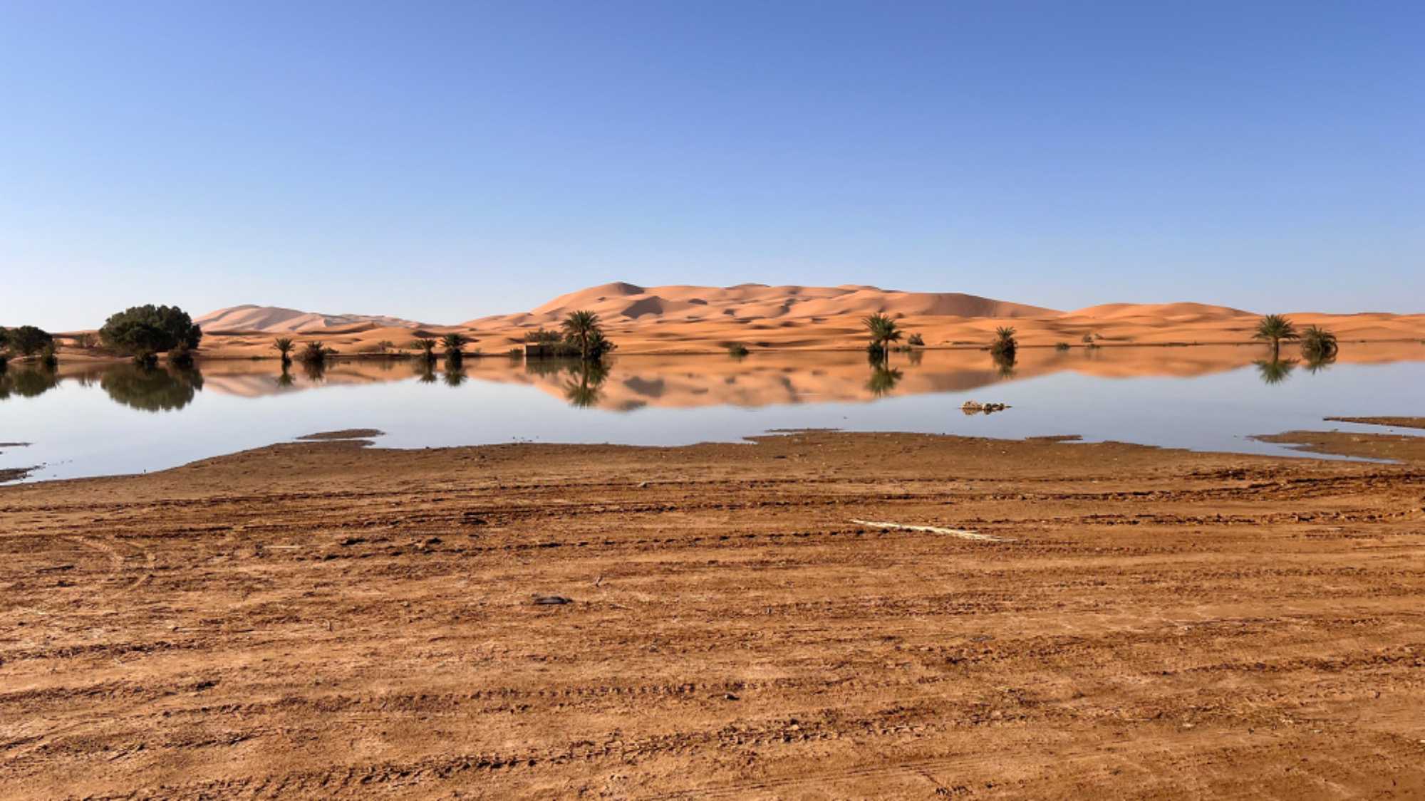 Après pareil spectacle, un bon déjeuner s’impose avec force café ou, pourquoi pas, un bon thé à la menthe bien sucré. Nous partons ensuite en 4 x 4 pour rejoindre notre autocar (on apprend tous les jours, ainsi, je viens d’apprendre qu’un autobus sert au transport en commun tandis qu’un autocar sert au transport de touristes). Avant de poursuivre notre route, nous faisons un petit arrêt dans le désert de Merzouga pour prendre une jolie photo de famille devant les dunes et l’eau laissée par de fortes pluies il y a un mois. Photo mémorable, il va sans le dire tant trouver de l’eau dans le désert est rare. Le temps est parfait.