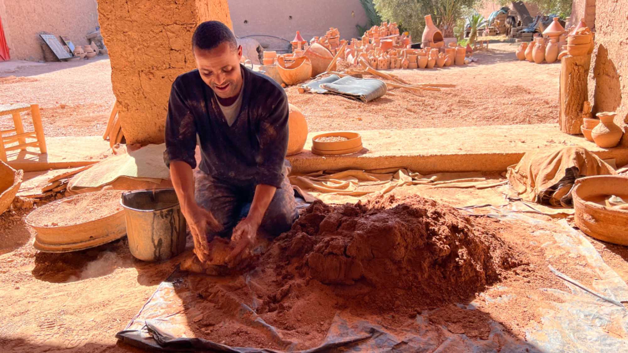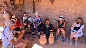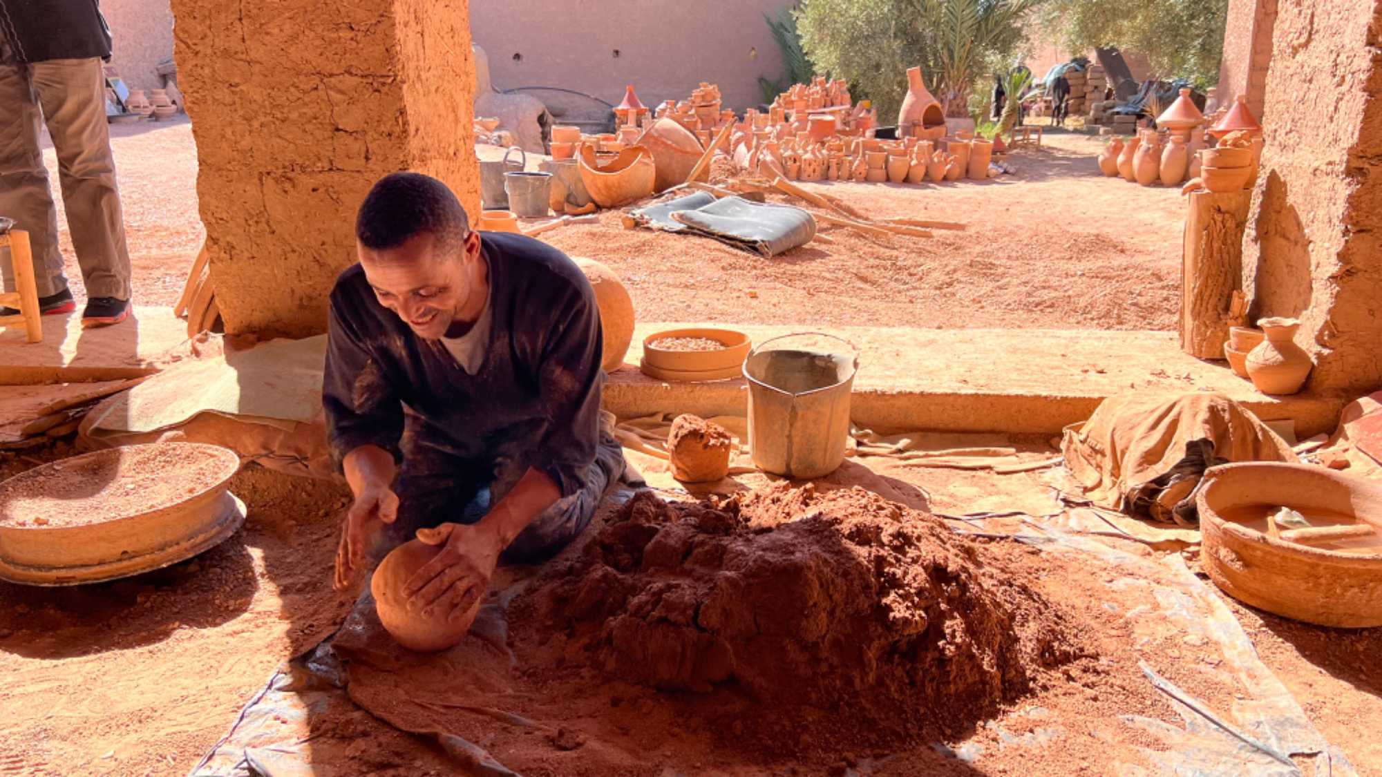 Nous commençons la journée par la visite d’une belle casbah offrant une vue imprenable sur la palmeraie de 25 km carrés toujours habitée et cultivée. Après ce coup d’œil panoramique et avant même d’aller visiter la palmeraie, nous nous arrêtons dans un petit commerce de poterie locale où potiers et ouvriers prennent le temps de nous initier à cet artisanat dont les secrets sont transmis de génération en génération. Le jeune homme qui nous renseigne est non seulement charmant, mais en plus doté d’un sourire qui va droit au cœur.