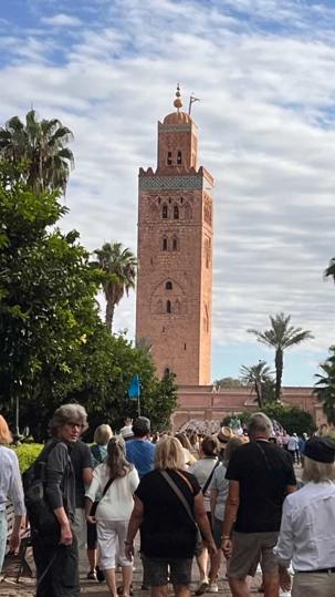 Après avoir vu les remparts, nous poursuivons notre visite par la mosquée Koutoubia et son sublime minaret emblème de la ville rouge. Commencée en 1184 sous le règne du calife almohade Yaqub al-Mansur, elle a été achevée en 1199. La mosquée a été nommée Koutoubia en référence aux nombreux libraires et vendeurs de livres qui se trouvaient autrefois à proximité. Son minaret de 77 mètres de hauteur en fait le point le plus élevé de Marrakech. Il est divisé en trois parties distinctes, chacune ornée de bandeaux décoratifs et de motifs géométriques. Son sommet est couronné d’une petite coupole dorée. La cour intérieure est entourée de colonnes en marbre, soutenant des arcs en fer à cheval et cache un magnifique jardin orné de fontaines, offrant un espace paisible pour la méditation et la prière.