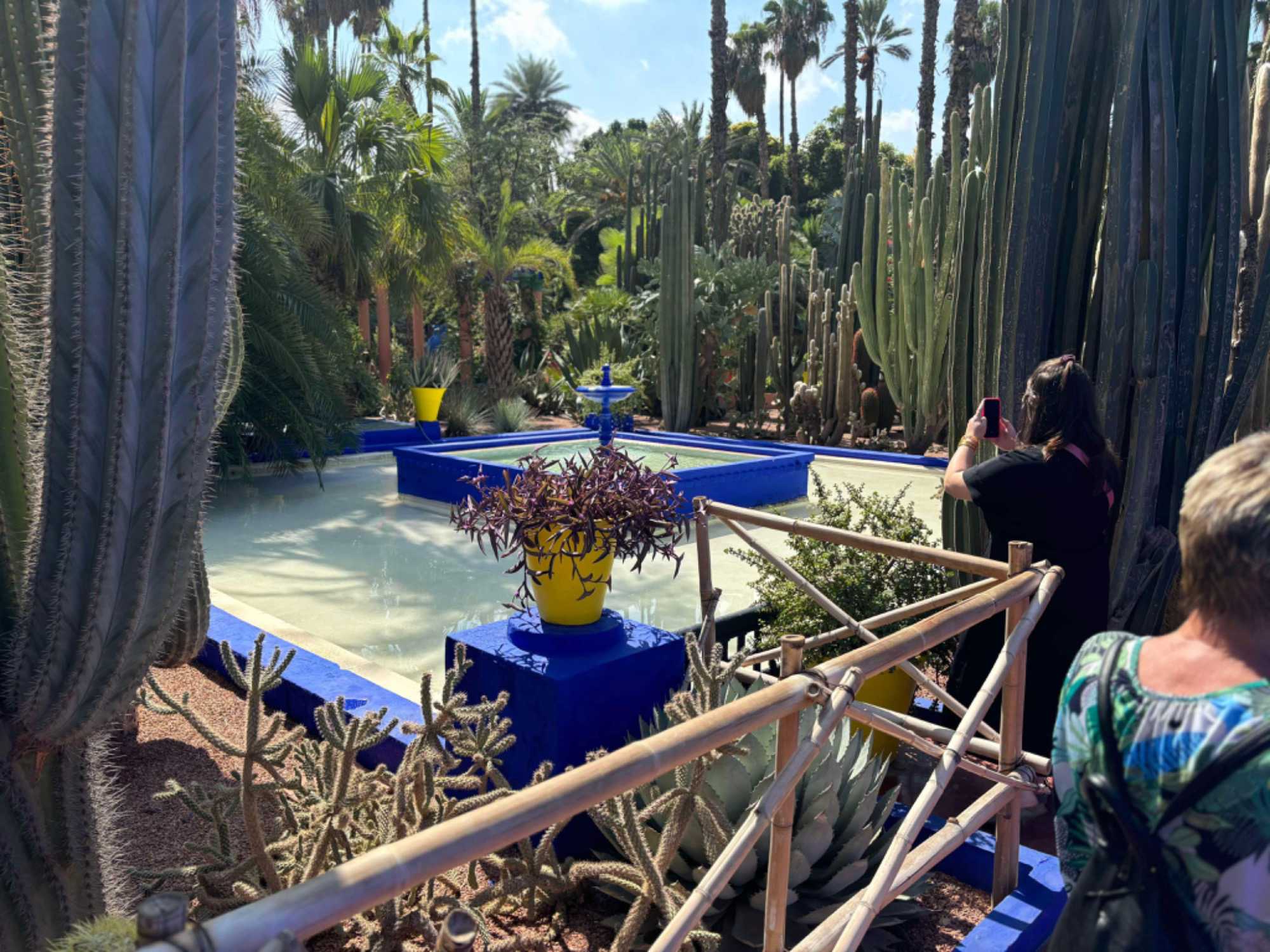 Ce jardin est une véritable œuvre d’art vivante en mouvement, composé de plantes exotiques et d’espèces rares qu’il rapporte de ses voyages dans le monde entier : cactus, yuccas, nénuphars, lotus, nymphéas, jasmins, bougainvilliers, palmiers, cocotiers, bananiers, bambous, caroubiers, agaves, cyprès, et j’en passe! Le tout est orné de fontaines, bassins, jets d’eau, jarres en céramique, allées, pergolas. En 1937, l’artiste crée le bleu Majorelle, un bleu outremer/cobalt à la fois intense et clair dont il peint les murs de sa villa et les différents bâtiments du jardin, puis il ouvre les portes au public en 1947 pour en faire un véritable tableau vivant. Même si je les ai vus plusieurs fois, c’est toujours pour moi un moment d’extase! Les voyageurs apprécient cette visite, c’est un moment de relaxation totale.