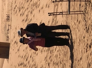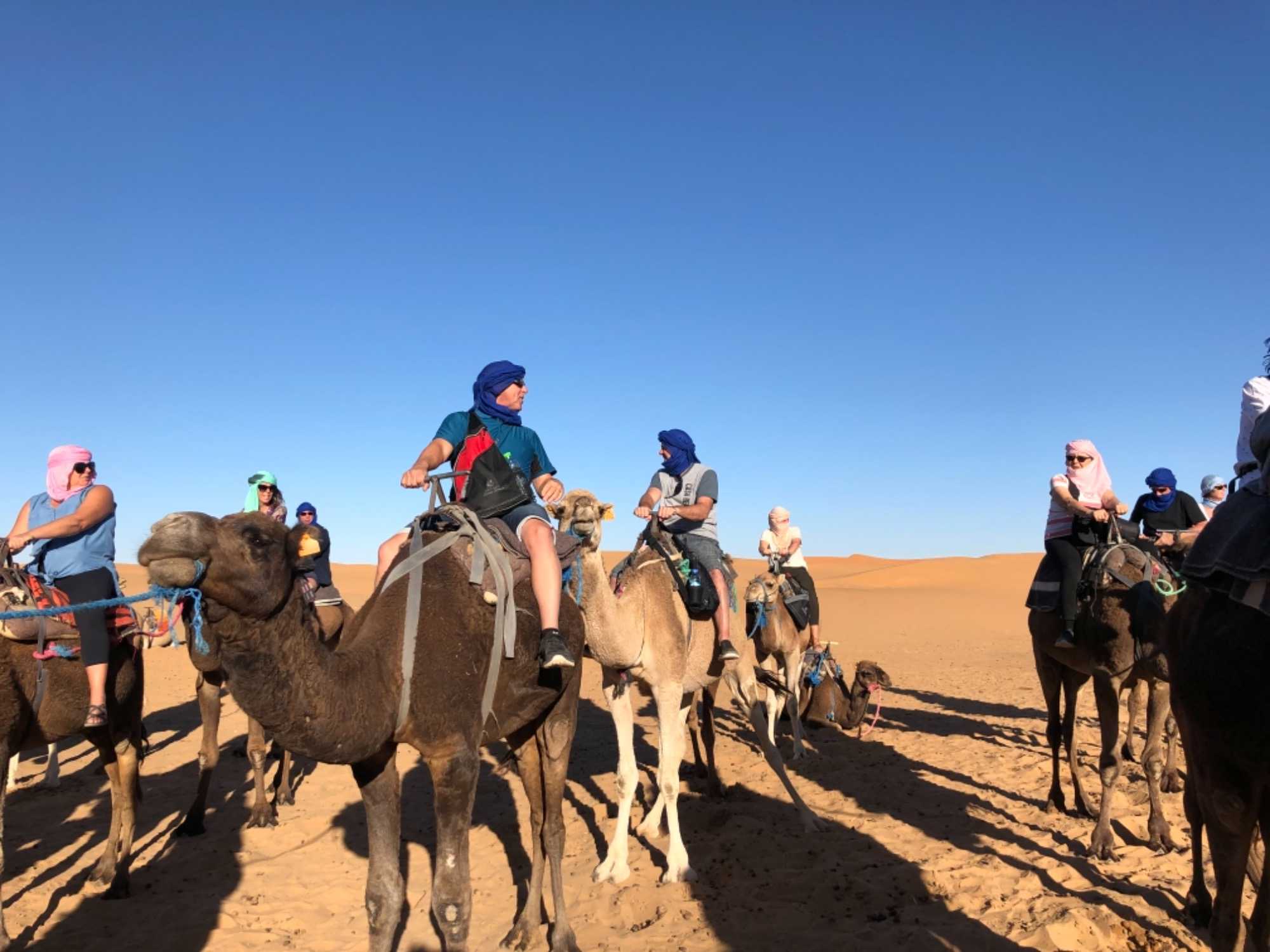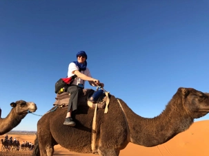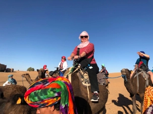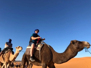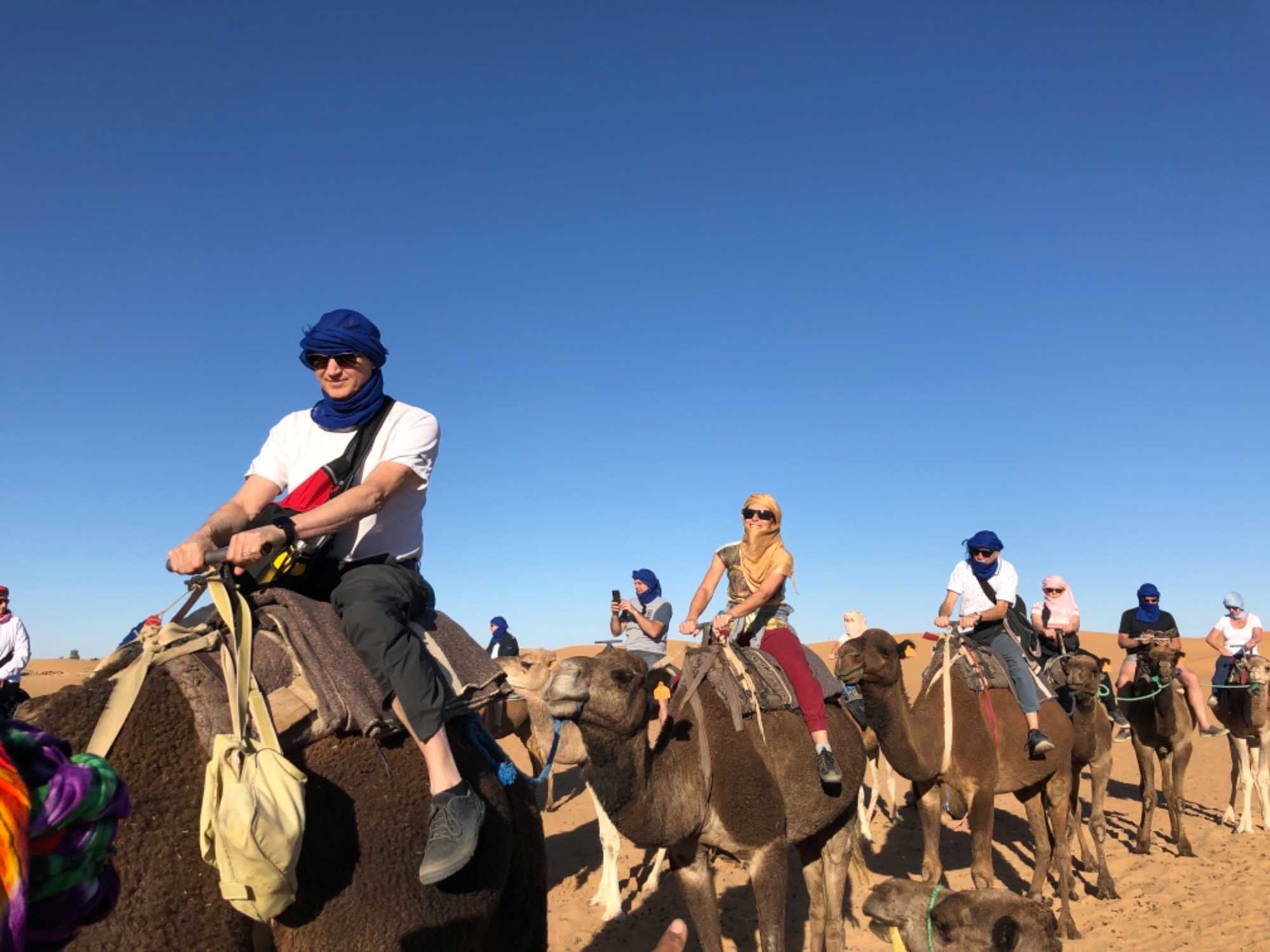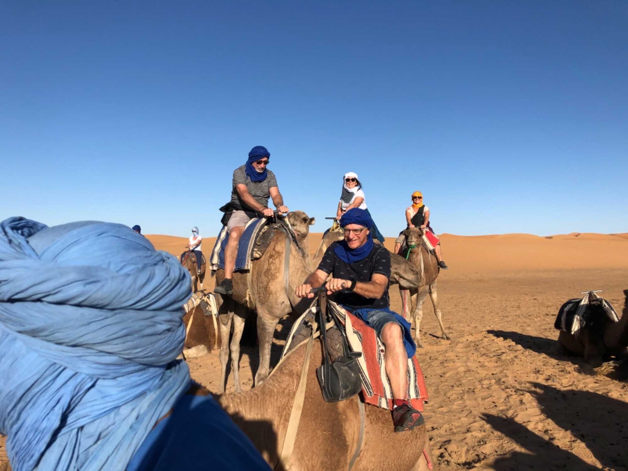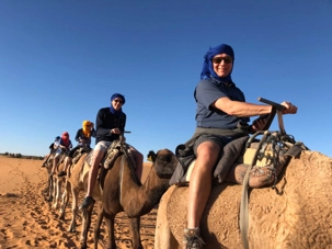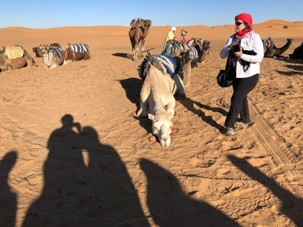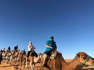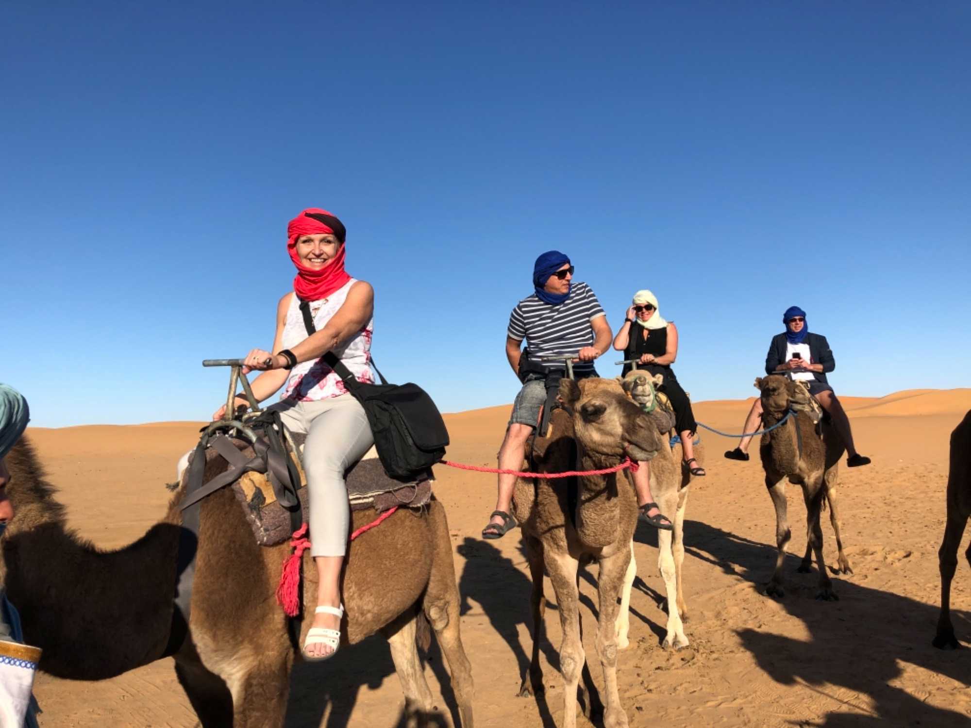 Ceux qui sont en dromadaire ont eu une magnifique surprise! Toute une expérience comme jamais nous avons eu avant, c’est mémorable, coucher de soleil et descente de la dune sur tapis.