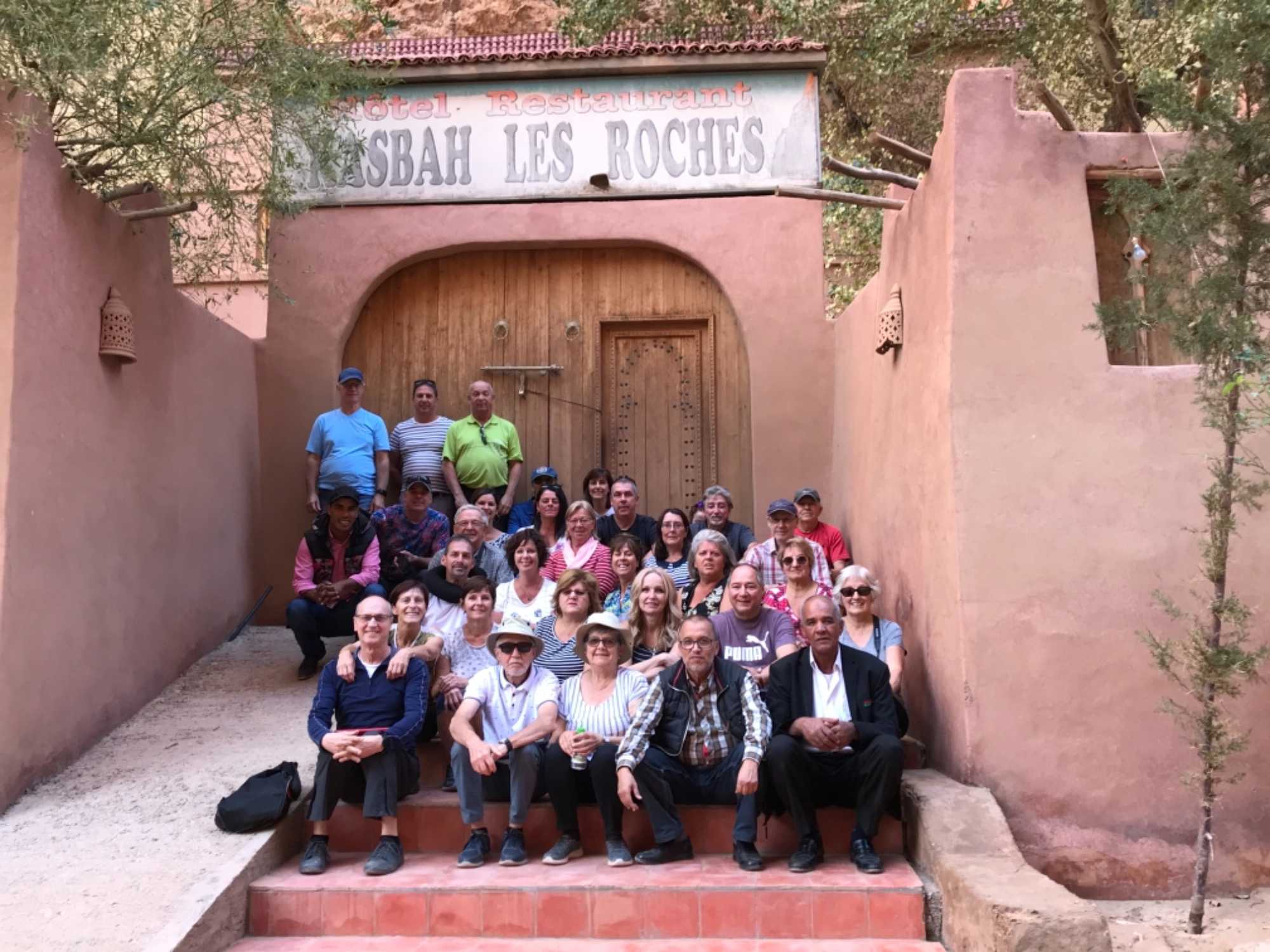 Quand tout le monde est prêt, c'est le départ en 4x4. Quelques minutes pour reprendre l’autobus et on reprend la route vers Ouarzazate via Tinghir. Chemin faisant notre guide Mostapha nous raconte l’histoire. Nous avons un guide en or! Tout le monde l’aime et on est tous passionnés par ce qui nous raconte. Il est dévoué pour nous les touristes et il aime son pays, on le ressent.