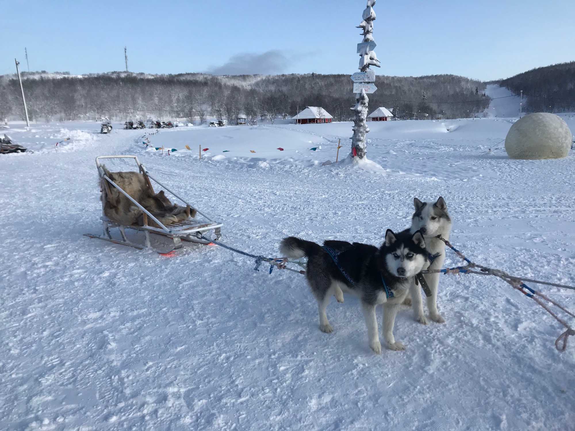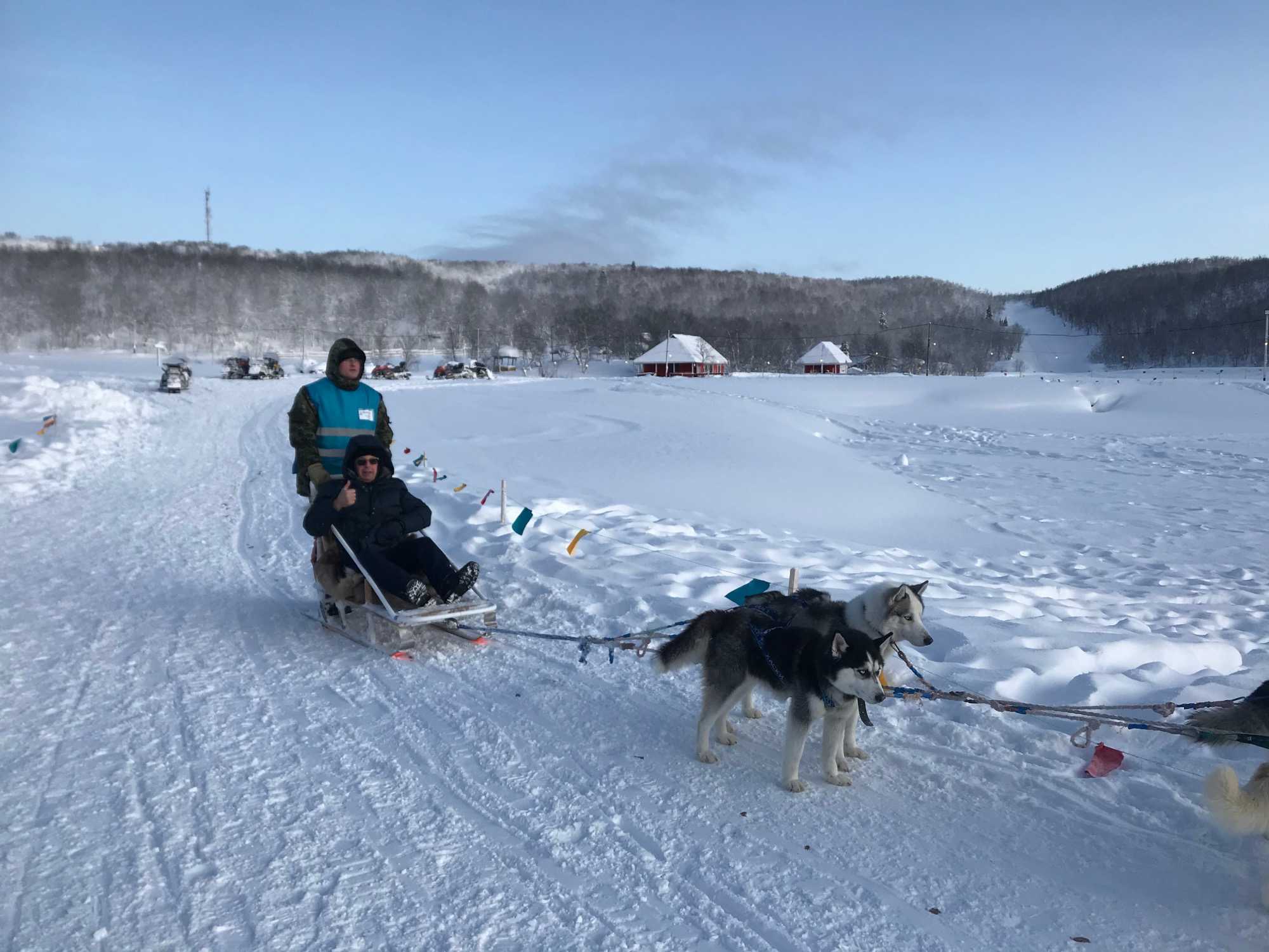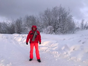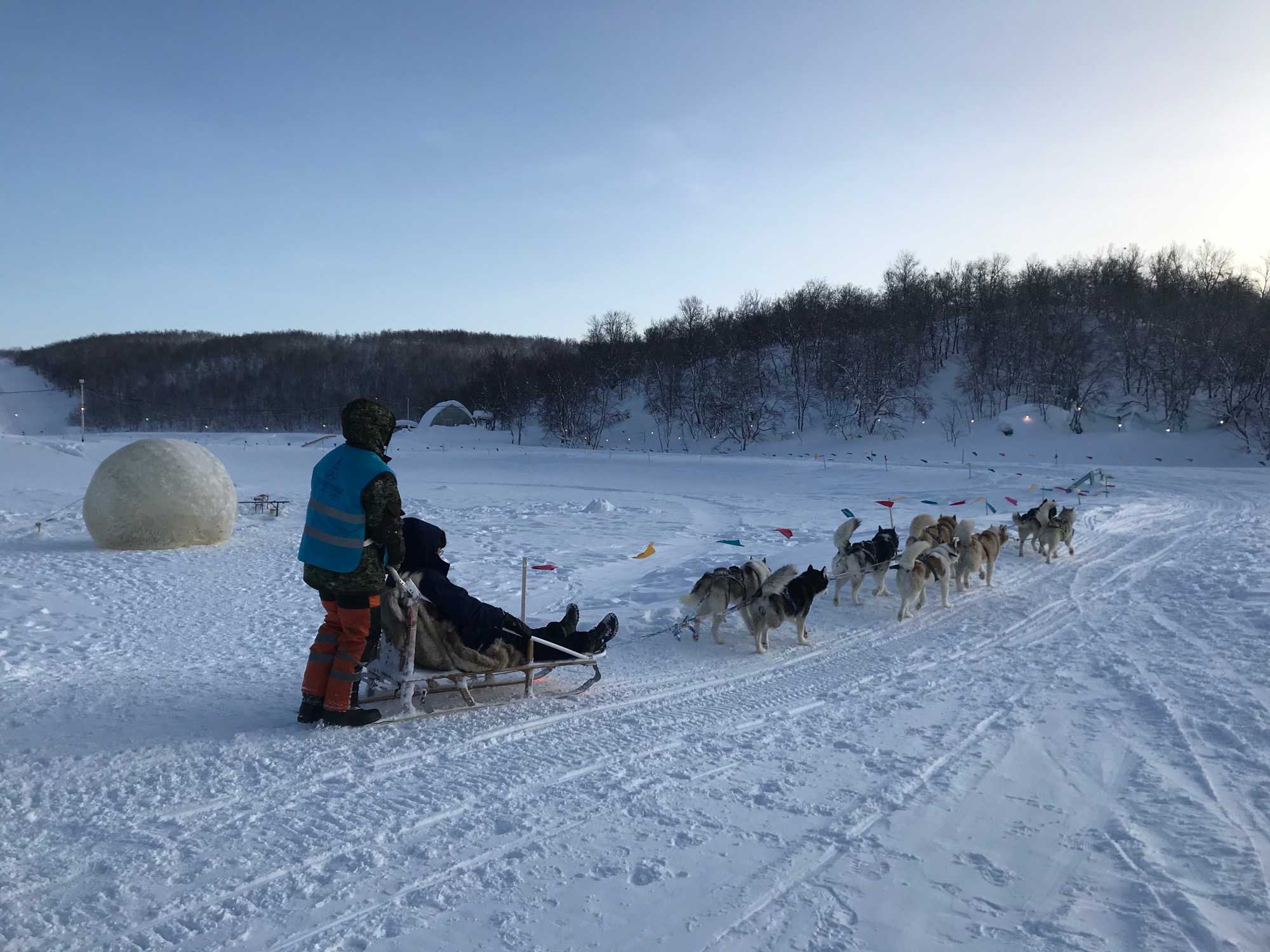 Il faut bien se lever ce matin si nous voulons profiter de notre journée, mais disons que la levée du corps est plus difficile… La nuit n’a pas été longue! Quelle drôle de journée encore côté température. Pas trop froid, avec environ -8 degrés, mais avec un très bon coefficient de facteur vent, ressenti environ -20. Il faut vous dire que la lumière du jour ne dure pas très longtemps dans ces journées les plus longues de l’hiver. À cette latitude, c’est la nuit polaire du 2 décembre au 10 janvier: aucun lever de soleil ! À partir du 11 janvier, le soleil se lève à Mourmansk à 12h48 et se couche à 13h02. Aujourd’hui, le soleil se lève à 10h50 et se couche à 15h10. Faut vraiment en profiter lorsqu’il sort! Et puisque Mourmansk est entouré de belles collines, le soleil se couche encore plus tôt que ça. À 14h, nous avons pu admirer le coucher du soleil!