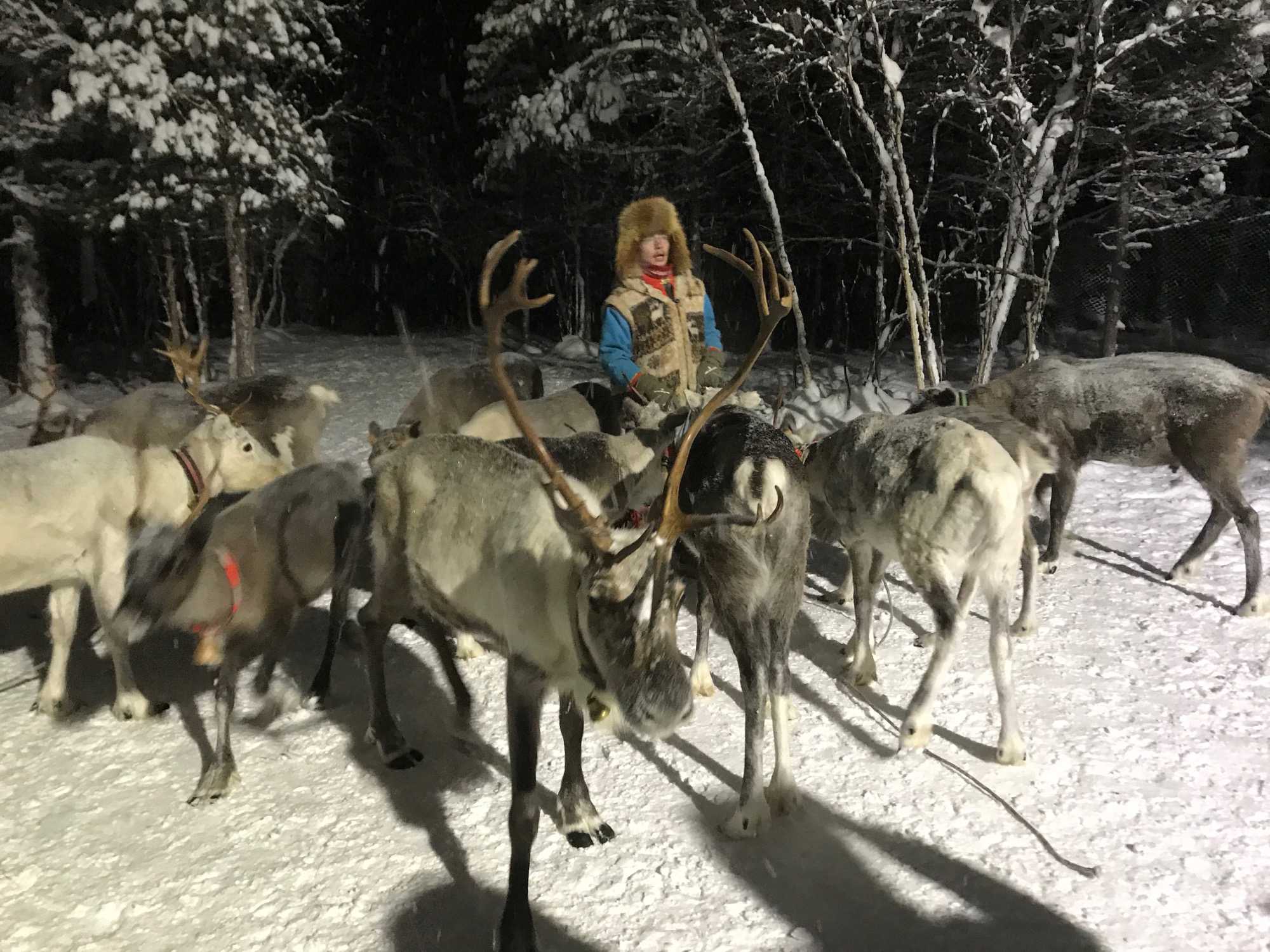Notre visite sur le site comprend un circuit qui débute par l’allée des idoles. Ce sont des genres de totems et si on y met une pièce de monnaie, on peut réaliser nos voeux. Ensuite, on nous amène rencontrer leurs animaux: chiens huskies, renards et rennes. Nous pouvons nourrir les rennes à la main: il parait que les rennes n’ont pas de dents, donc ils ne peuvent pas nous mordre! Nous leur donnons du pain et ils sont très gourmands. Pour le souper, on nous sert des mets traditionnels: soupe de saumon, viande de renne avec riz, du pain Lovozersky, des crêpes en desserts et une boisson des plantes « pakula ». C’est très savoureux.