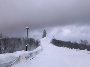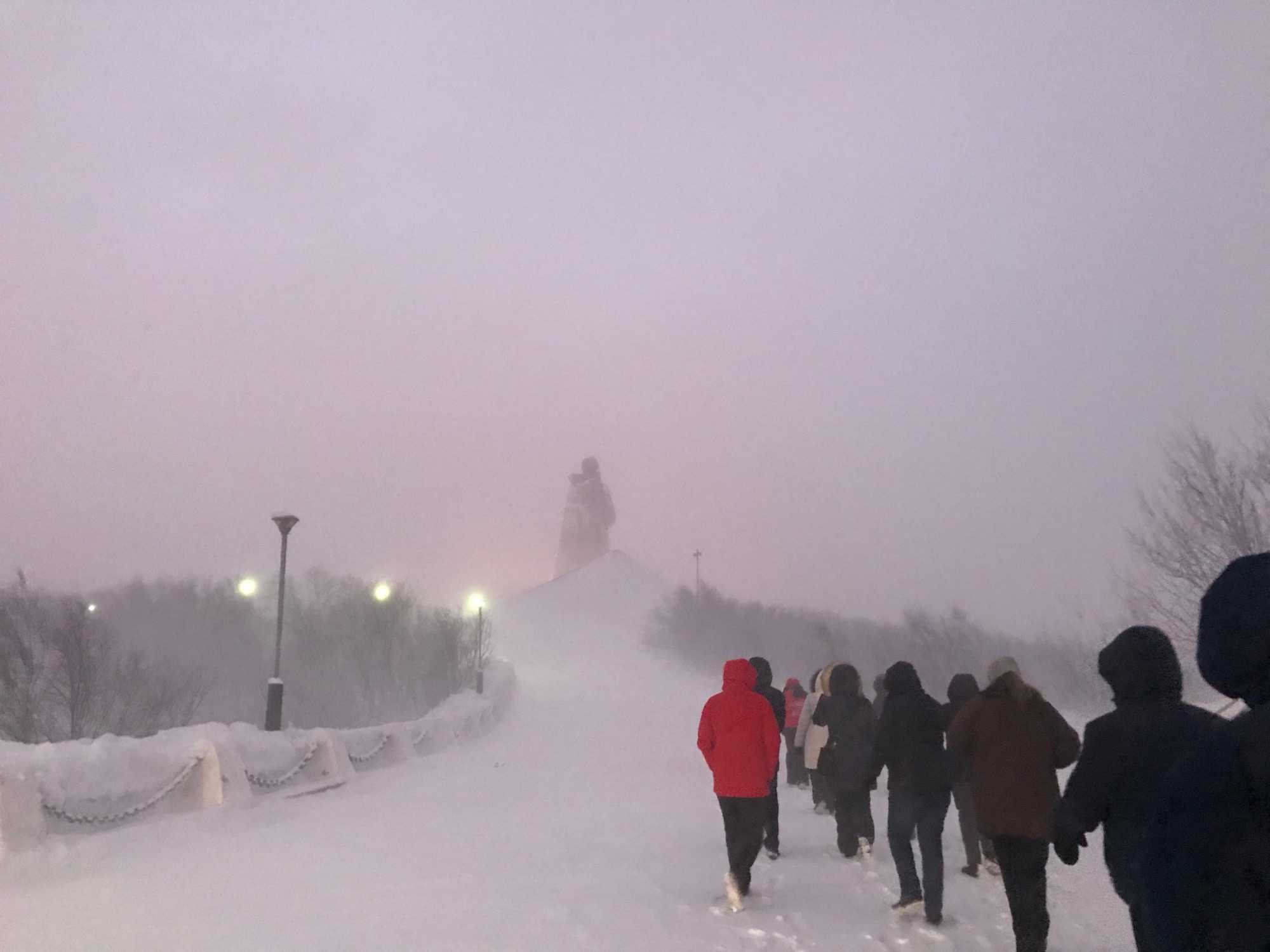 Après notre petit-déjeuner pris à l’hôtel, nous débutons notre visite de la ville de Mourmansk en compagnie de notre charmante guide Maria. Mourmansk est une ville portuaire, située au bord de l’océan Arctique, dans l’extrême nord-ouest de la Russie, à proximité des frontières russes avec la Norvège et la Finlande. La ville tire son nom de la côte de Murman, un terme russe plus ancien qui désigne les Norvégiens. En général, depuis le sommet d’une des collines qui entourent le profond fjord de la mer de Barents, nous pouvons contempler les navires qui partent vers les eaux glacées Mais pas ce matin, car le temps est à la tempête. Notre premier arrêt se fait à la base du monument aux défenseurs de l’Arctique soviétique pendant la Seconde Guerre mondiale. Le site du monument s’étend dans un grand parc sur une esplanade gigantesque. Aujourd’hui, c’est le blizzard qui nous attend! Juste le temps de débarquer du bus et le vent se lève. On a de la difficulté à gravir la côte et on reçoit comme des grêlons tellement le vent est fort. Il faut y être pour le croire! On en rit de se voir s’acharner sur cette météo capricieuse. Rendus en haut, près de ce gigantesque monument, j’essaie de prendre quelques photos, mais ce n’est pas si évident. André L en profite même pour faire une belle glissade! On est vraiment en hiver ici!