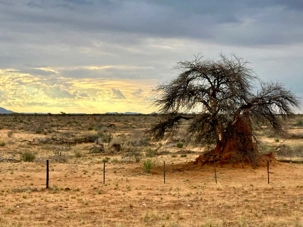 Sur notre route nous apercevons d’énormes termitières et Léonce nous explique toute leur histoire. Une termitière géante aperçu sur le bord de la route en Namibie. Le long des routes en Namibie, on observe régulièrement des monticules de terre, hauts de plusieurs mètres : des termitières ! Les termites, insectes sociaux, construisent des termitières, habitats en terre mâchée de tailles importantes dont la plus grande partie reste souterraine. Les termitières peuvent atteindre des hauteurs de huit mètres en Afrique. Les termitières contiennent une série de chambres en forme de bulles reliées par des passages ramifiés. Avec leurs sommets pointant vers le nord, les termitières ou les fourmilières se trouvent au nord de la rivière Swakop plus ou moins jusqu'à la frontière nord. Ces fourmilières apportent également une grande joie lorsque le champignon sauvage très recherché, Omajowa, apparaît au pied de la termitière peu après les pluies de février. Les termites sont des espèces sociales, qui vivent en colonies et ont une organisation en castes très spécialisées. Tout d'abord, il y a le couple royal, fondateur de la colonie dont ils sont les seuls individus reproducteurs. C'est un couple à vie et celle-ci, pour certaines espèces, peut durer jusque 60 à 80 ans. La caste la plus nombreuse de la colonie est celle des ouvriers. Sans ailes et aveugles, ils sont chargés de nourrir toutes les autres castes, de construire et d'entretenir la termitière. Nous avons aussi aperçu de nombreux babouins, quelques phacochères et aussi des petites gazelles. C’est un bon début!