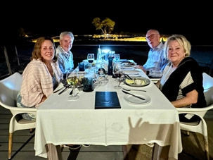 De retour au lodge nous avons pris le temps de profiter de notre beau lodge en prenant un apéro tout en admirant le super coucher de soleil. La vie est belle! Nous revenons au lodge pour le souper qui sera servi sur la terrasse après le coucher de soleil. Les photos sont presque trop belles pour y croire. Comme dans un film on se retrouve bien confortablement assis avec un menu haut de gamme pour notre souper en plein air.