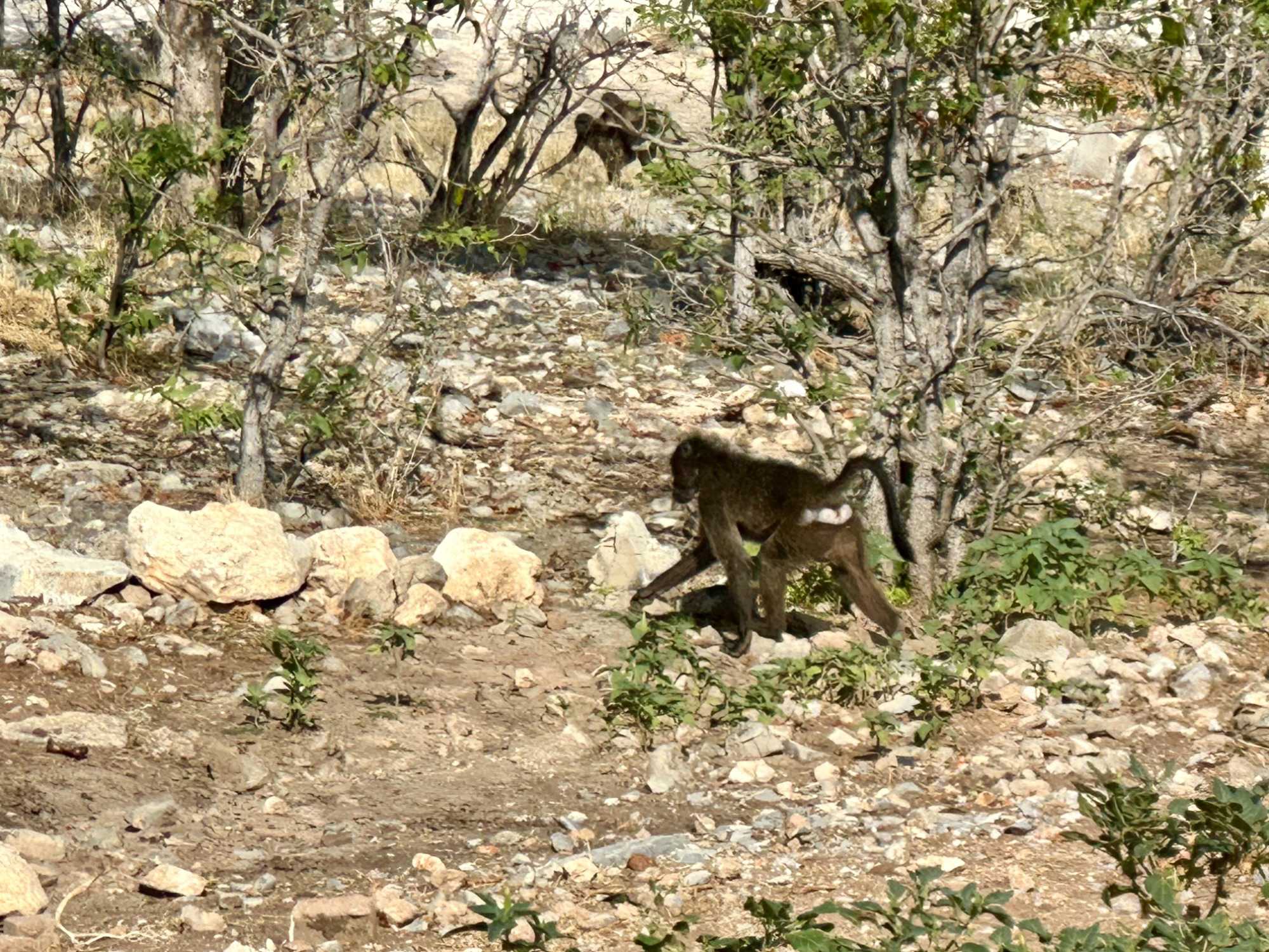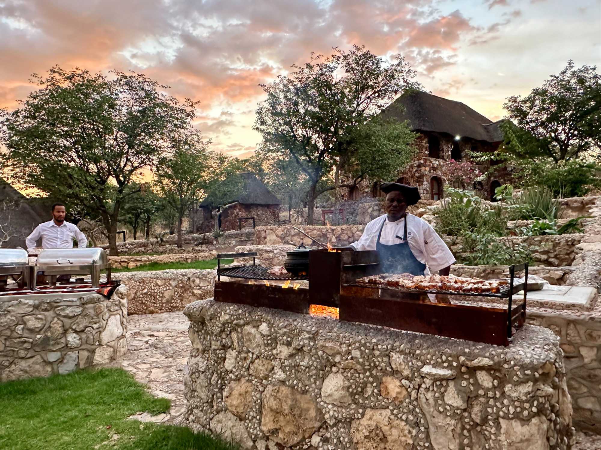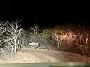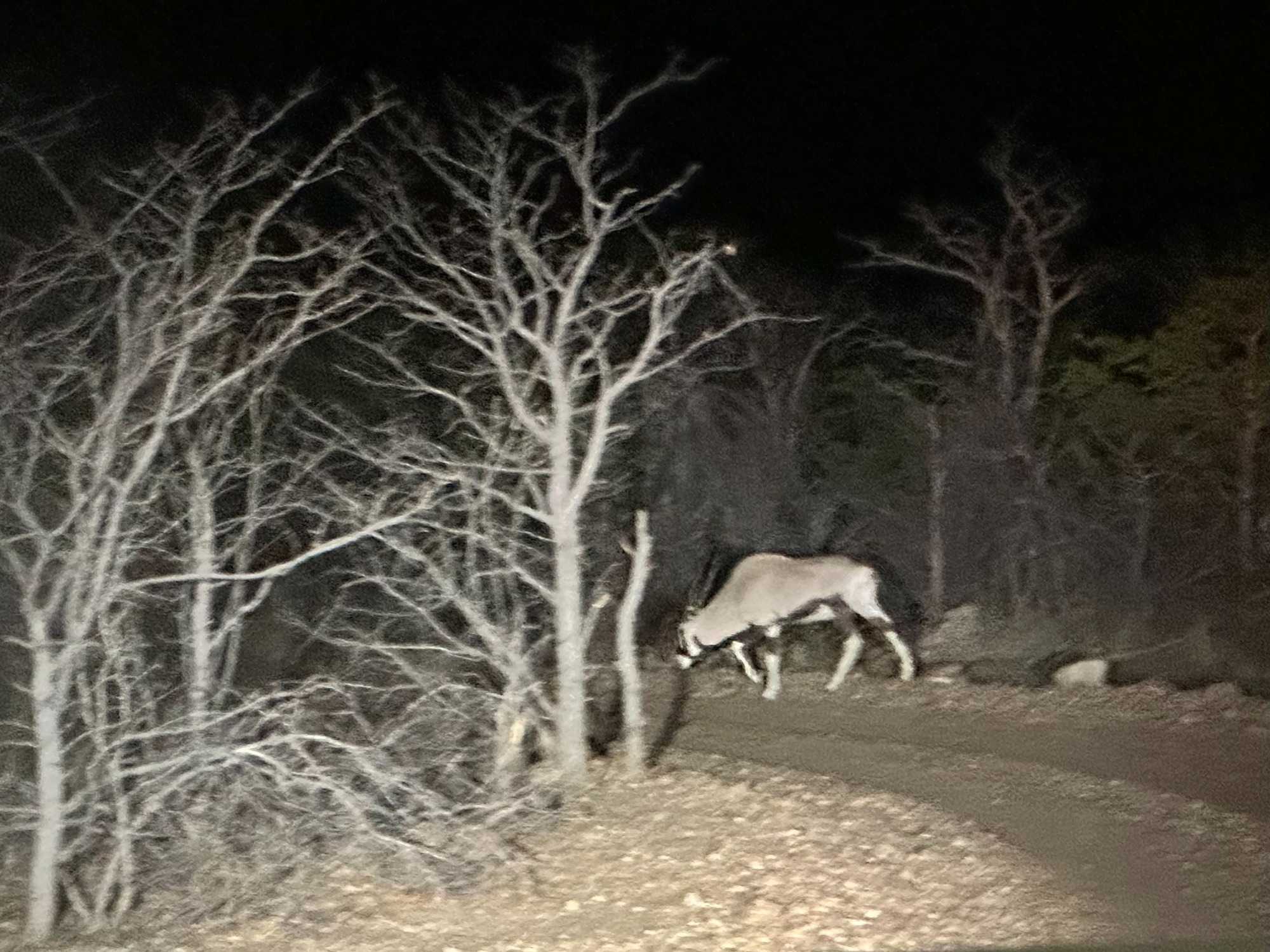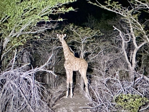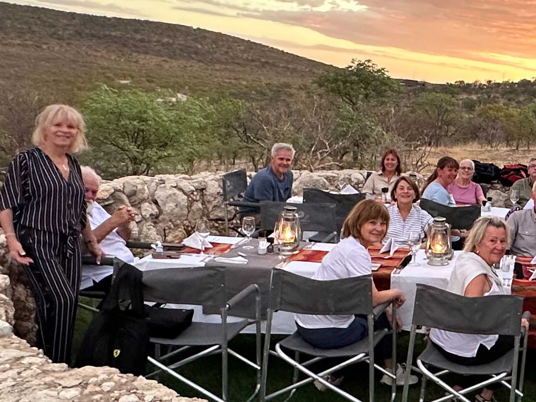 Aujourd'hui, la journée est libre pour nous permettre de nous reposer et de profiter des installations du lodge. Pour ceux qui le désirent, l’hôtel offre des soins à son Spa, et plusieurs voyageurs se sont donnés rendez-vous avec les deux masseuses qui ont été très appréciées. Le top de la journée fût la photo prise par Sylvain de Lucie et deux autres voyageuses dans la piscine qui ont eu la visite d’une majestueuse girafe. La photo est superbe et que dire de la surprise que cette jolie girafe leur a fait en approchant la piscine de si près. Dans la journée quelques babouins sont aussi venus rendre visite à certaines tentes et Marcel les a photographiés pour moi. Il fait chaud mais c’est une température sèche sans humidité heureusement. Si nous ne sommes pas dans la piscine nous sommes à l’ombre sans aucune discussion. C’était parfait d’avoir cette journée de détente avant d’entreprendre notre autre partie du voyage. Plusieurs ont récupéré les heures de sommeil manquantes et on fait du ménage dans leur photo et leur valise. Pour ce soir notre lodge nous avait organisé un BBQ sur la terrasse extérieure avec en arrière-plan un super coucher de soleil. C’était super de se retrouver et de partager ce beau moment tous ensemble. La joie de vivre de mes voyageurs est palpables et on sent la belle énergie qui nous habite. Après le BBQ nous avions rendez-vous avec des jeeps pour un safari de soir. C’est aussi intéressant de pouvoir découvrir la vie nocturne des animaux. Nos guides nous parlent des animaux de la réserve et ils sont deux à tenter de nous éclairer les animaux qui pourraient être présents pour nous sur notre chemin. Nous avons eu de la chance de voir, un oryx, une belle girafe, notre chauffeur a vu un tapir celui qui est un animal nocturne sans défense qui se nourrit de termites. Notre chauffeur et pisteur sont incroyables et voient des toutes petites choses en circulant et conduisant. Ils ont même pointé deux tourterelles et aussi une maison d’araignées et oui des petites choses que nous n’aurions jamais vu sans leur aide. Un beau tour de jeep en pleine soirée accompagné par la brise légère et une température exceptionnelle. Quelle belle soirée et surtout une belle balade sous la presque pleine lune qui approche.
