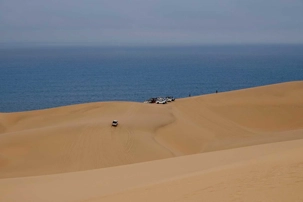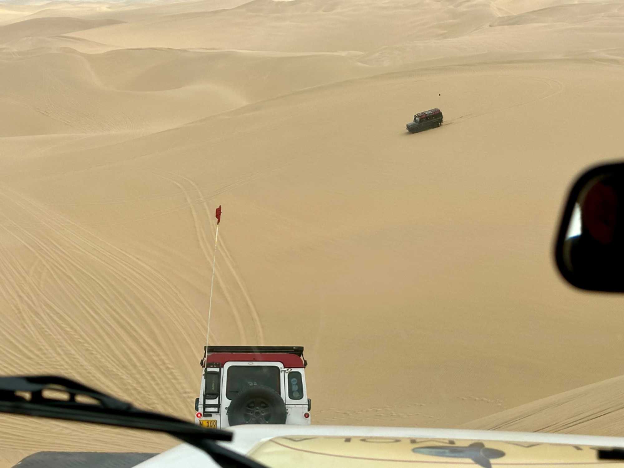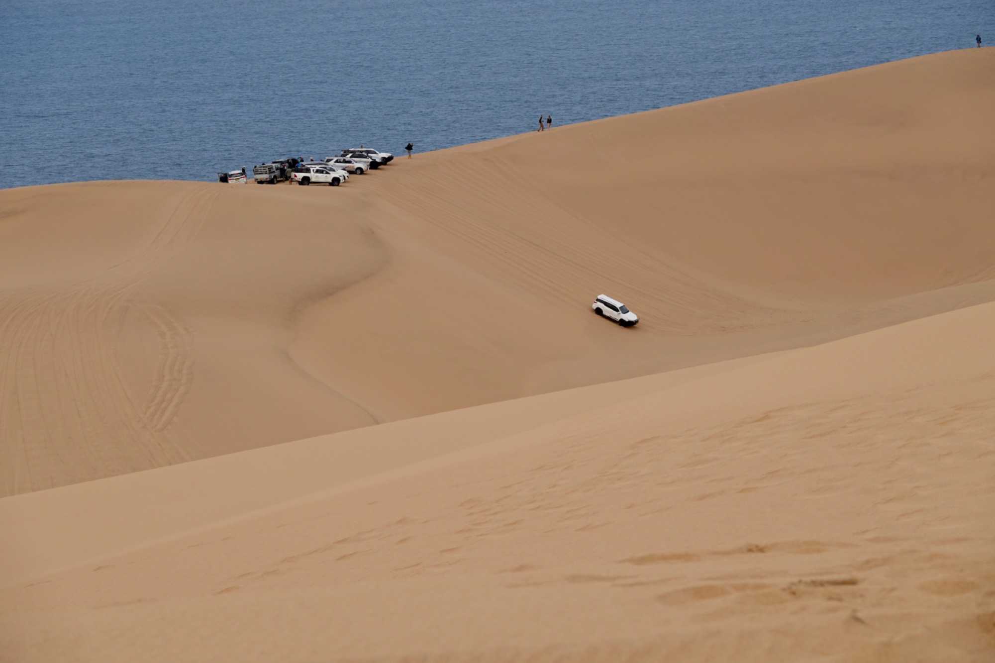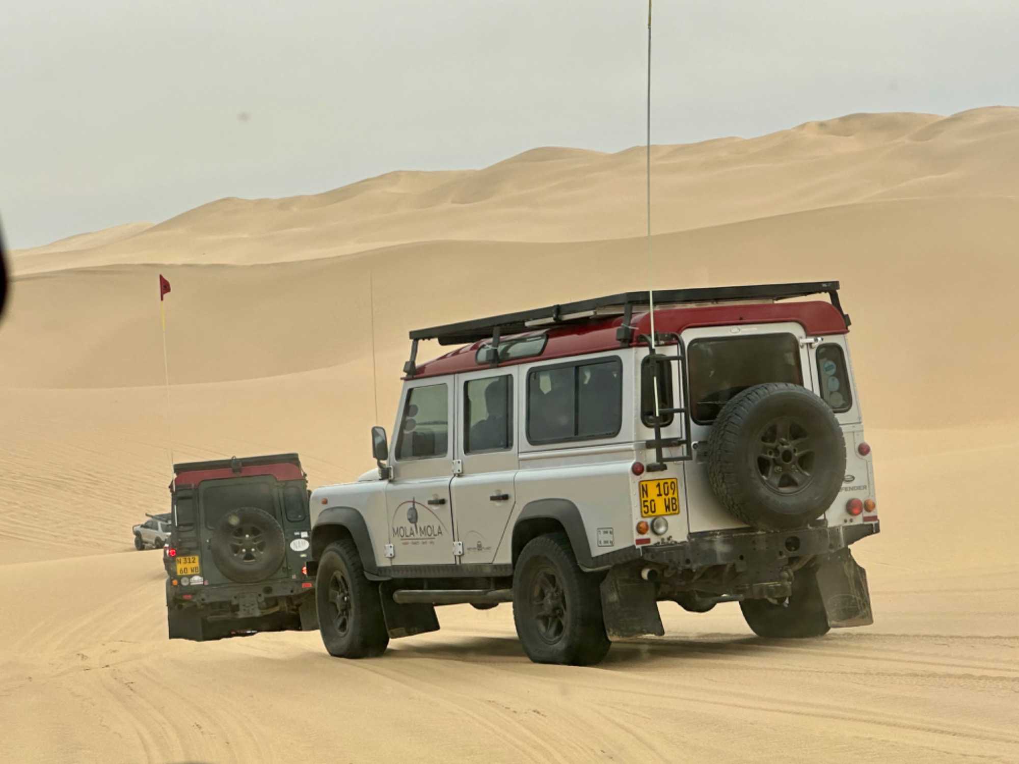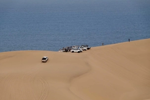 Maintenant venu le temps de s’arrêter pour prendre des photos des dunes et de la mer. Comme c’est beau! Par la suite nous nous installons à nouveau dans nos jeeps avec notre équipe de chauffeur d’expérience pour débuter la balade dans les dunes. Impressionnants, fascinants, amusants et surtout spectaculaire! Notre jeep valse dans ce sable fin et nous donne de belles sensations fortes. Après ce passage notre chauffeur s’arrête avec tous ses comparses pour installer le petit-déjeuner sur le sommet de la plus haute dune qui nous donne le paysage le plus spectaculaire sur l’océan et les dunes. Les dunes de la Namibie sont les plus hautes dunes au monde qui suivent la mer et en deuxième ce sont celles du Maroc. Comme c’est beau, nous en profitons pour immortaliser ce moment tandis que nos chauffeurs s’affairent à installer les tables et nous servir le champagne. Que demander de plus plus?