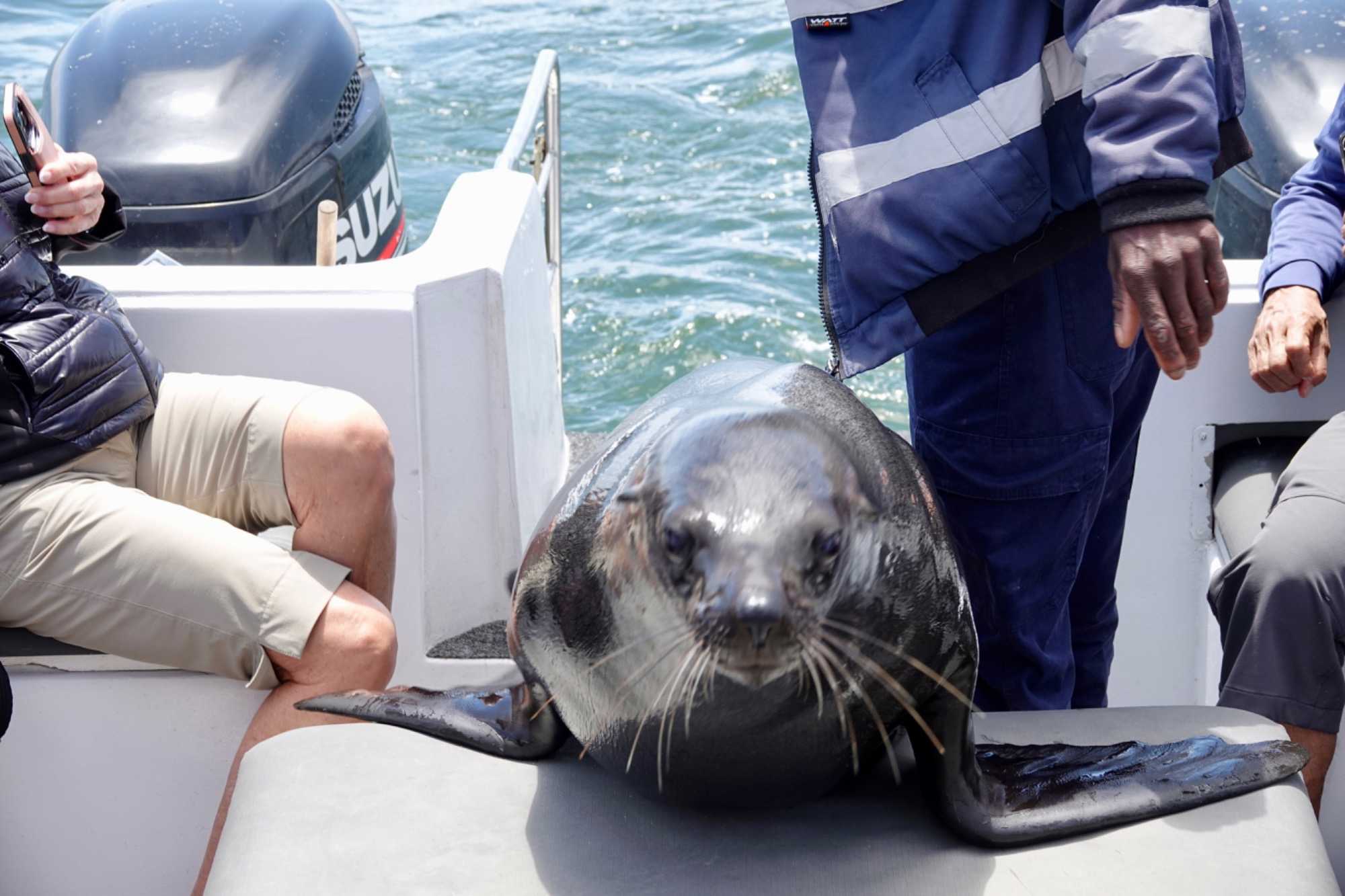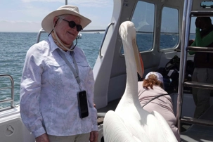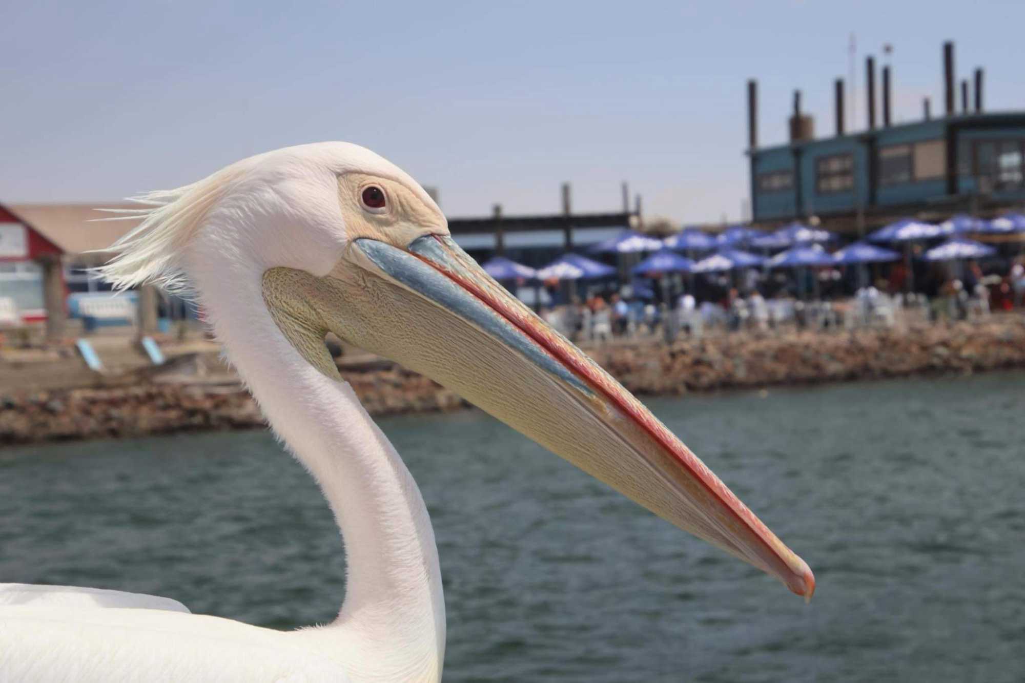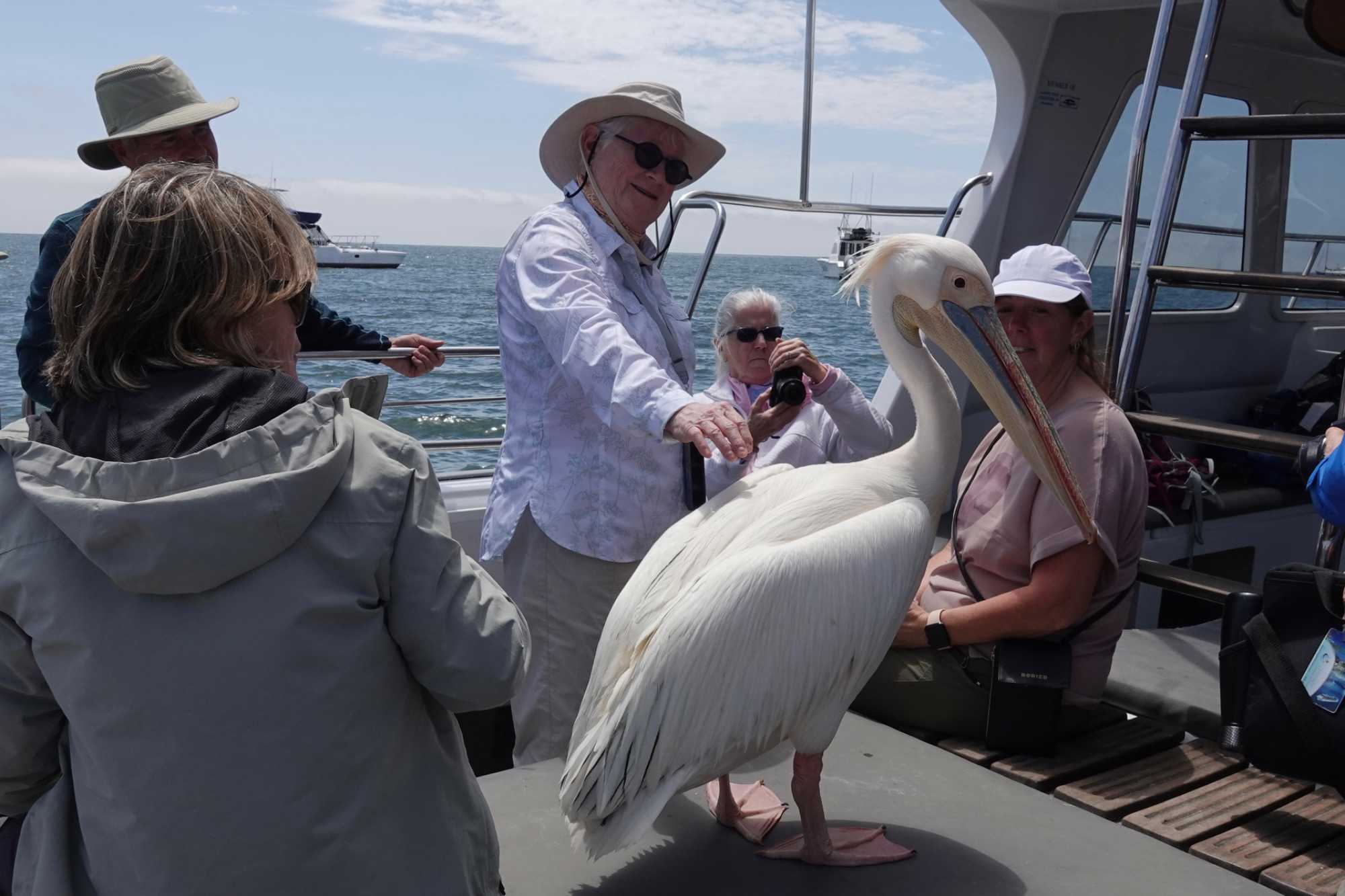 Nos charmants hôtes à bord sont prêts à nous faire aimer leur coin de pays et surtout nous faire découvrir leurs amis pélicans et otaries. Que ne fût pas notre surprise de voir une jolie otarie suivre le navire et demander d’ouvrir la porte pour monter à bord bien que le navire roulât à une bonne vitesse. Surprise pour tous bien entendus, de la voir pas farouche du tout et qui demande sa récompense. Après s’est laissée gâter par un des matelots elle se laissait prendre en photo. Ginette notre grande passionnée d’animaux était très émotive et l’otarie lui a même fait un câlin. Un moment bien spécial pour notre amoureuse de la nature. Un peu plus loin ce fût le vol d’un pélican qui a atterrit sur le bateau, encore un wow et cela nous amuse beaucoup. Les photos parleront d’elles-mêmes. Notre retour s’est fait à nouveau à Walvis Bay, qui signifie « la baie des baleines », est anciennement un territoire sud-africain et actuellement une municipalité de Namibie située à trente kilomètres au sud de la station balnéaire de Swakopmund sur la côte atlantique. Le site de Walvis Bay est stratégique pour le commerce maritime, car il s'agit du seul lieu pouvant accueillir un port en eau profonde le long de la côte Atlantique de la Namibie. C'est pourquoi elle constitua longtemps une enclave abritant un comptoir britannique, puis un territoire sud-africain au milieu d'une colonie allemande, lui-même devenu territoire sous mandat sud- africain. Il n'a été rétrocédé à la Namibie qu'en 1994 soit 4 années après la fin de l'administration de celle-ci par l'Afrique du Sud.