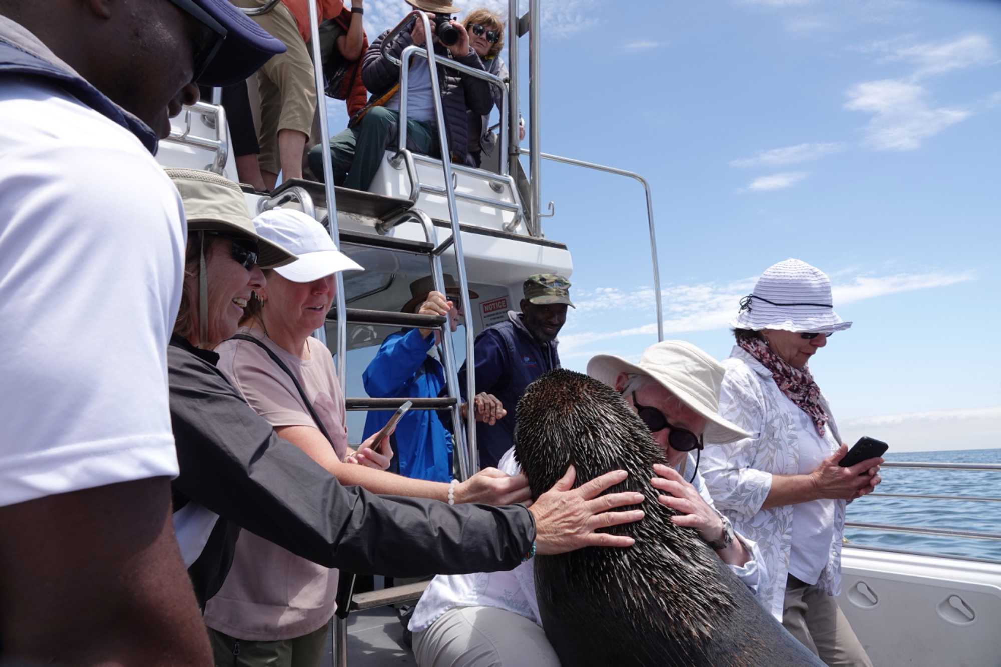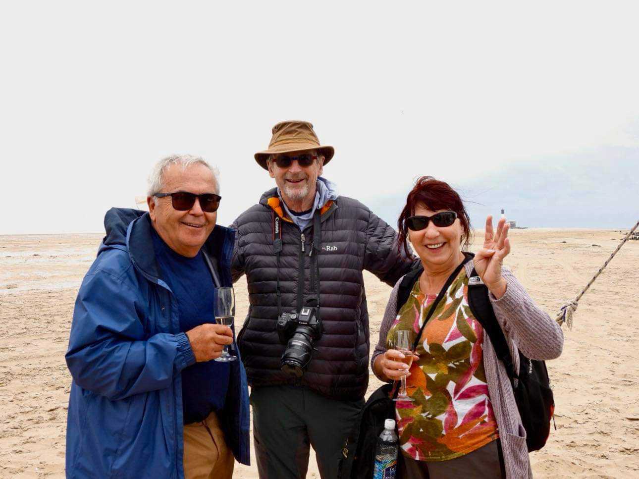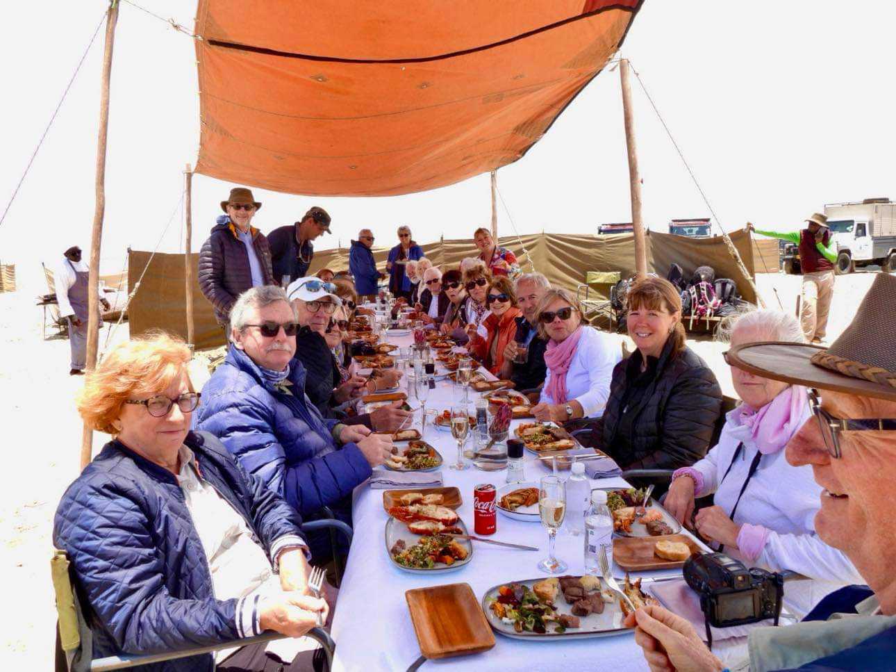 Nous rejoignons le bord de mer et nous nous engageons sur la plage pour revenir vers notre prochain arrêt pour le lunch. Nous apercevons au loin une tente seule au monde et en arrière-plan une colonie d’otaries à fourrure. Paysage bucolique et personne ne se doute que cette tente a été installée juste pour nous. Oui, nos hôtes nous attendent pour nous faire partager un moment de bonheur. Un repas chaud digne des excellents restaurants servis avec la vue sur la mer et les otaries. Du champagne à nouveau et des huîtres nous attendaient pour débuter le repas. Comme c’est sublime de pouvoir vivre ces plaisirs de la vie. C’est pour ces moments d’exceptions que je continue de faire le plus beau métier du monde, celui d’accompagnatrice. Eh oui, je suis encore passionnée de faire vivre à mes voyageurs des moments comme celui-ci!