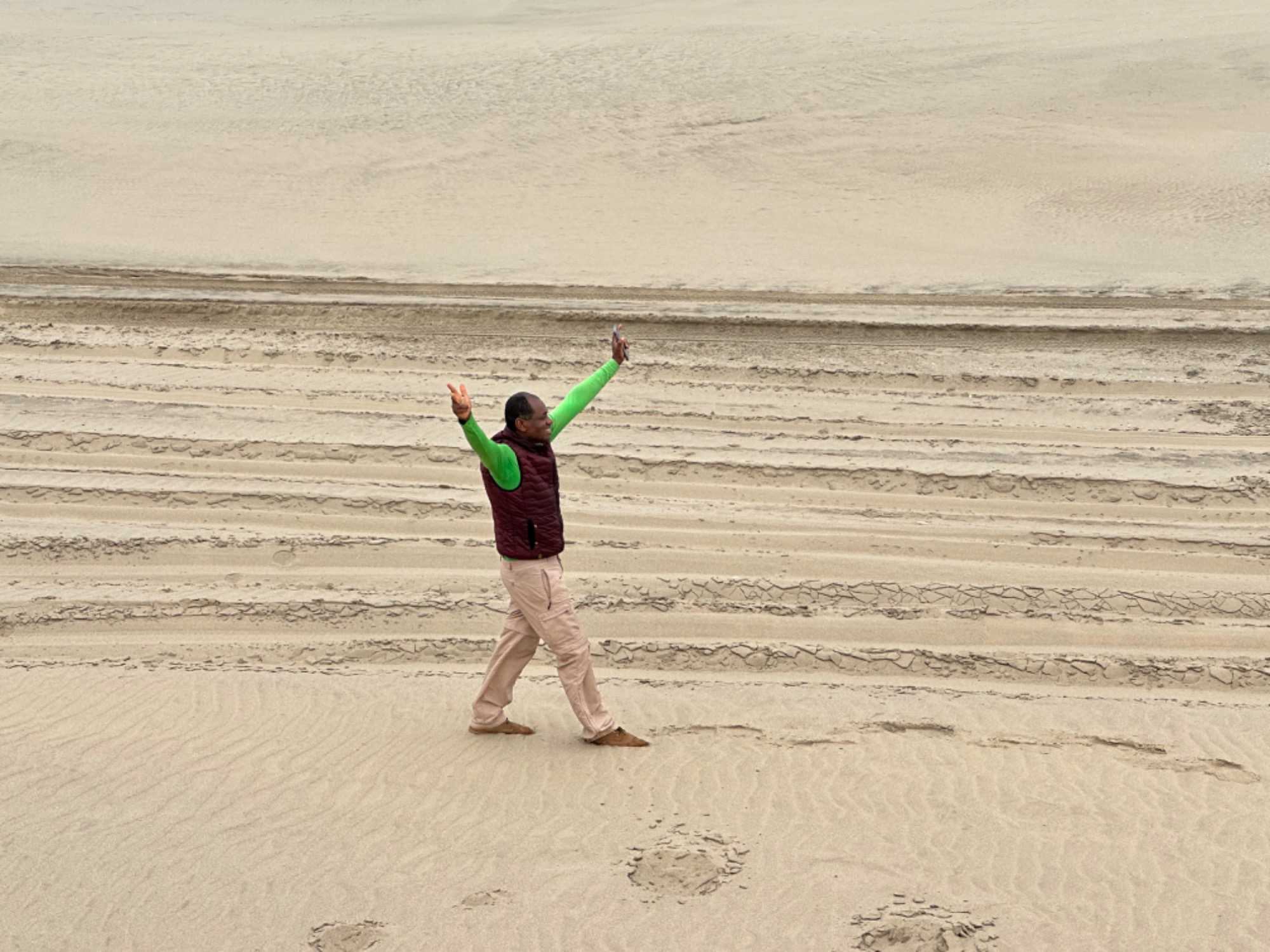 Nous en profitons pour faire une superbe photo de groupe dans les dunes. Un délicieux café accompagné de biscuits nous sont servis durant notre pause et on se dégourdis avant de repartir pour continuer la balade sensationnelle dans les dunes. Que du bonheur! Plusieurs belles descentes sont immortalisées sur nos photos et on s’émerveille devant ce paysage unique.