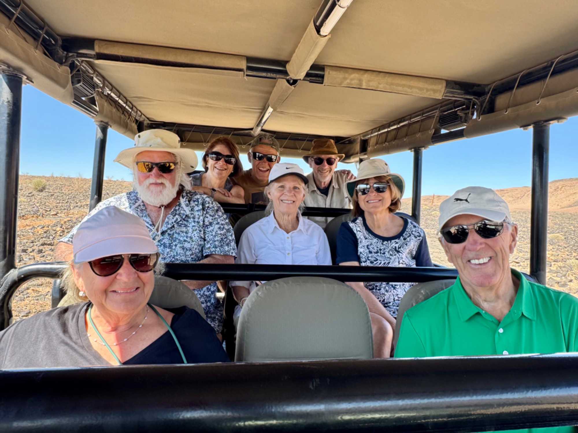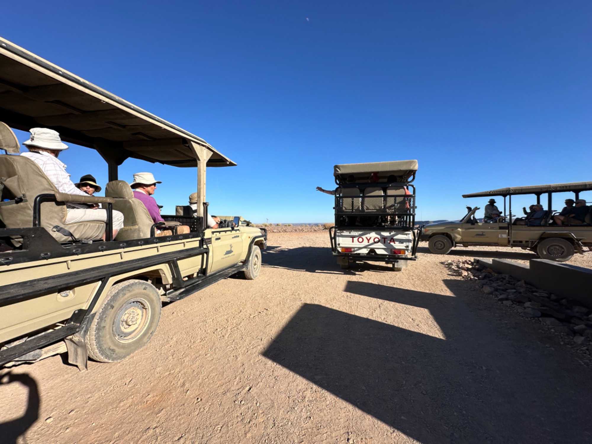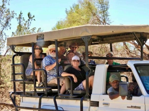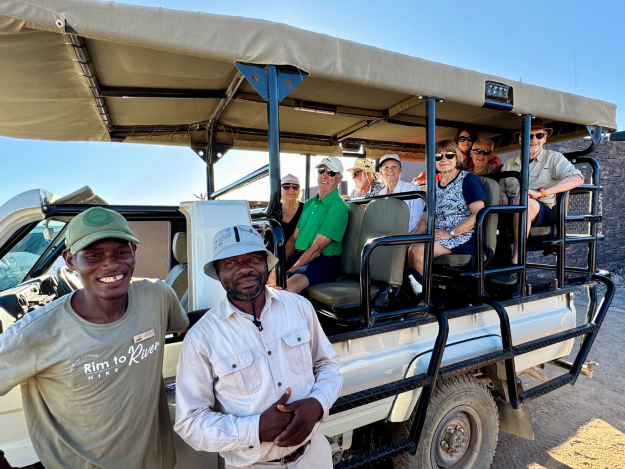 Il fait un beau soleil et ce n’est pas trop chaud lors de notre départ matinal. Nous sommes trois jeeps pour faire la randonnée dans le canyon. Nos trois guides-chauffeurs sont de bien bonne humeur et prêts à nous faire partager leur passion de la brousse et du canyon. Ils sont aussi bien amusants et bien renseignés sur le territoire qui nous entoure. La température est idéale et nous profitons du panorama.