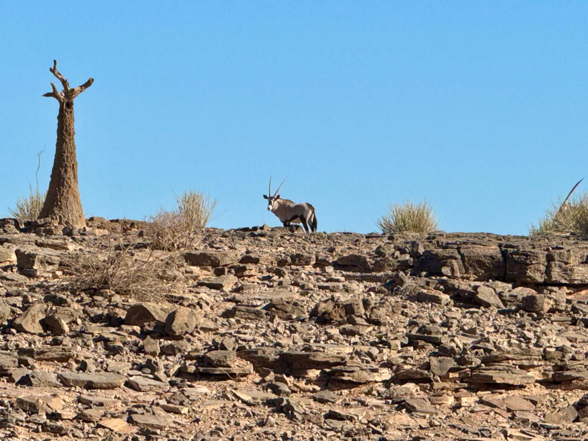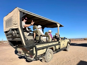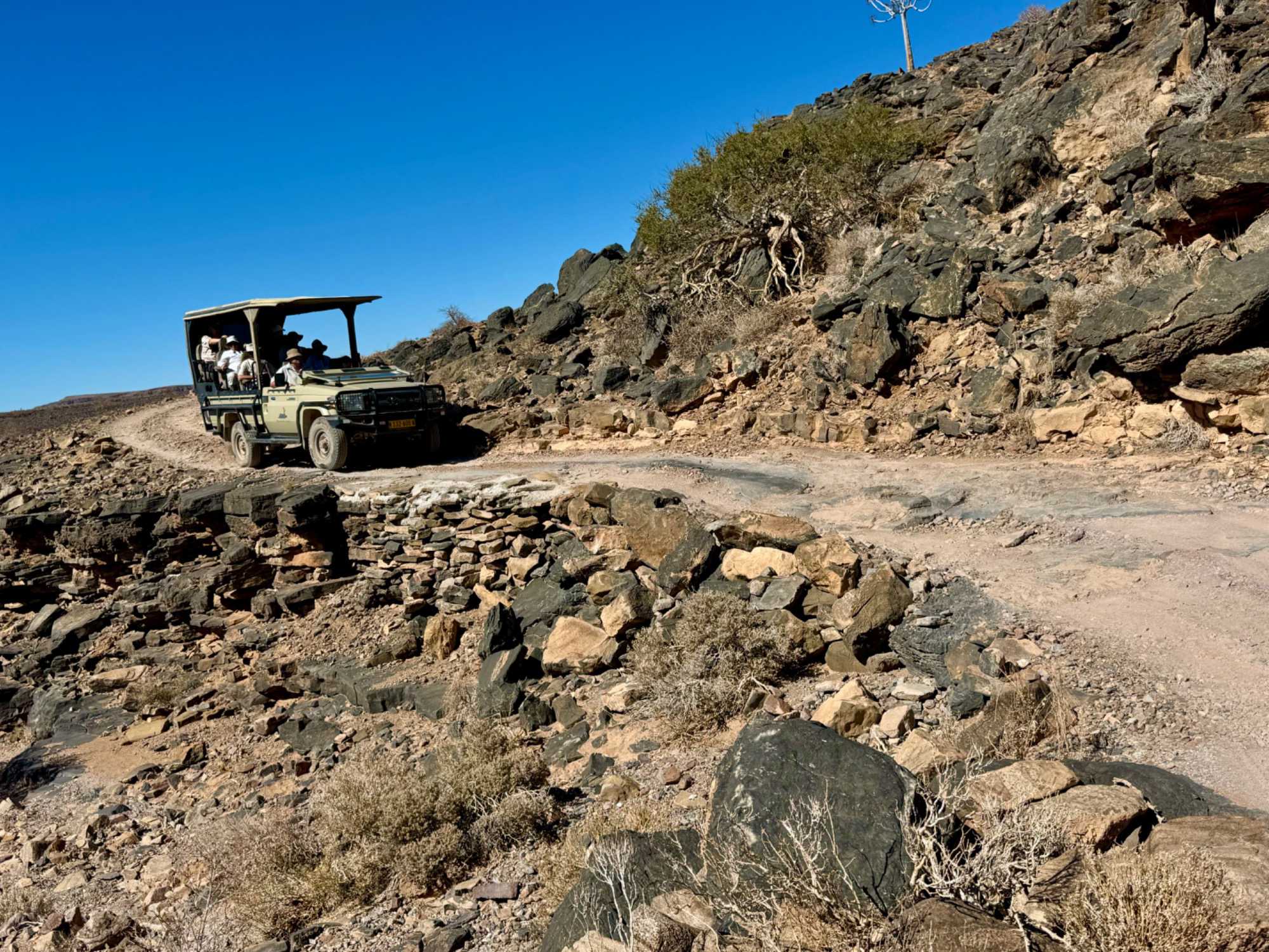 Les magnifiques arbres, surtout les carquois, nous impressionnent et sont si beaux. La route n'est, pour ainsi dire, pas très carrossable, mais nous sommes habitués au massage africain. Le chauffeur tente de prendre la meilleure route pour nous éviter le mouvement. Nous apprenons sur les arbustes qui sont empoissonnés. Nous sommes surpris, car personne ne nous l’avait dit auparavant. C’est dans la famille des euphorbes, mais celles-ci sont si on les casse et touche le lait qui s’écoule c’est un poison. Et dire qu’il y en a partout, c’est vraiment important de ne pas toucher lorsque nous ne sommes pas certains. Les aventuriers du désert doivent vraiment s’informer avant s’ils n’ont pas la chance de voyager avec un guide. On nous parle de serpents aussi et de scorpions finalement on restera dans la jeep… Non je blague, mais nous resterons sur les sentiers aménagés.