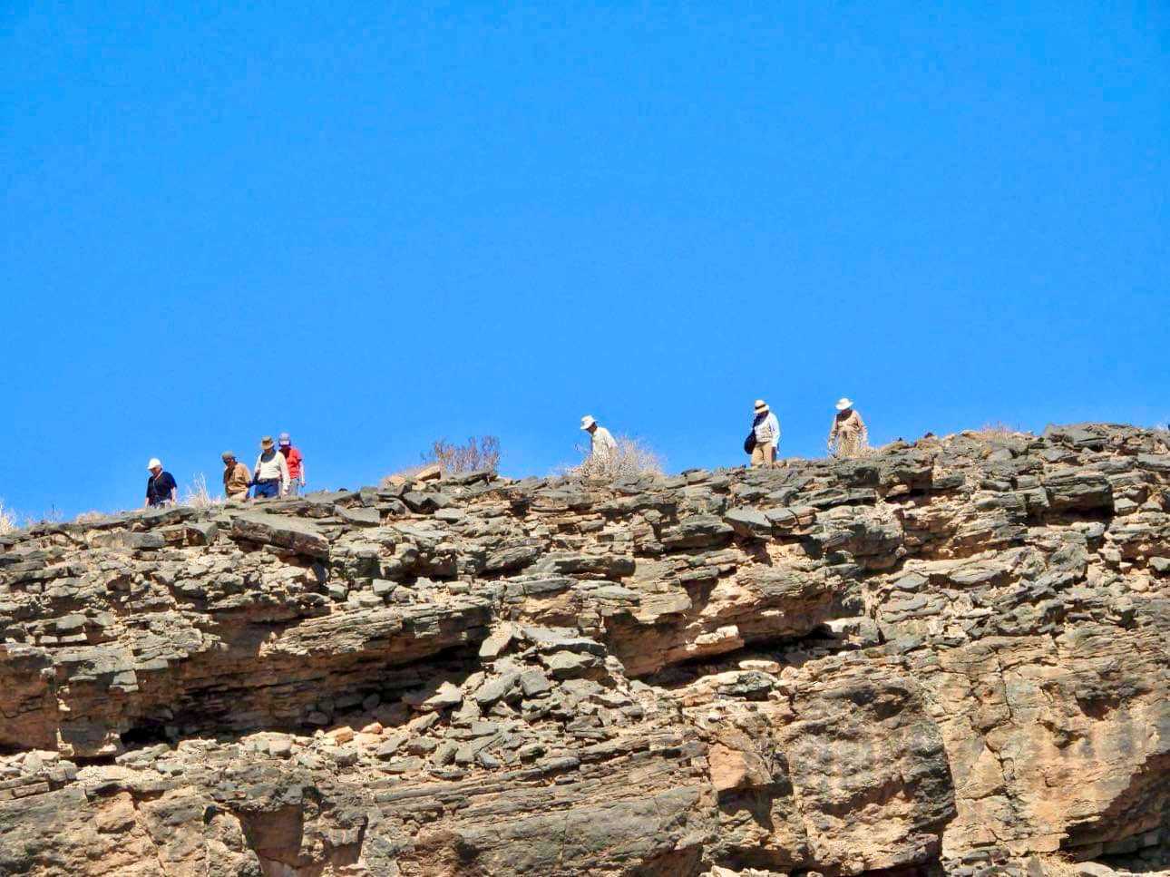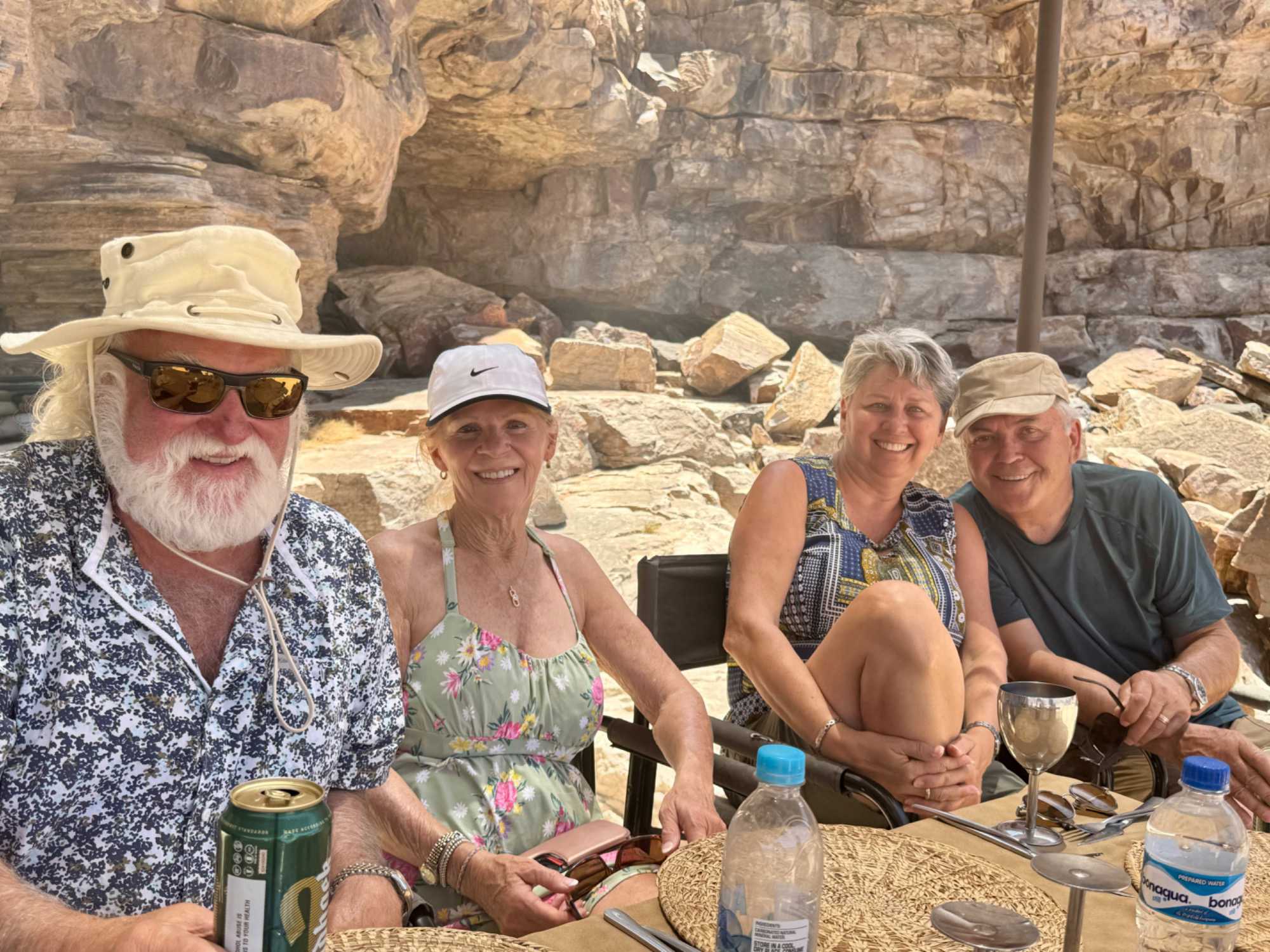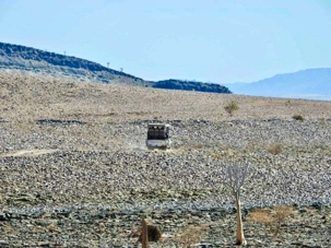 Les paysages qui se succèdent sont splendides et nous descendons tranquillement dans le canyon. Nous nous sentons vraiment seuls au monde, car notre petit lodge est le seul qui a la permission de faire cette excursion. La couleur des rochers est différente d’un secteur à l’autre et nous profitons de nos arrêts pour prendre des photos. Même si les paysages sont si désertiques nous sommes toujours impressionnés par les couleurs qui s’en détachent. Notre première pente a un degré assez accentué de descente et nous tenons bien les barres, car on se fait un peu brasser. Plusieurs rient et d’autres étudient la descente. Heureux d’être arrivés en bas, nous continuons notre escapade jusqu’au beau point de vue où nous avons fait des photos. Notre jeep repart pour continuer la descente, la conduite est assez sportive, mais tous rigolent enfin presque tous…. Finalement arrivés tout en bas nous allons vers notre dernier point de vue pour voir une petite source d’eau. Quelques clics de photos et nous nous rendons à l’endroit prévu pour un petit pique-nique style BBQ.