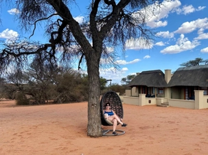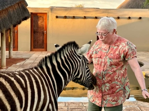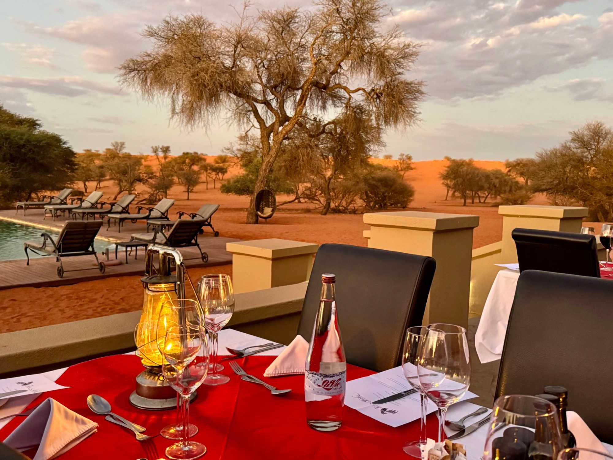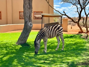 Arrivée au lodge Intu Africa Zébra Lodge et installation pour les deux prochaines nuits. J’éprouve un réel plaisir à choisir mes lieux d’hébergement et de découvrir les visages surpris voire ébahis de mes voyageurs. Moi-même à chaque fois je n’en reviens tout simplement pas. Installé parmi les dunes rouges, le Zebra Lodge offre une vue sur les plaines du Kalahari et les zones humides de l'Auob. Le lodge principal dispose d'une terrasse d'observation munie d'une jolie piscine et d'un foyer extérieur. Dès notre arrivée, nous n’en croyons pas nos yeux, un zèbre nous accueille, j’avais oublié que nous sommes au Zébra Lodge 😊