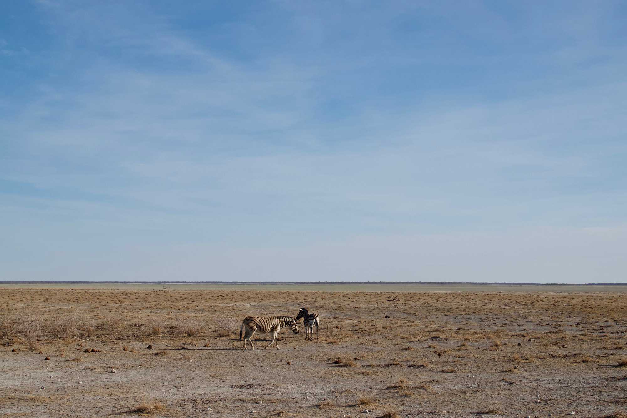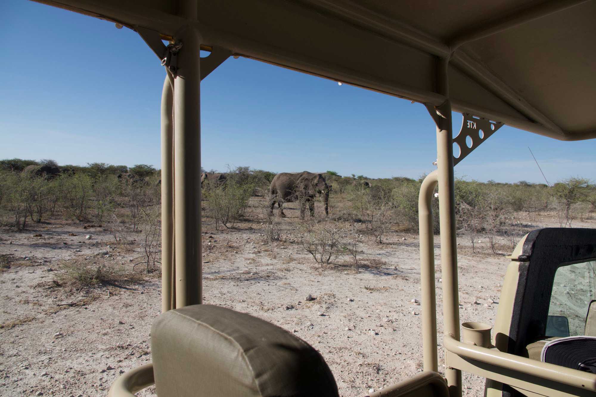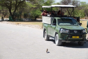 Nous quittons donc après le petit déjeuner pour notre premier safari. Comme la saison des pluies qui devait débuter en fin septembre et qui n’est pas encore arrivée, la Namibie est vraiment très sèche. Nos ranchers décident de se rendre dans le parc au lieu de retourner dans la réserve privée car le parc possède plus de plan d’eau ou nous avons beaucoup plus de chance de retrouver tous les animaux allant s’y abreuver. Je vous parlerai un peu plus du parc à la fin de mon récit de la journée. Nous quittons 6 par jeep ce qui est parfait car nous avons tout l’espace nécessaire pour profiter des safaris n’ayant pas de personne au milieu. Cela vaut le coup de prendre plus de jeeps pour faire ces safaris, des petits plus qui font toute la différence. Nous débutons la journée par plusieurs photos d’animaux qui sont souvent très près des jeeps. Nos premières petites mangoustes semblaient poser pour nous à l’entrée du par cet que dire des girafes que l’on voit en grande quantité dans le parc. Mais elles sont toujours jolies à photographier surtout quand elle nous regarde avec leurs beaux grands yeux. Le parc possède 4 des bigs five car ici il manque le buffle. Mais les 4 autres sont présents et en grande quantité. La chance de photographier des zèbres en grand nombre me comble de bonheur. J’aime tellement ces beaux animaux qui ne sont pas trop farouches et qui, souvent, s’immobilisent et nous regardent comme s’ils posaient pour un photographe.