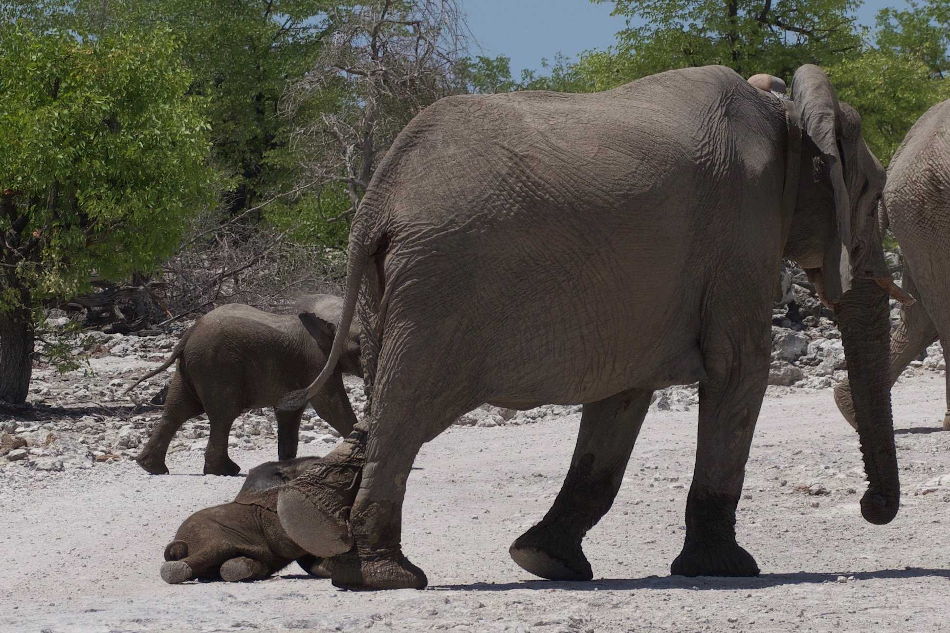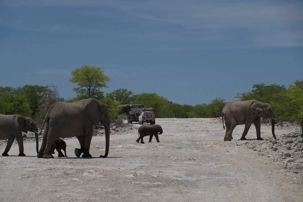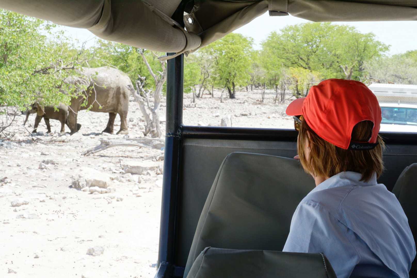 Ce matin nous débutons avec des photos des plus petites antilopes la dikdik elle est si mignonne avec ses beaux grands yeux si grands pour ce petit animal. Quelques-unes des photos sont bien amusantes avec des buissons blanchis par la poussière ce qui donne l’impression de buisson enneigé. C’est tout de même vrai que les buissons et les arbres n’ont pas reçus de pluie depuis très longtemps et que cela nous montre une facette différente de cette région désertique. Nous avons encore plein de belles photos de tous ces animaux que nous croisons et que notre rancher nous décrit très bien. Toujours intéressant d’apprendre sur la vie de ces animaux qu’eux côtoient dans leur vie quotidienne. Ils nous alimentent d’anecdotes et de détails souvent inexistants dans les livres, voici une des bonnes raisons de voyager. Nous avons terminé notre matinée avec un point d’eau que les animaux recherchent surtout en temps de sécheresse. Quand nous sommes arrivés c’était le moment pile ou un grand troupeau d’éléphants s’y désaltéraient, WOW WOW WOW ! nous les avons regardé jouer et se baigner. Notre regard recherchait tout le temps les éléphanteaux qui étaient superbes et amusants. Ils tentaient souvent de faire comme leur maman en les imitant. Nous sommes restés assez longtemps seulement pour les admirer. Ce sont des moments de vie que de pouvoir être présent à ce moment et qu’ils soient là.