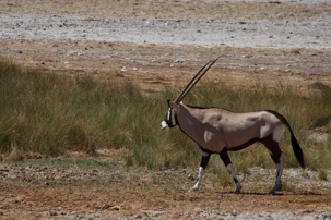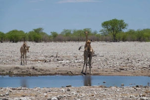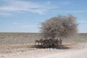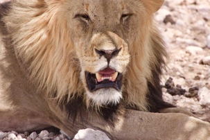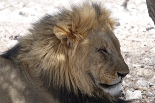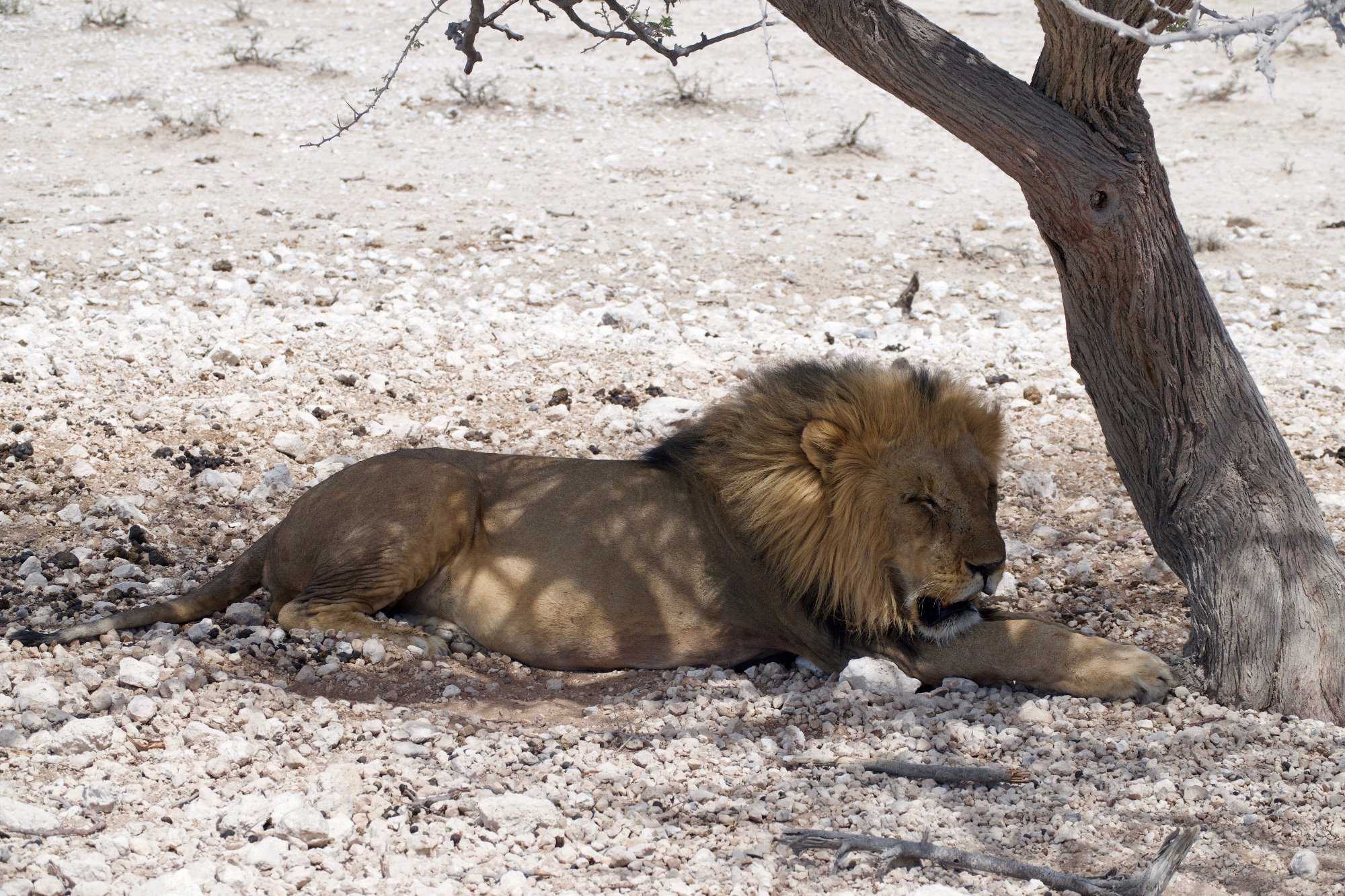 Nous continuons notre route vers le centre du parc national où nous prendrons notre lunch. La température augmente et le vent est de plus en plus chaud. Nous atteignons l’oasis du parc où l’on retrouve le restaurant de l’hôtel. Ils ont même une piscine et quelques voyageurs se baignent et profitent de la belle journée. Après le lunch nous embarquons à nouveau dans nos jeeps et nous continuons notre traversée du parc. Il nous reste la moitié à parcourir avant de sortir du parc national. Les zèbres sont nombreux et les antilopes aussi. Une de mes photos est assez représentative de la chaleur intense du soleil aujourd’hui, plusieurs petites antilopes sont à l’ombre d’un acacia toutes collées les unes sur les autres. Il faut dire que c’était le seul et unique arbre dans les environs. Juste un peu plus loin en nous dirigeant vers un point d’eau l’on apercevait un arbre encore unique dans ce paysage désertique. Nous avons aperçu au pied de l’arbre un superbe lion mâle. Il avait chaud le pauvre et il devait de venir aller au point d’eau et se reposait à l’ombre. Nous en avons profité pour prendre plusieurs photos vous vous en doutez bien.