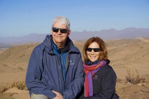 Il ne fait pas encore bien chaud mais c’est bien emmitouflés que nous quittons notre bel hôtel pour aller à la recherche de nos éléphants. Les matins dans le désert sont souvent froids mais bien habillés nous sommes confortables. Nous montons dans nos 3 jeeps conduits par des gentils ranchers. Mon Jeep est conduit par la seule femme de l’endroit, Rosie qui est vraiment très renseignée et gentille. L’on circule en tout premier lieu dans les routes non asphaltés qui laisseront la région des gros rochers autour de notre hôtel. Les paysages sont lunaires, mars, pluton, la lune on ne sait pas trop mais nous nous sommes charmés par ce décor féérique. Nous apprécions le décor et nous rencontrons quelques animaux mais les éléphants ne sont pas pour l’instant au rendez-vous. Rosie semble confiante et elle avait raison nous voici face à quelques éléphants du premier clan. Elle nous explique qu’ils sont souvent divisés en deux familles mais qu’ils se retrouvent de temps à autre tous ensemble. Nous les admirons et apprécions la chance de les avoir trouvés lors de leur lunch dans le lit de la rivière asséché. Nous nous en approchons avec délicatesse mais la proximité nous permet de les découvrir de plus près. Ce n’est pas tout: nous avons droit au spectacle de girafe oui un autre beau groupe d’au moins 7 girafes se déplacent et nous observent. Nos appareils photos sont en feu! Elles sont bien élégantes ces girafes.